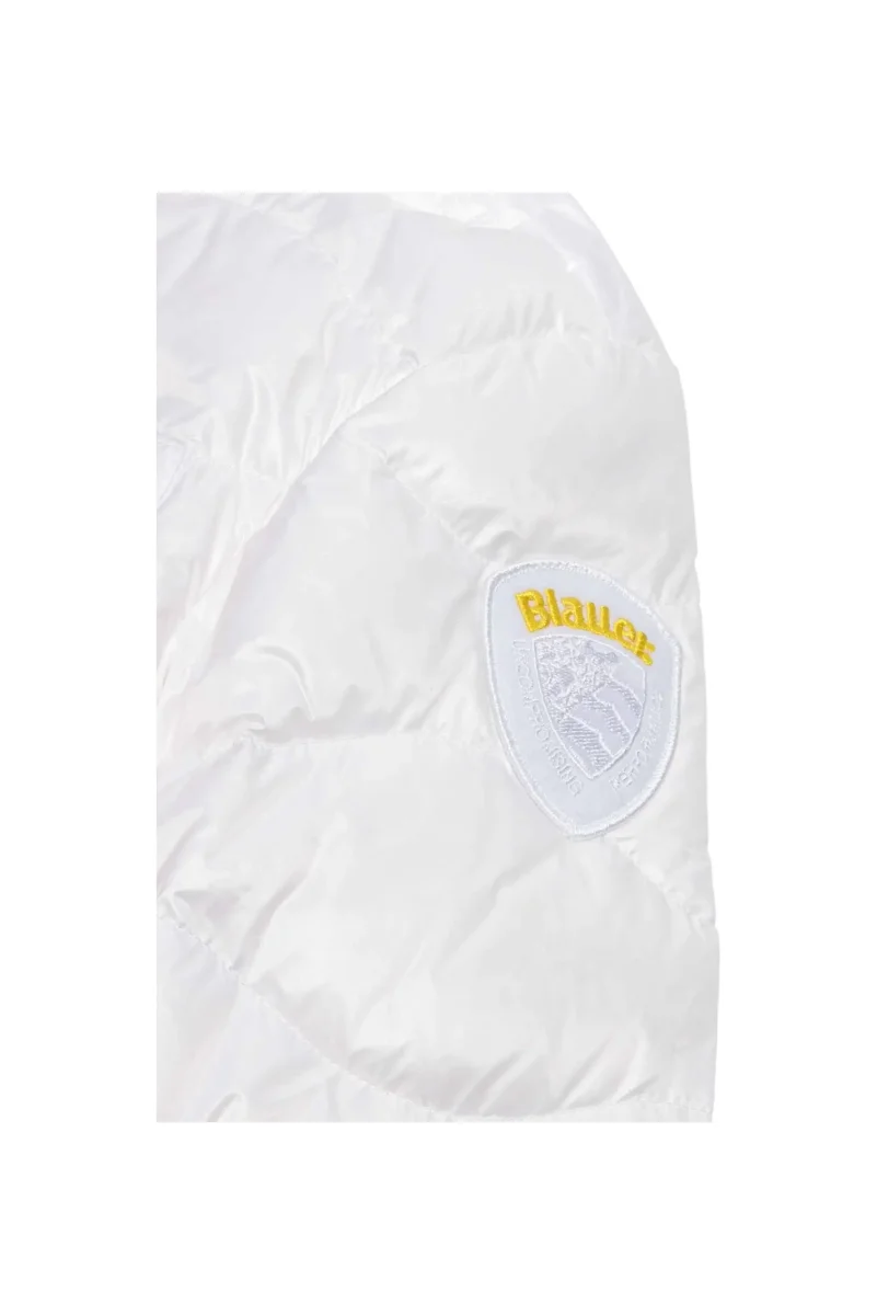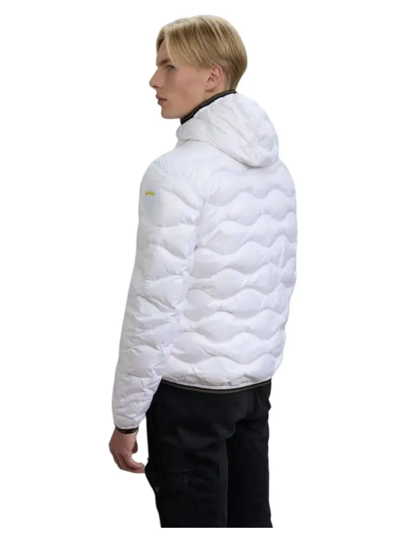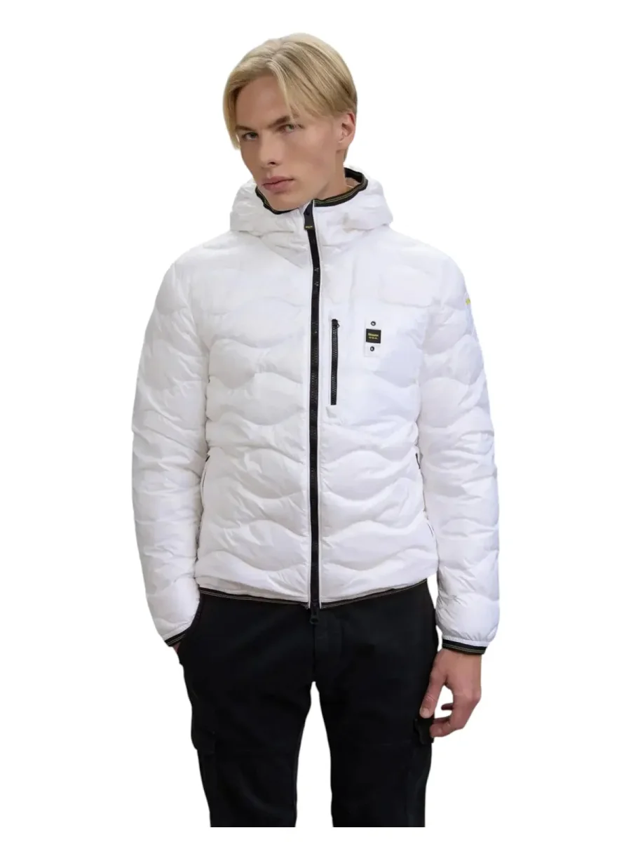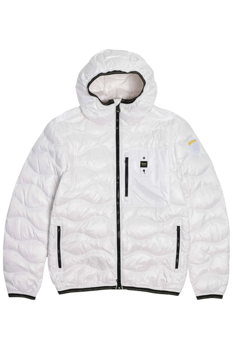 Giubbotto da uomo ad onde bianco. Imbottitura in piuma che lo rende caldo ma non ingombrante, con cappuccio, chiusura a cerniera e doppio cursore. Tasche laterali con zip e pratico taschino applicato con zip sul petto. Patch in feltro con logo Blauer color giallo a contrasto sulla manica sinistra.