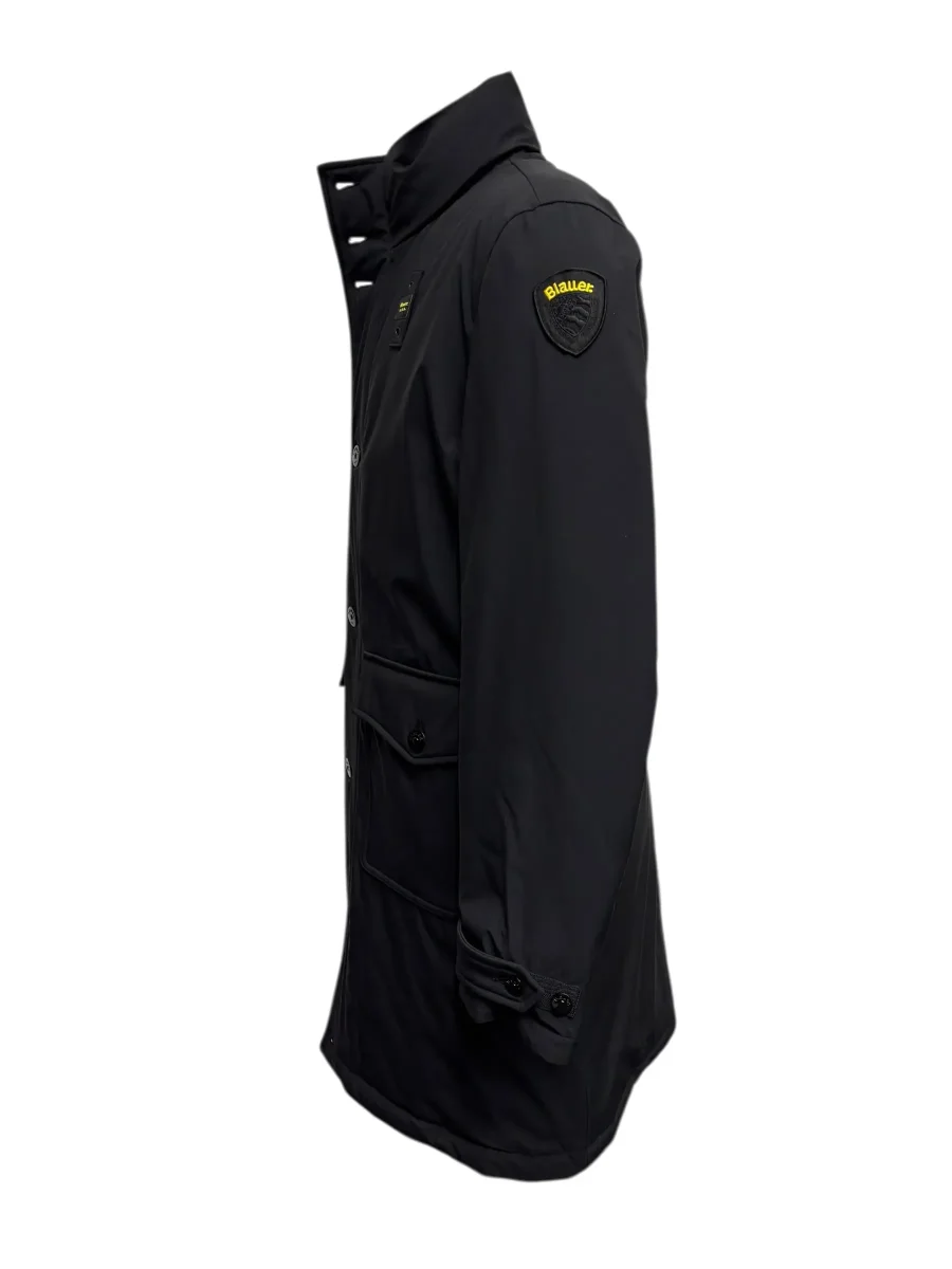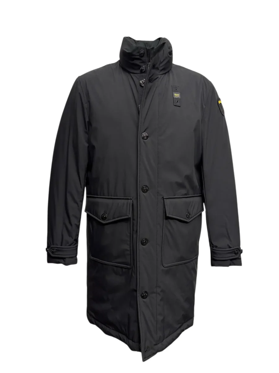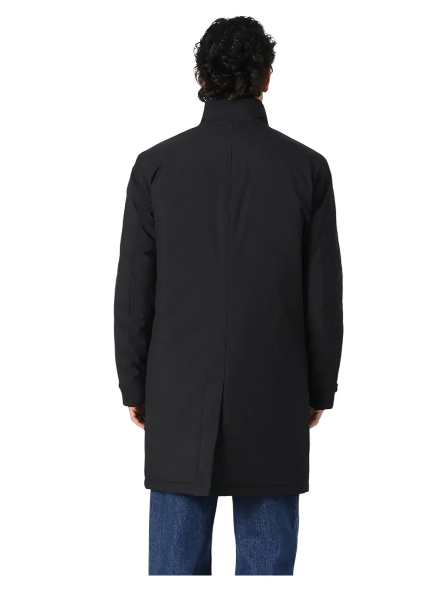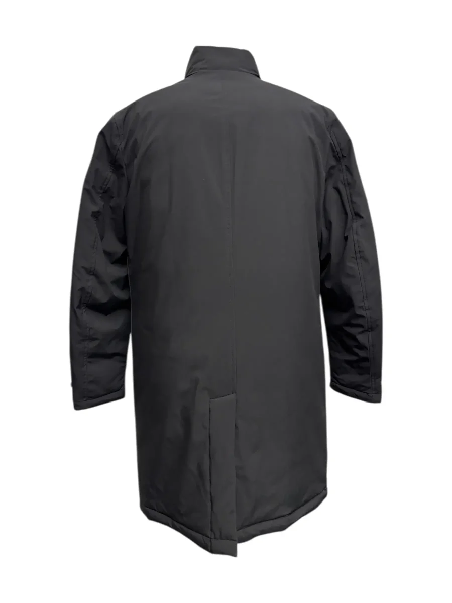 Parka da uomo nero con colletto alto. Realizzato in nylon e imbottitura in piuma, chiusura con cerniera e bottoni e doppio cursore. Polsini regolabili con bottoni e ampie tasche frontali con patta e bottone.