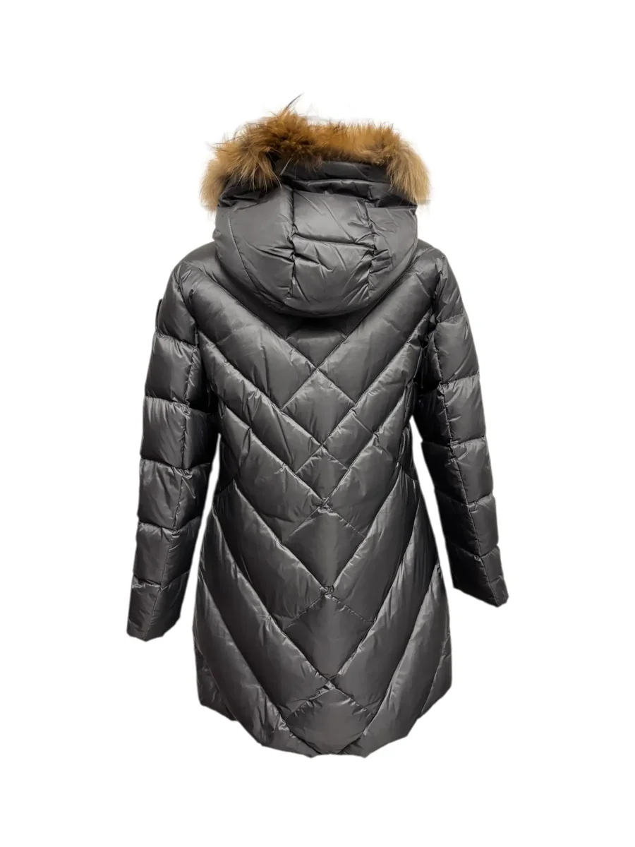 Piumino lungo antracite da donna con bordo in pelliccia. Con trapuntatura a linee geometriche, imbottito in piuma e con una linea aderente studiato per esaltare il punto vita. Cappuccio fisso con bordo in pelliccia vera removibile. Chiusura a cerniera e doppio cursore. Patch glitterata e passante con logo.