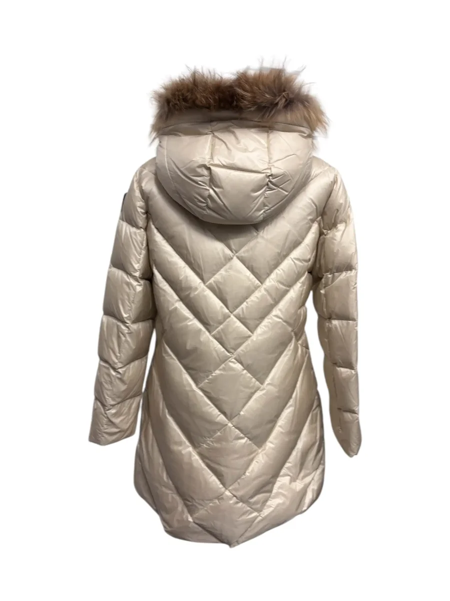 Piumino lungo panna da donna con bordo in pelliccia. Con trapuntatura a linee geometriche, imbottito in piuma e con unaย linea aderente studiato per esaltare il punto vita. Cappuccio fisso con bordo in pelliccia vera removibile. Chiusura a cerniera e doppio cursore.ย Patch glitterata e passante con logo.