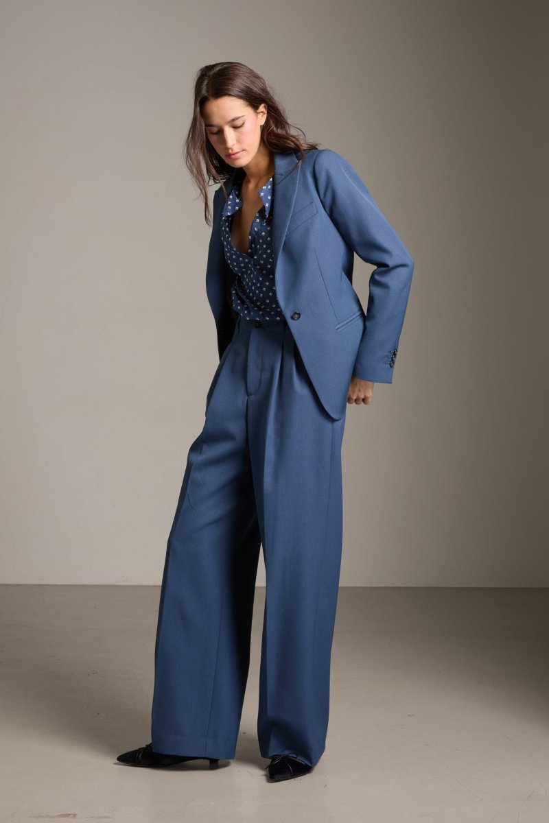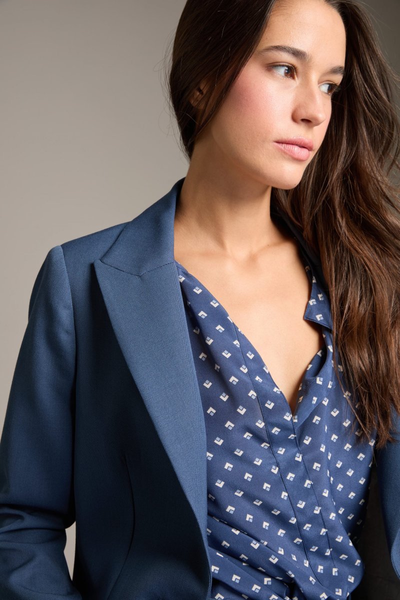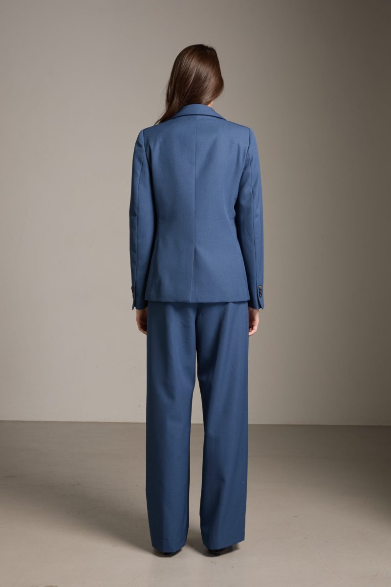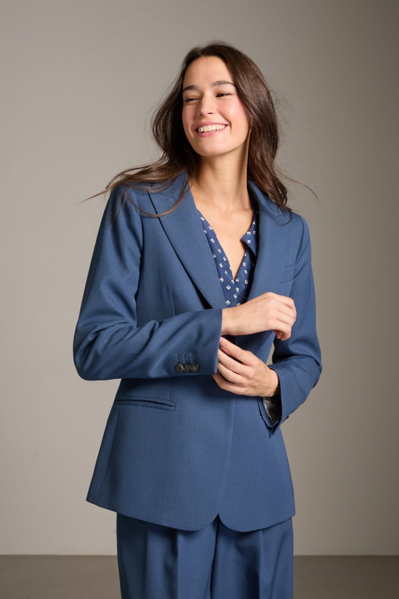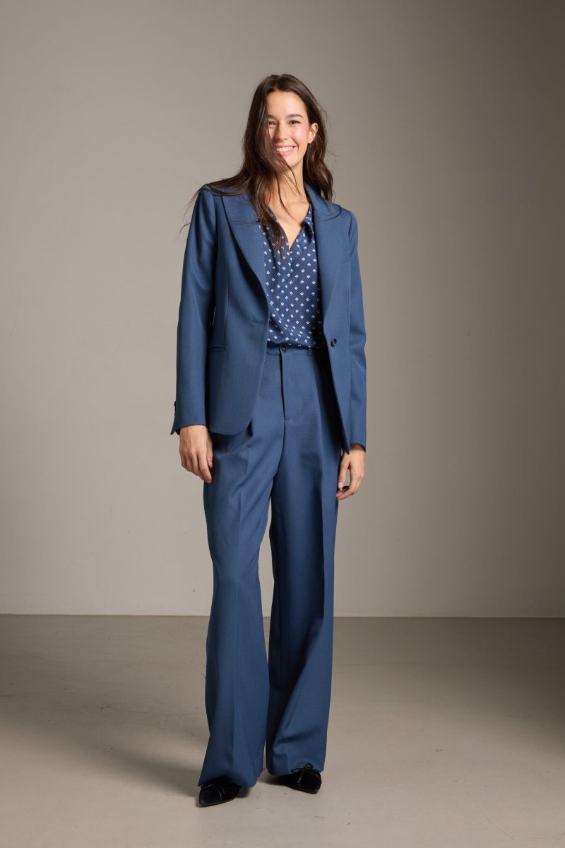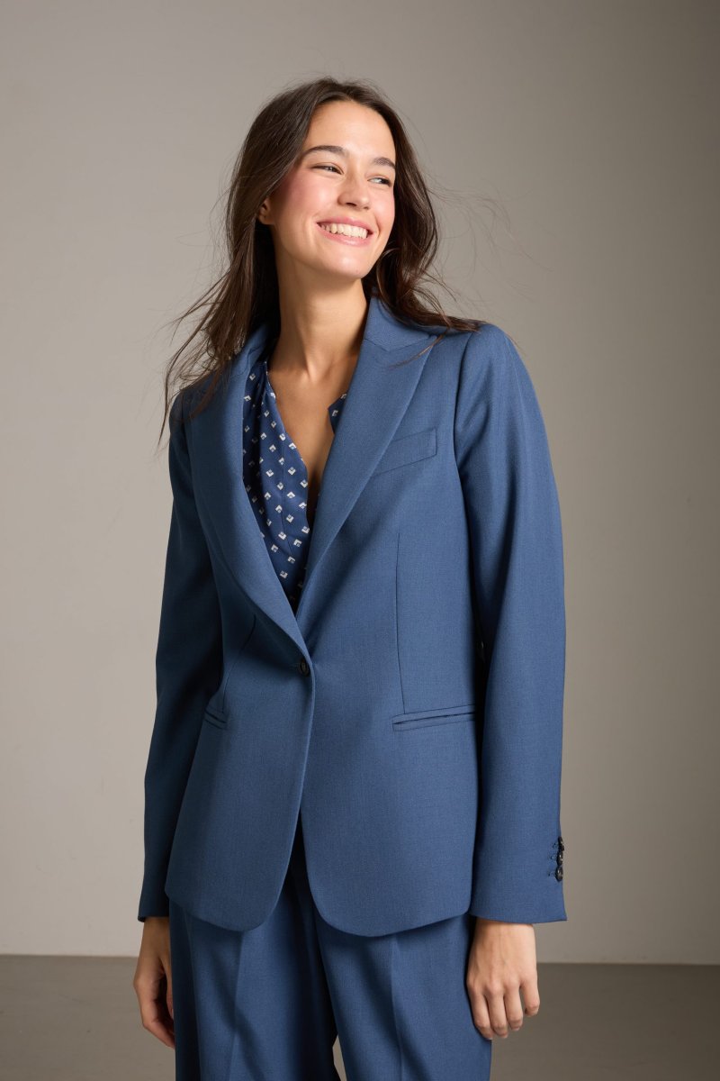 Blazer Liz di Carla Saibene, giacca monopetto in drill di lana azzurro polvere, ad un bottone dal taglio elegante e sartoriale , con ampi revers a lancia. Vedi altre varianti 100% lana Made in Italy Vestibilitร regolare: La modella indossa una taglia 40 Foderata in cotone