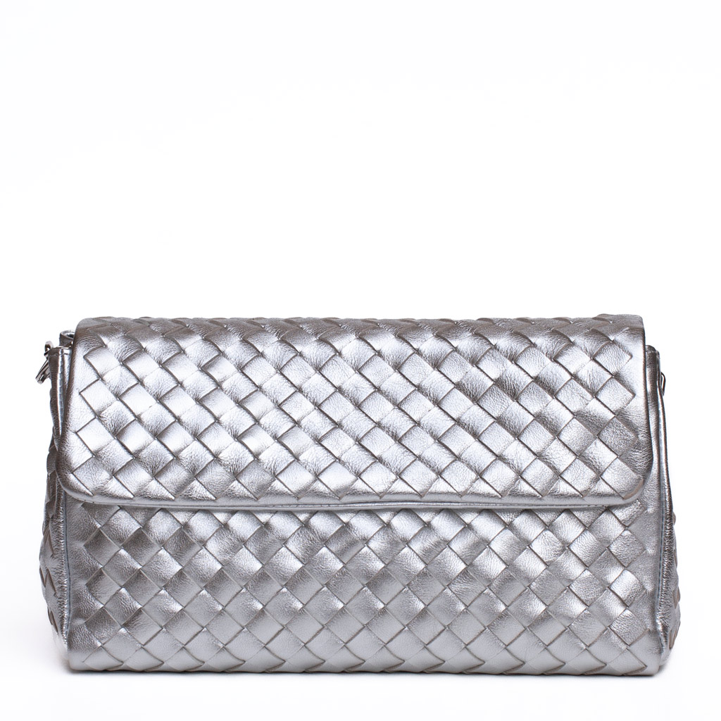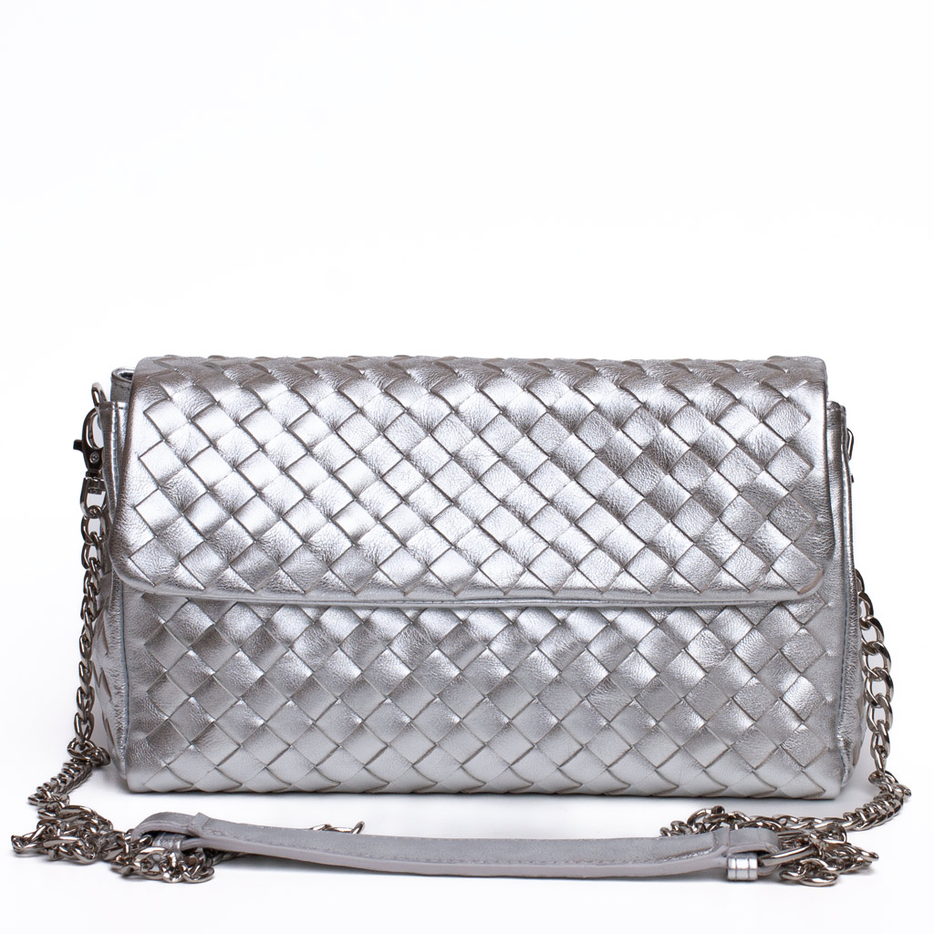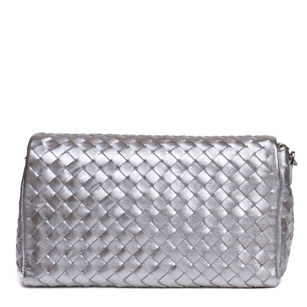 Borsa in pelle intrecciata. Chiusura con calamita. Fodera in tessuto. Misure 11 cm x 25 cm x 12 cm.ย Made in Spain.