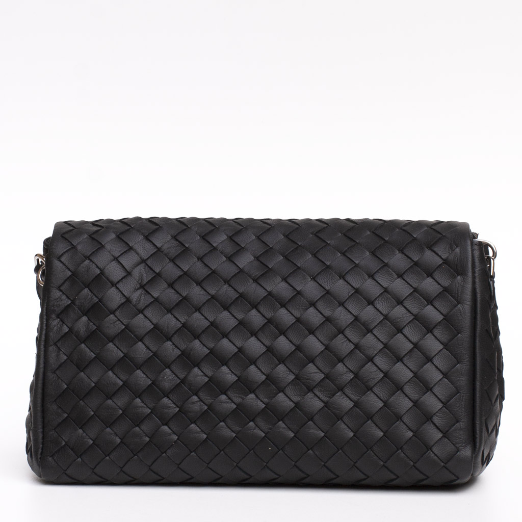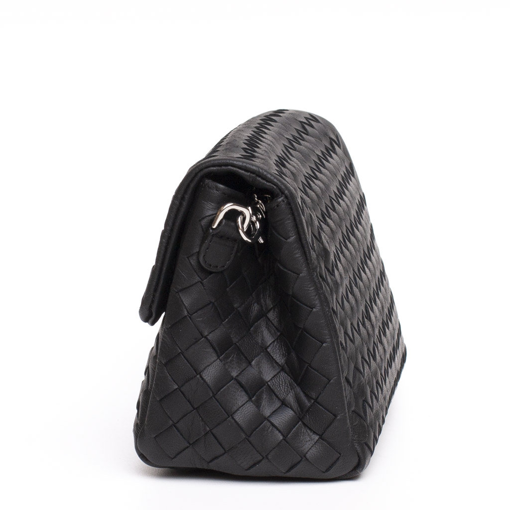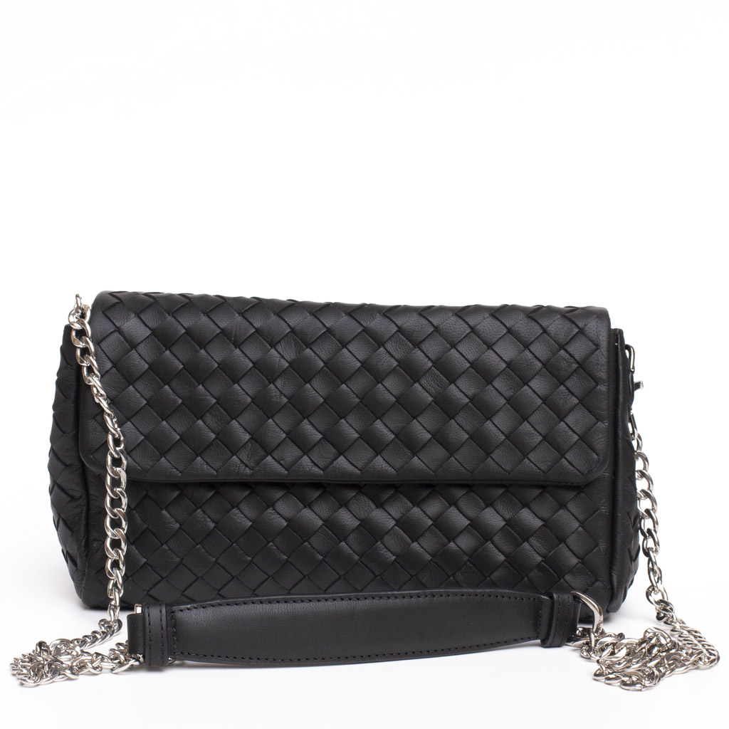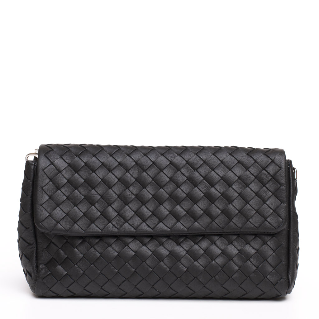 Borsa in pelle intrecciata. Chiusura con calamita. Fodera in tessuto. Misure 11 cm x 25 cm x 12 cm.ย Made in Spain.