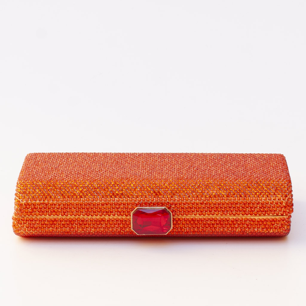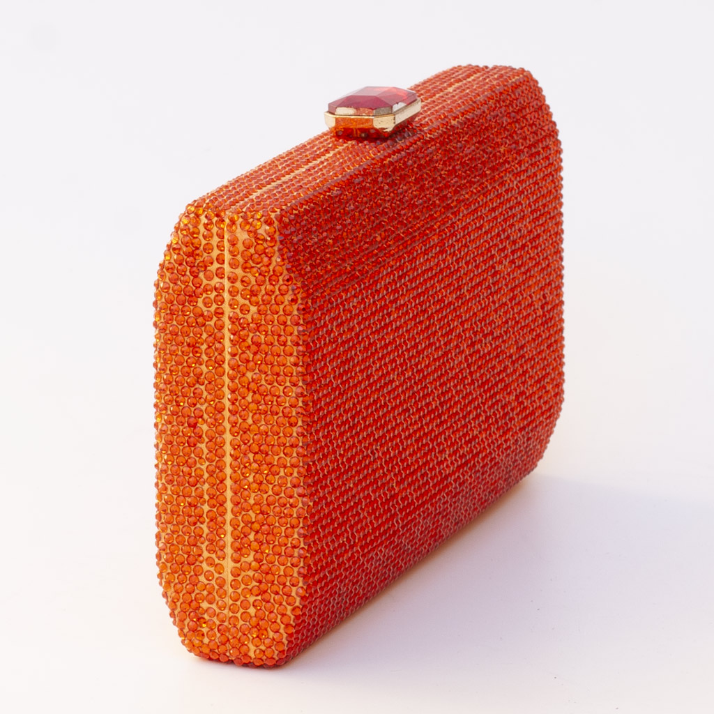 Borsa in raso e strass. Chiusura a scatto. Tracolla a catenella dorata. Misure 12 cm x 20 cm x 4 cm.