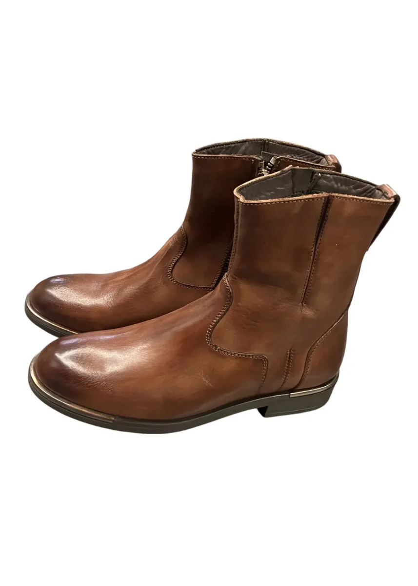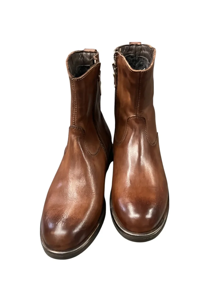 Stivaletti donna in pelle marrone tamponato con interni imbottiti in sintetico grigio scuro. Cerniera interna. Calzata regolare per a numerazione indicata. Scatola inclusa. Prezzo retail 225,00€