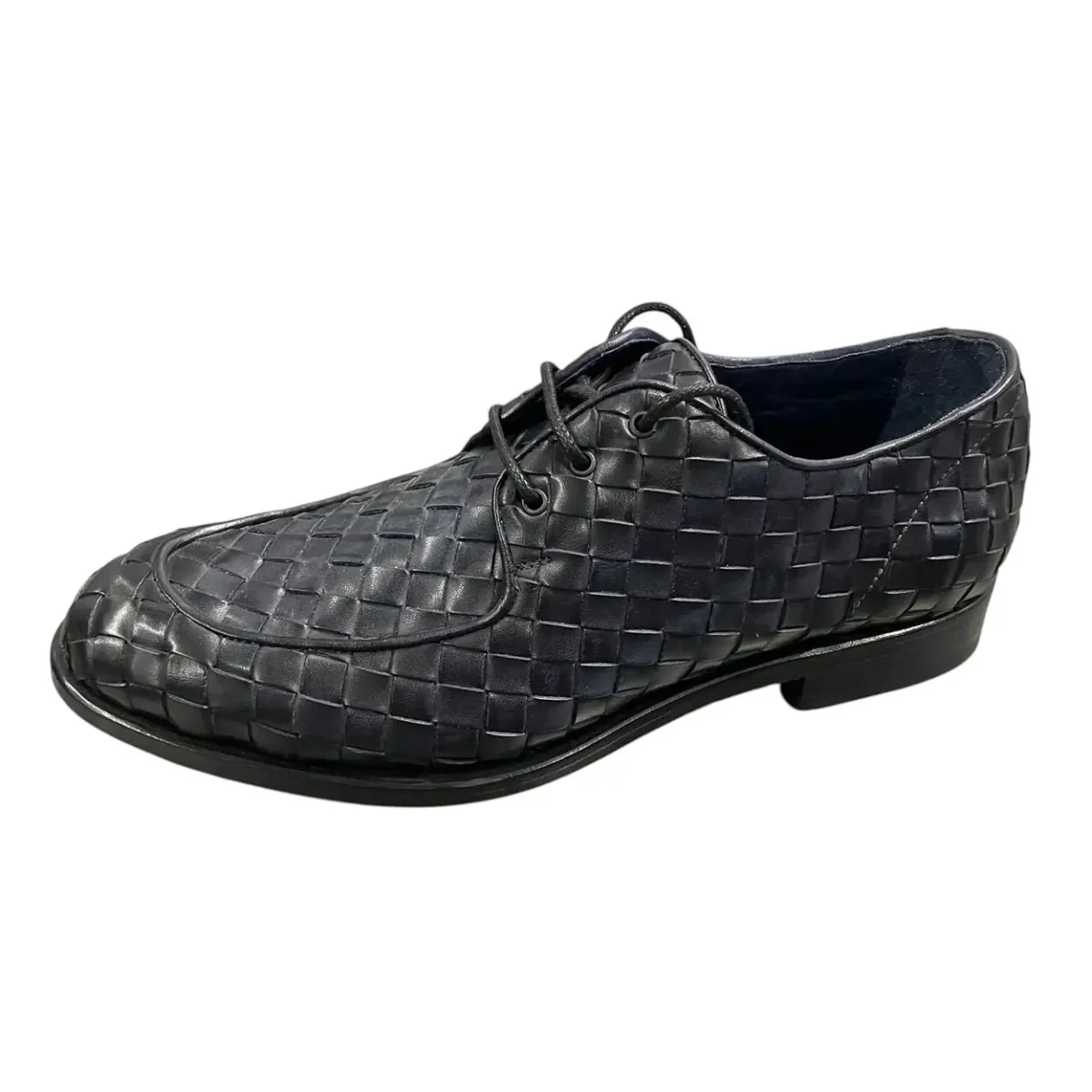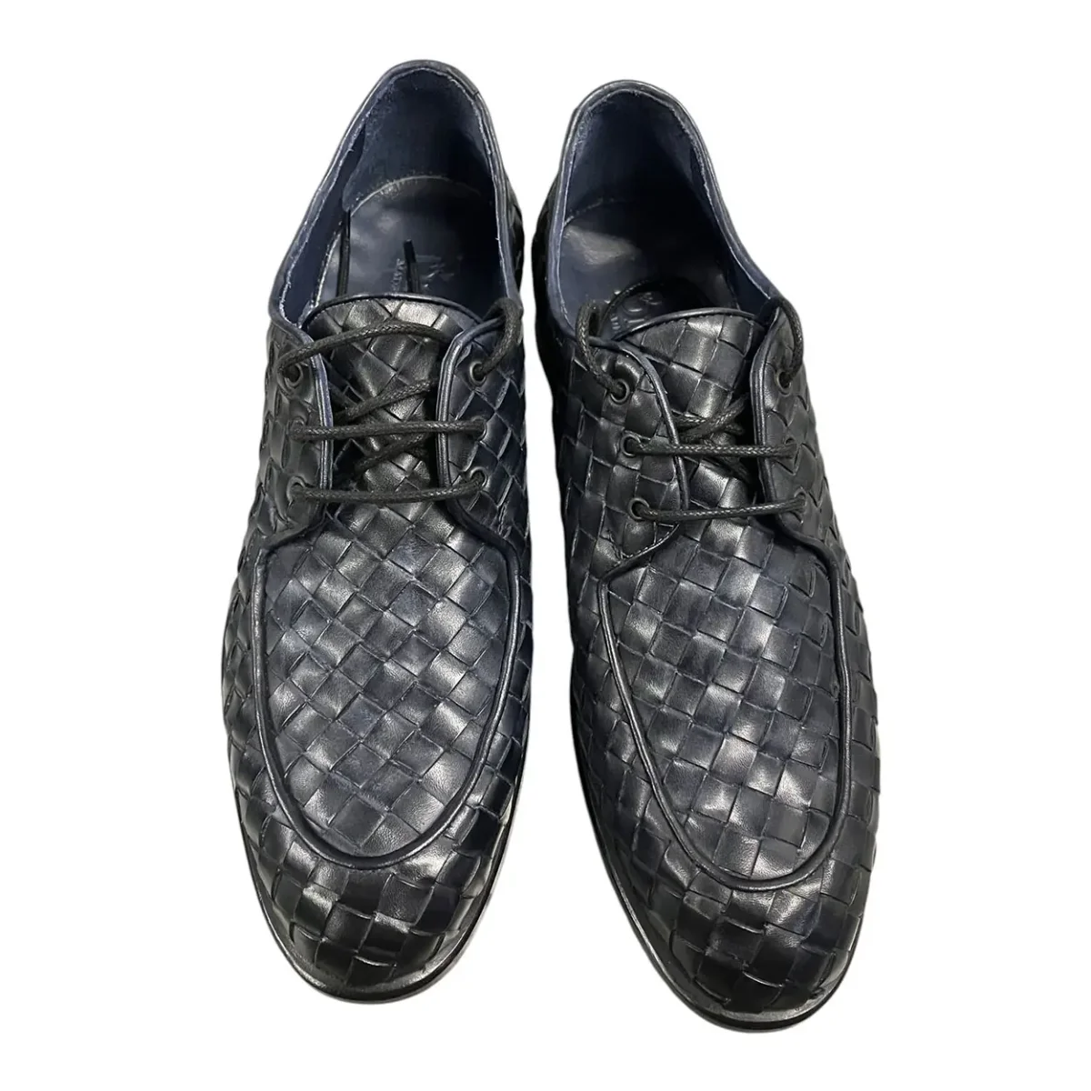 Stringate in pelle intrecciata a mano blu scuro. Chiusura lacci. Sola in cuoio cucita. Lavorazione Blake. Calzata regolare