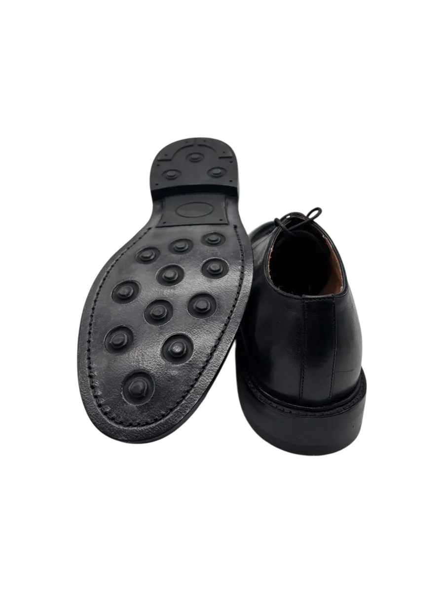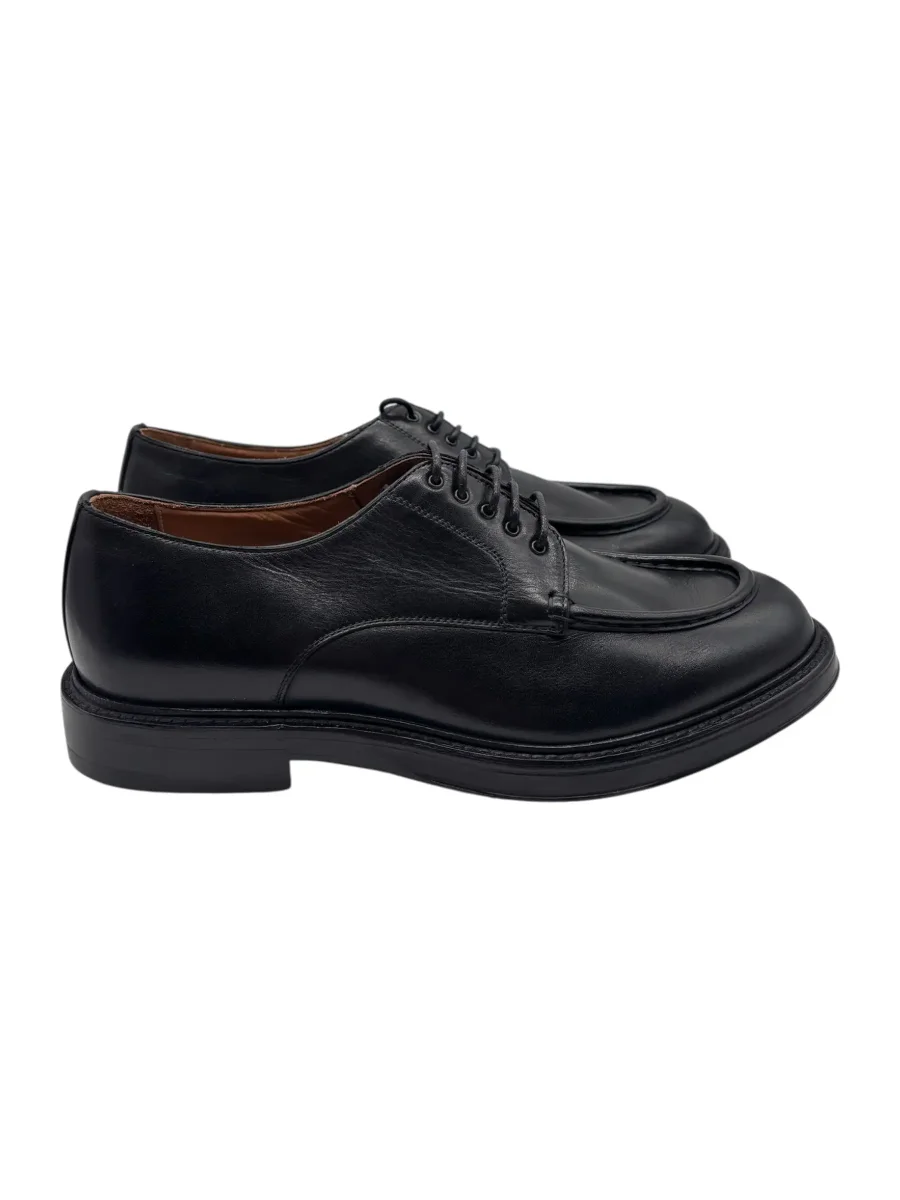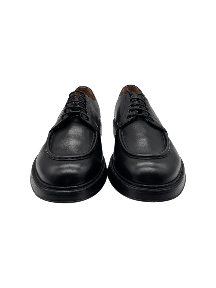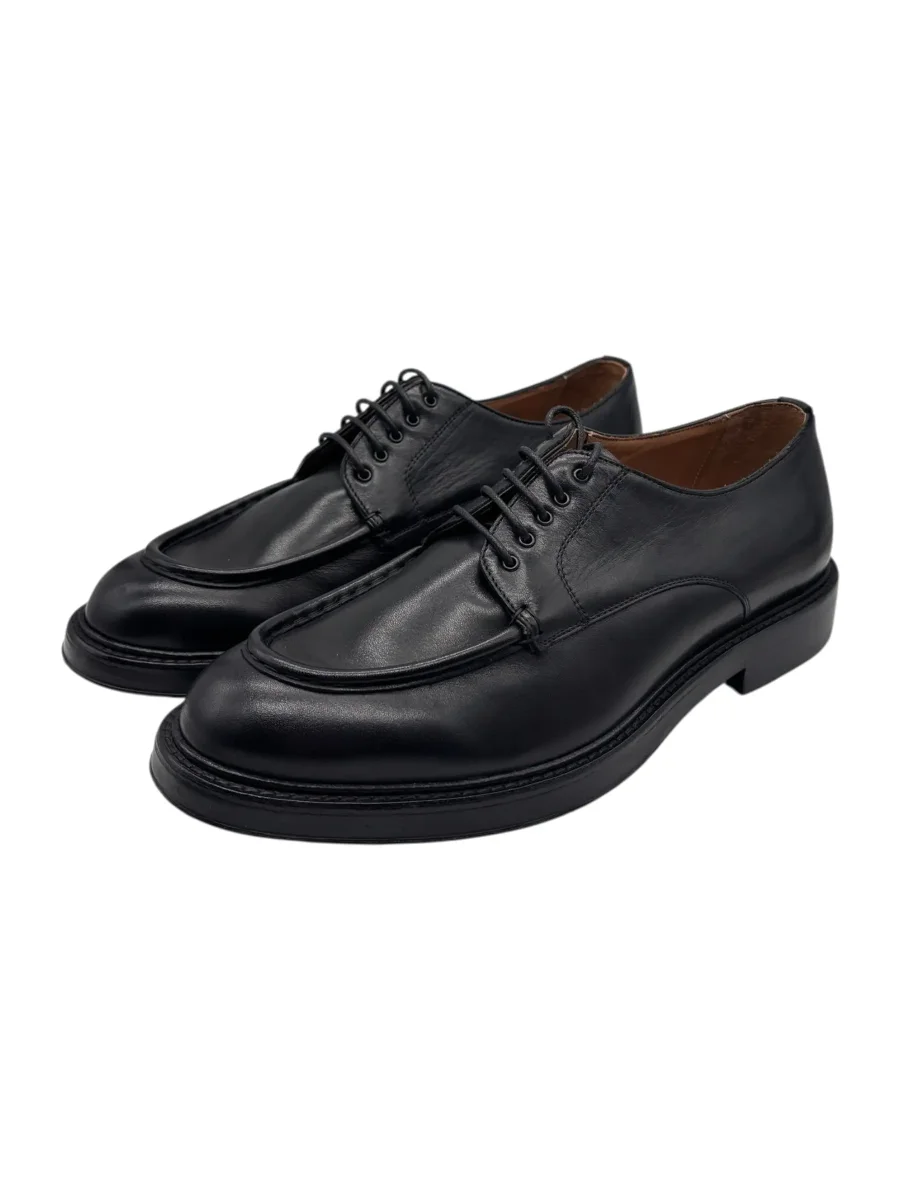 Scarpe derby da uomo in pelle nera, lavorazione artigianale Made in Italy. La scarpa presenta una cucitura a rilievo sulla punta e chiusura con lacci e cinque occhielli. Con suola in gomma spessa cucita.