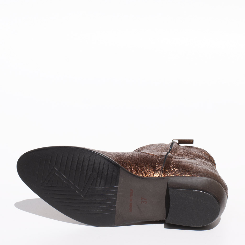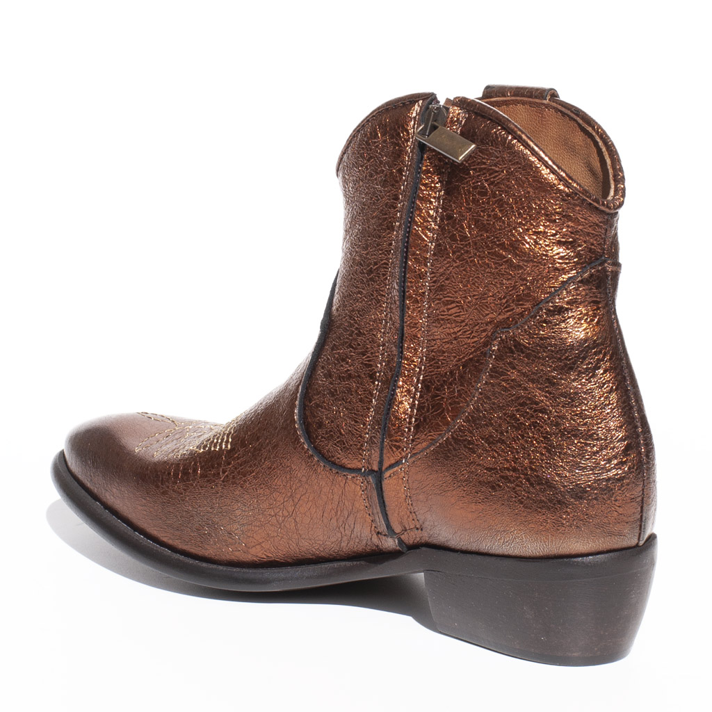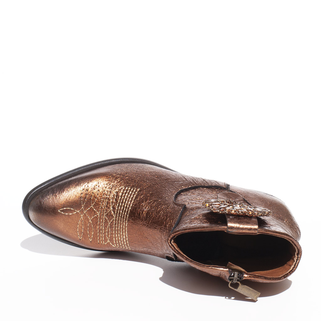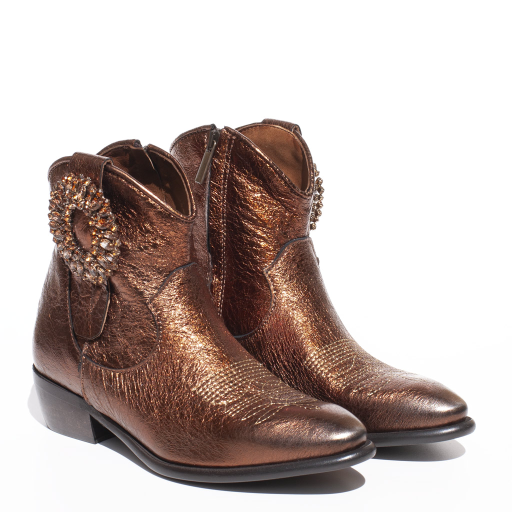 Metallic leather texan boots. Heel heights 4 cm. Side zip. Jeweled brooch. Leather lining. Leather and rubber sole . Made in Italy.