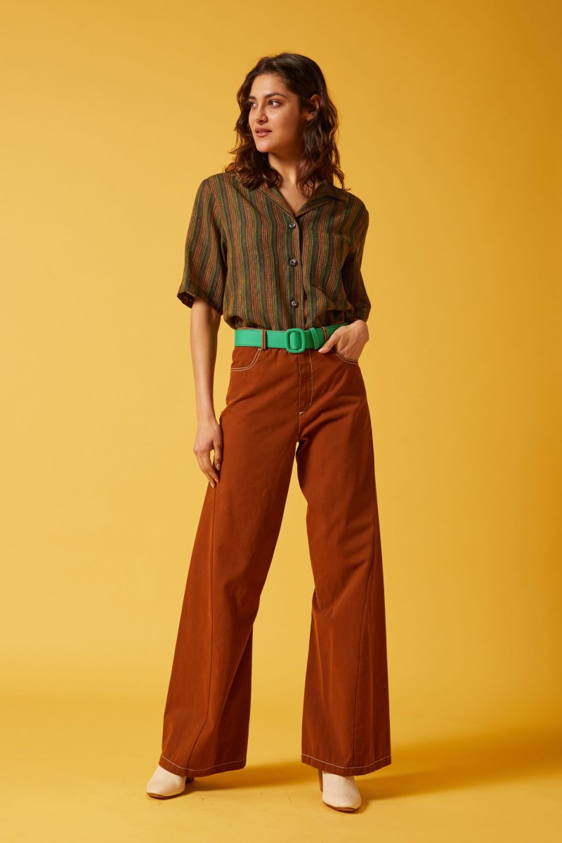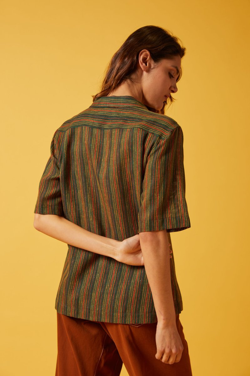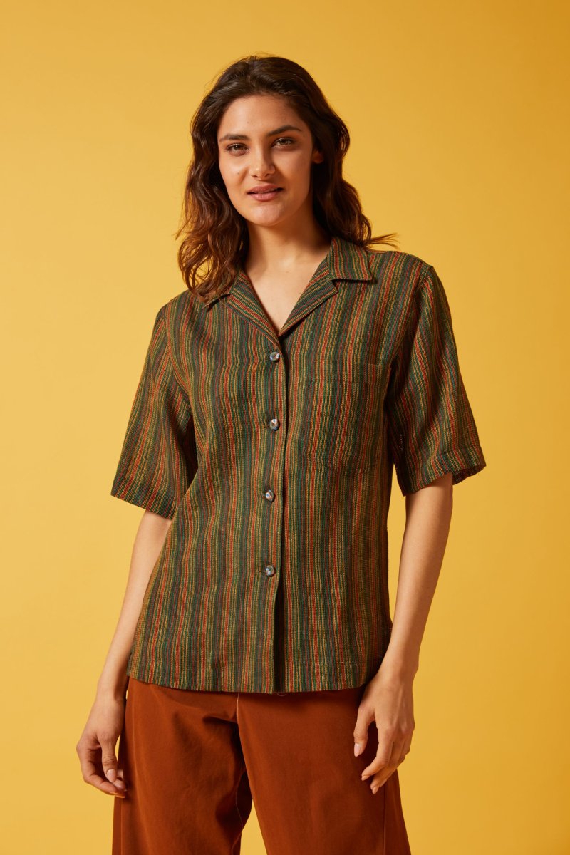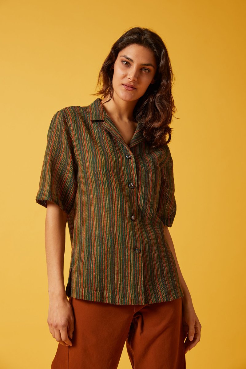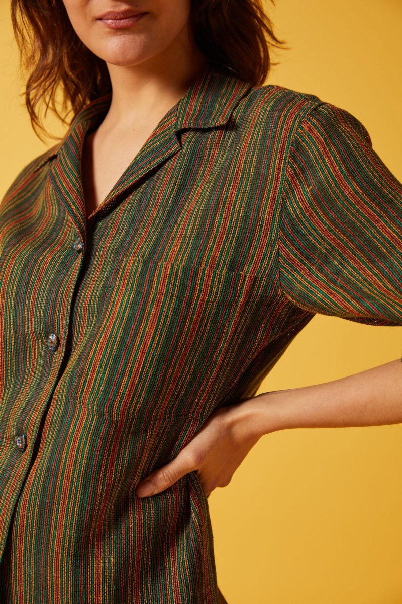 Camicia Franci di Carla Saibene a maniche corte, taglio dritto e maschile stile camicia hawaiana, bottoni ricoperti in tessuto a contrasto e taschino applicato. La versione in spessa garza di cotone a righe verdi bruciato e gialle รจ molto fresca e versatile. Puรฒ essere indossata come una camicia oppure come giacchina aperta su un pantalone, oppure abbinata alla gonna dello stesso tessuto per un effetto abito. Vedi altre varianti 100% cotone Made in Italy Vestibilitร comoda, Ana รจ alta 176 cm e indossa la 40 Taglio dritto e colletto stile camicia hawaiana, bottoni ricoperti in seta fantasia Esiste…