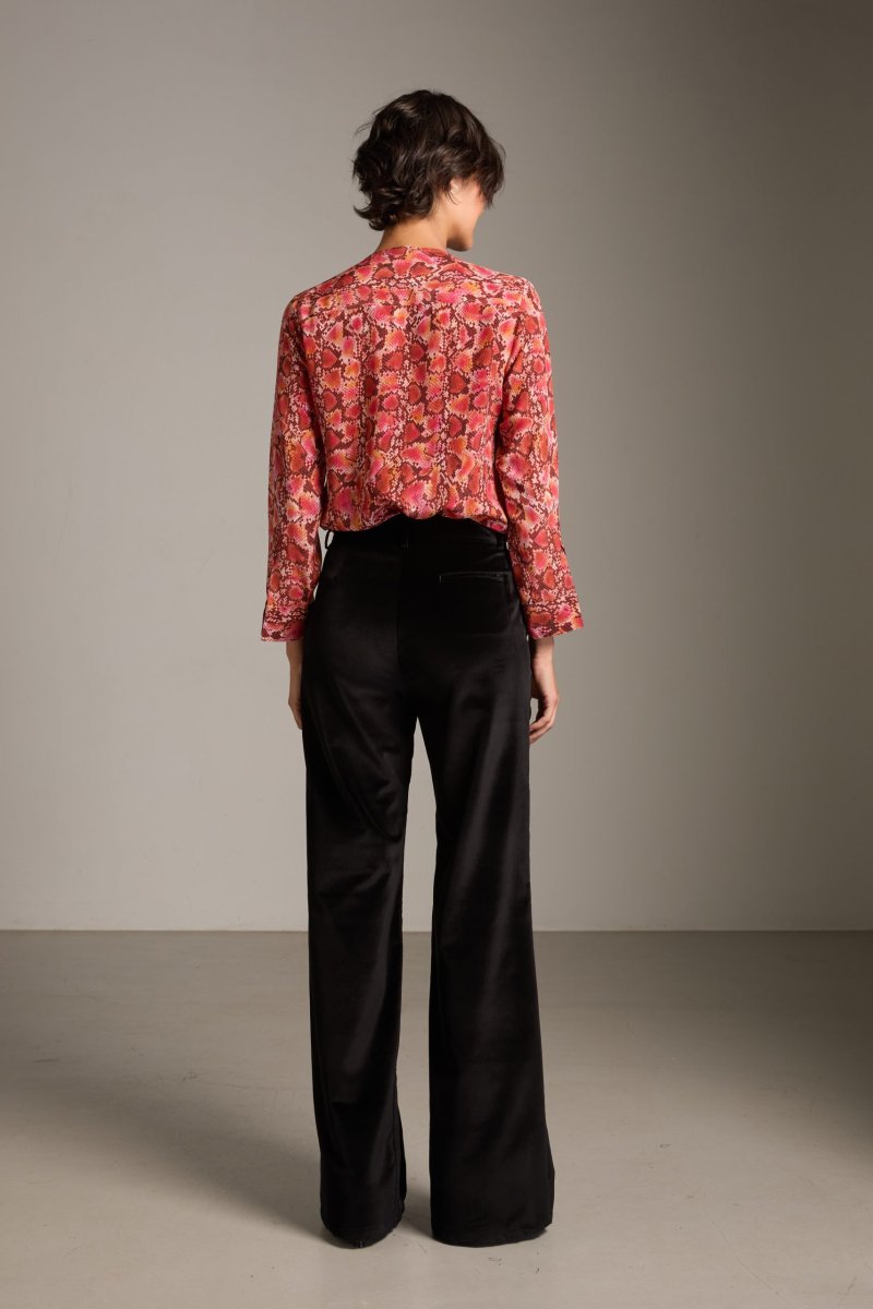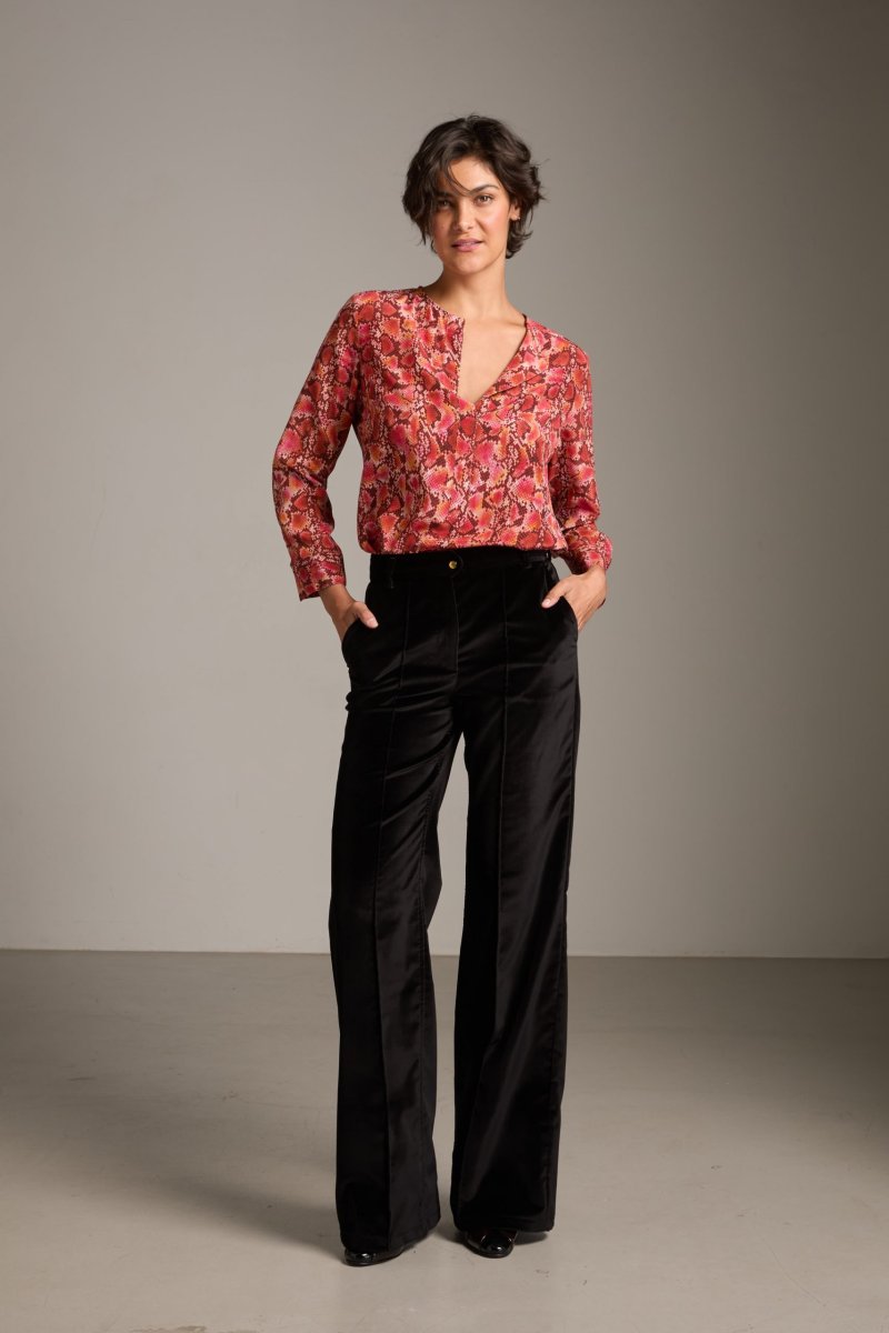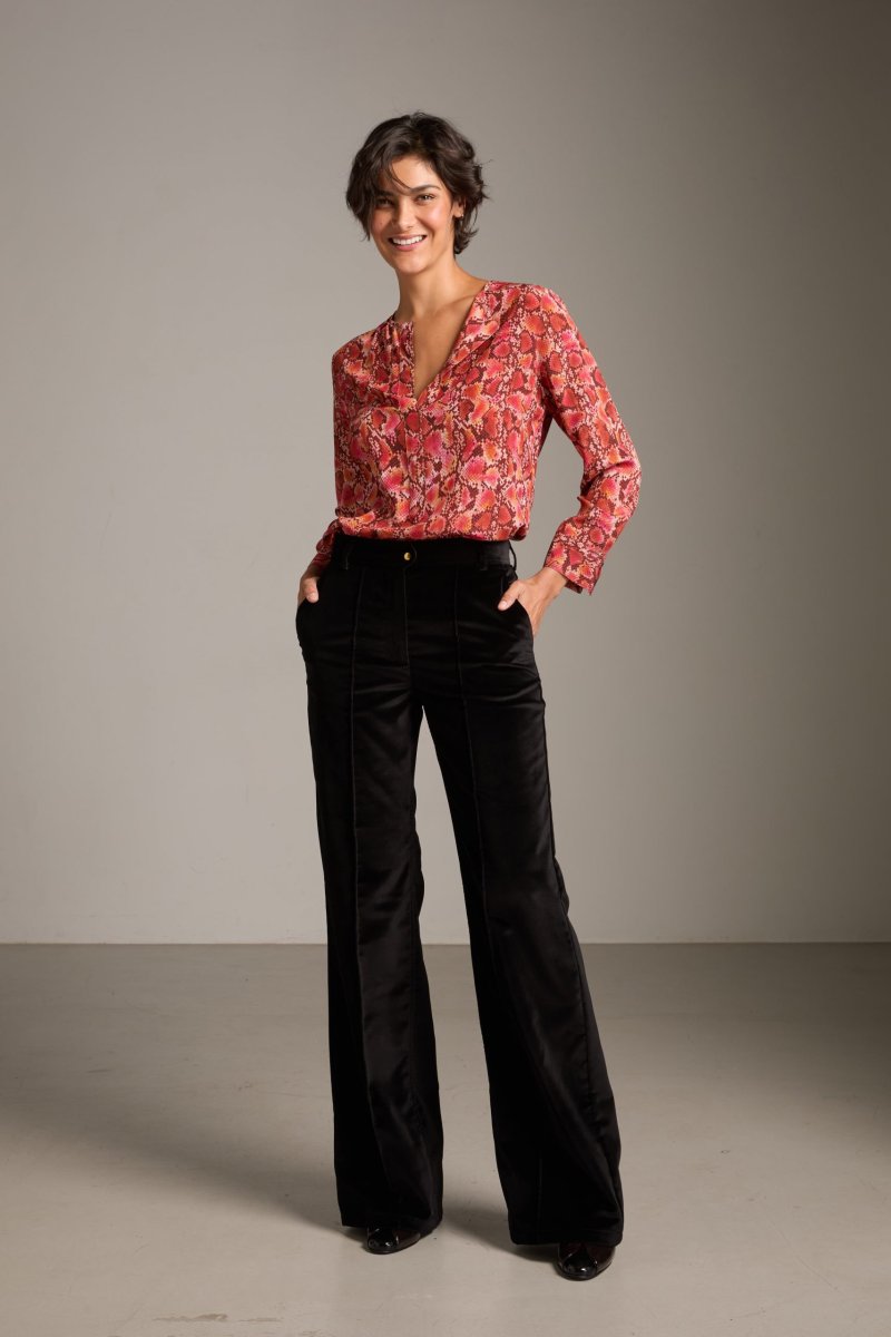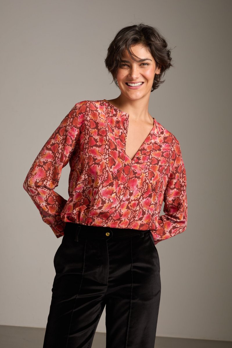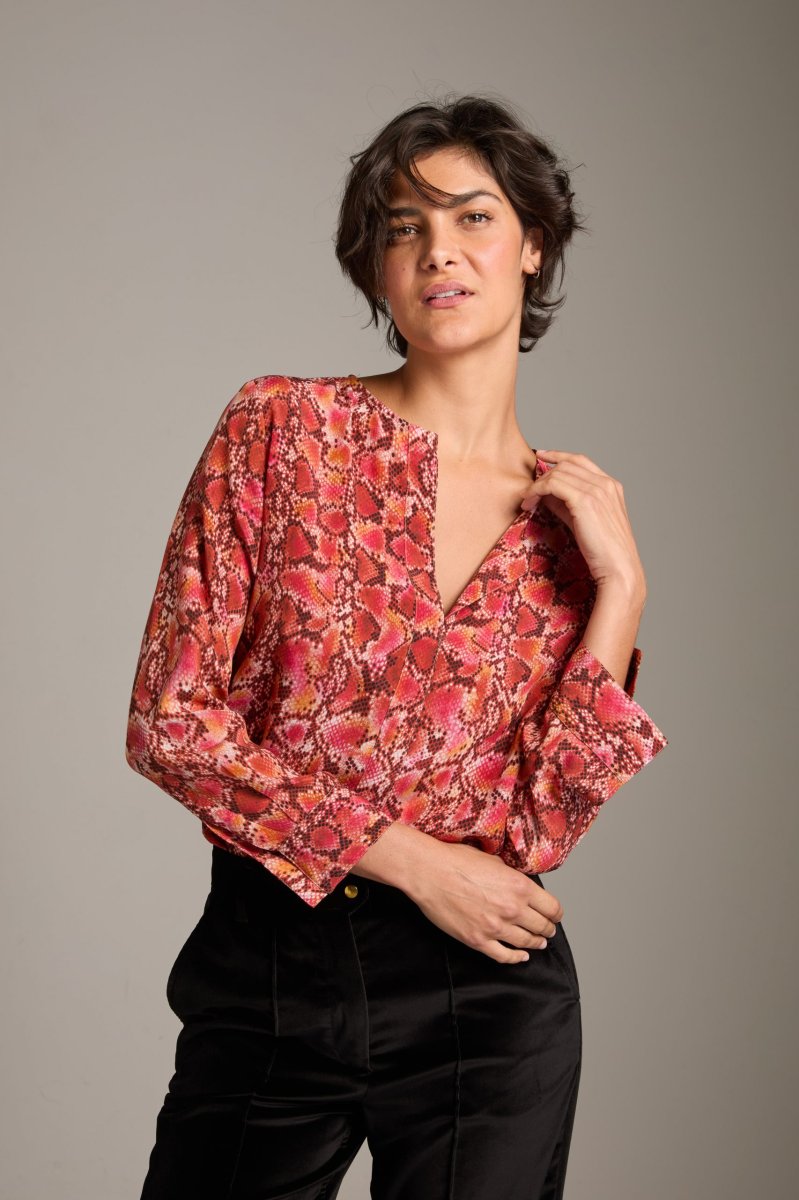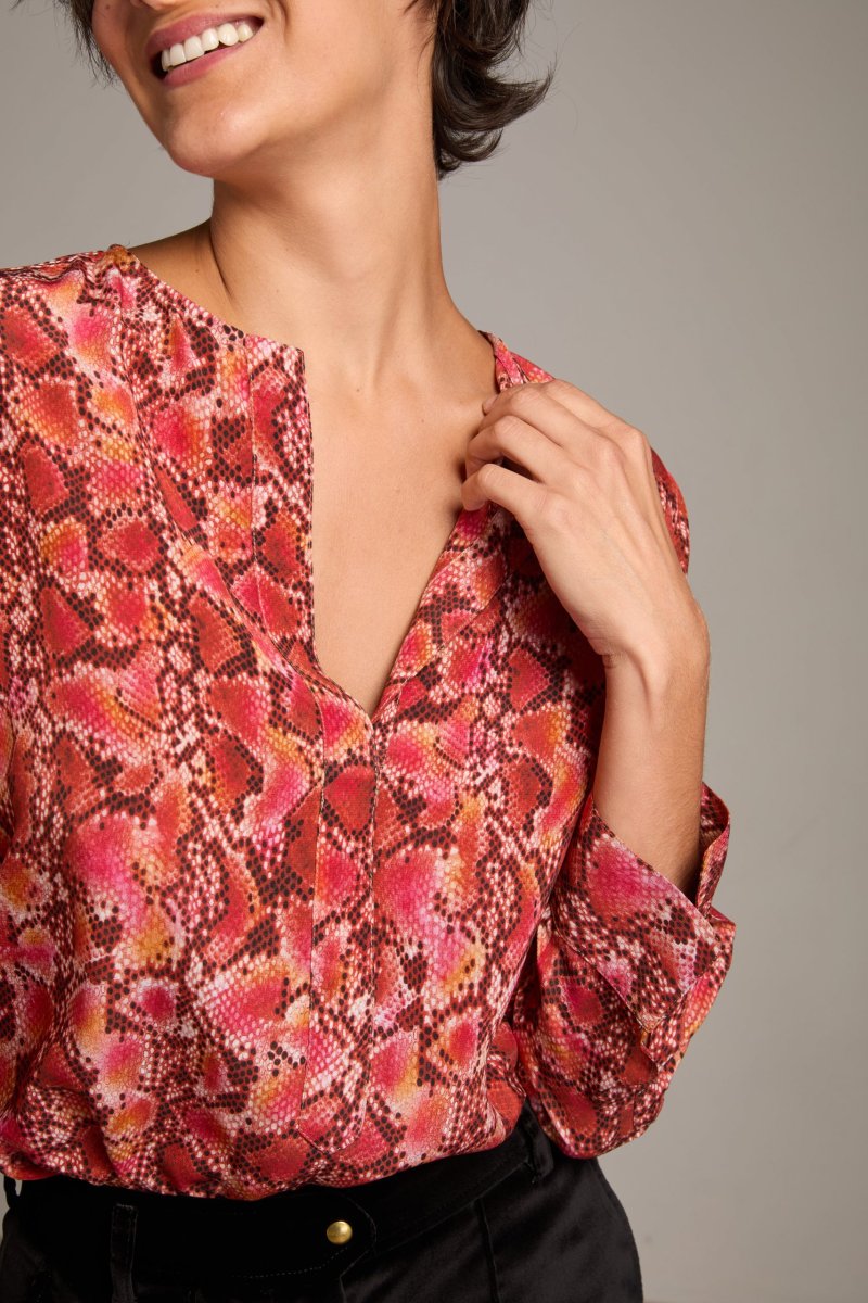 Camicia India di Carla Saibene , modello iconico della collezione, in seta crepe de chine stampa pitonata rossa. Questa camicia รจ una rivisitazione urban chic della kurta indiana, estremamente versatile, dal taglio dritto con spacchi laterali, senza colletto, maniche lungheย con polsini da camicia senza bottoni, ha un allure un poโ maschile ma allo stesso tempo molto femminile. Vedi altre varianti 100% seta Made in Italy Vestibilitร regolare, la modella indossa una 40 Tagliata stile kurta indiana, dritta con spacchi laterali, senza colletto, con polsini, senza bottoni