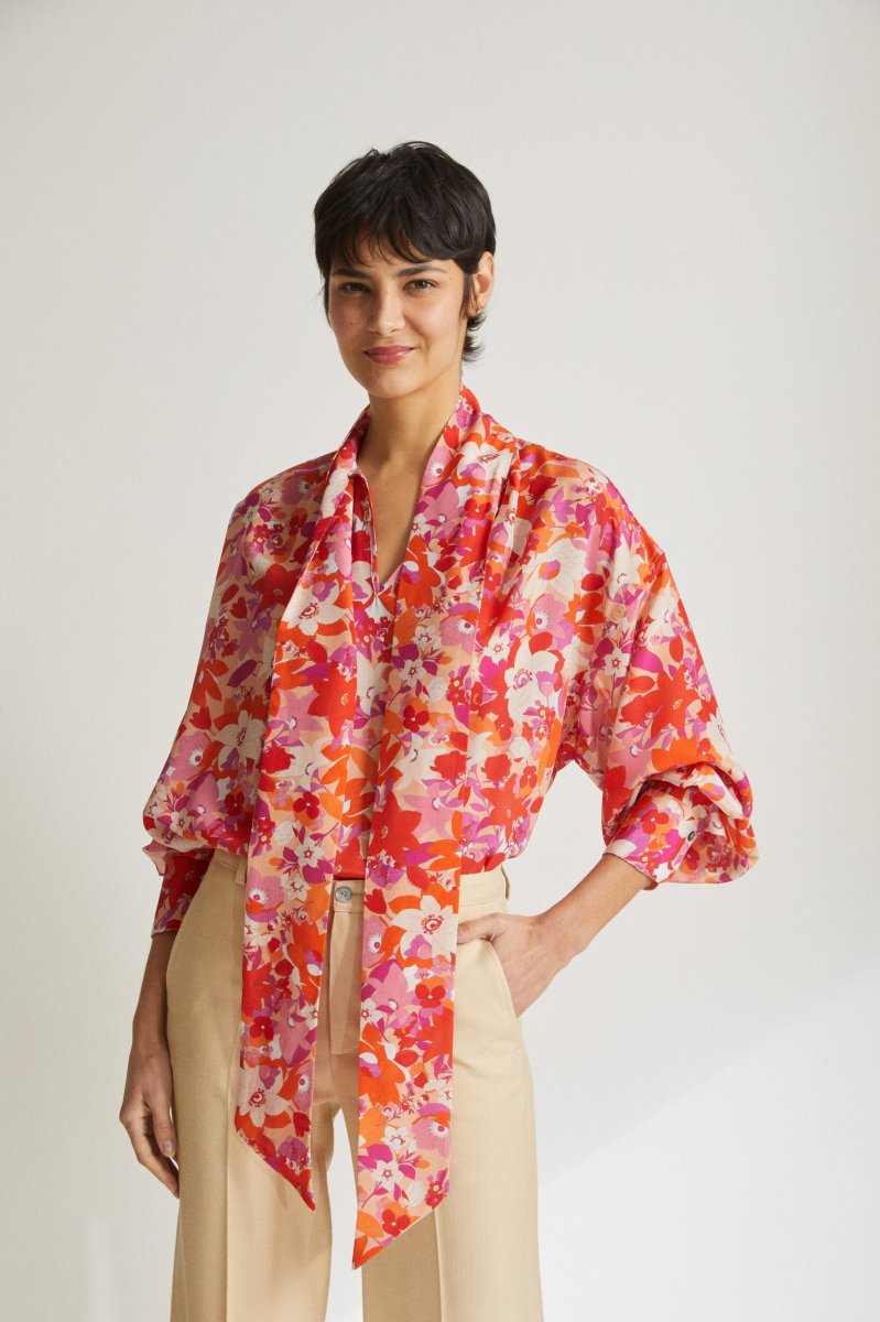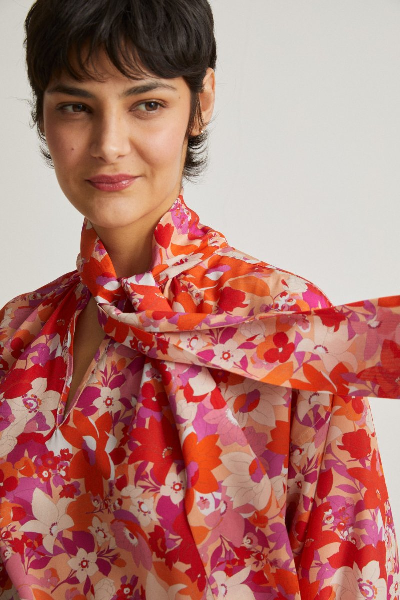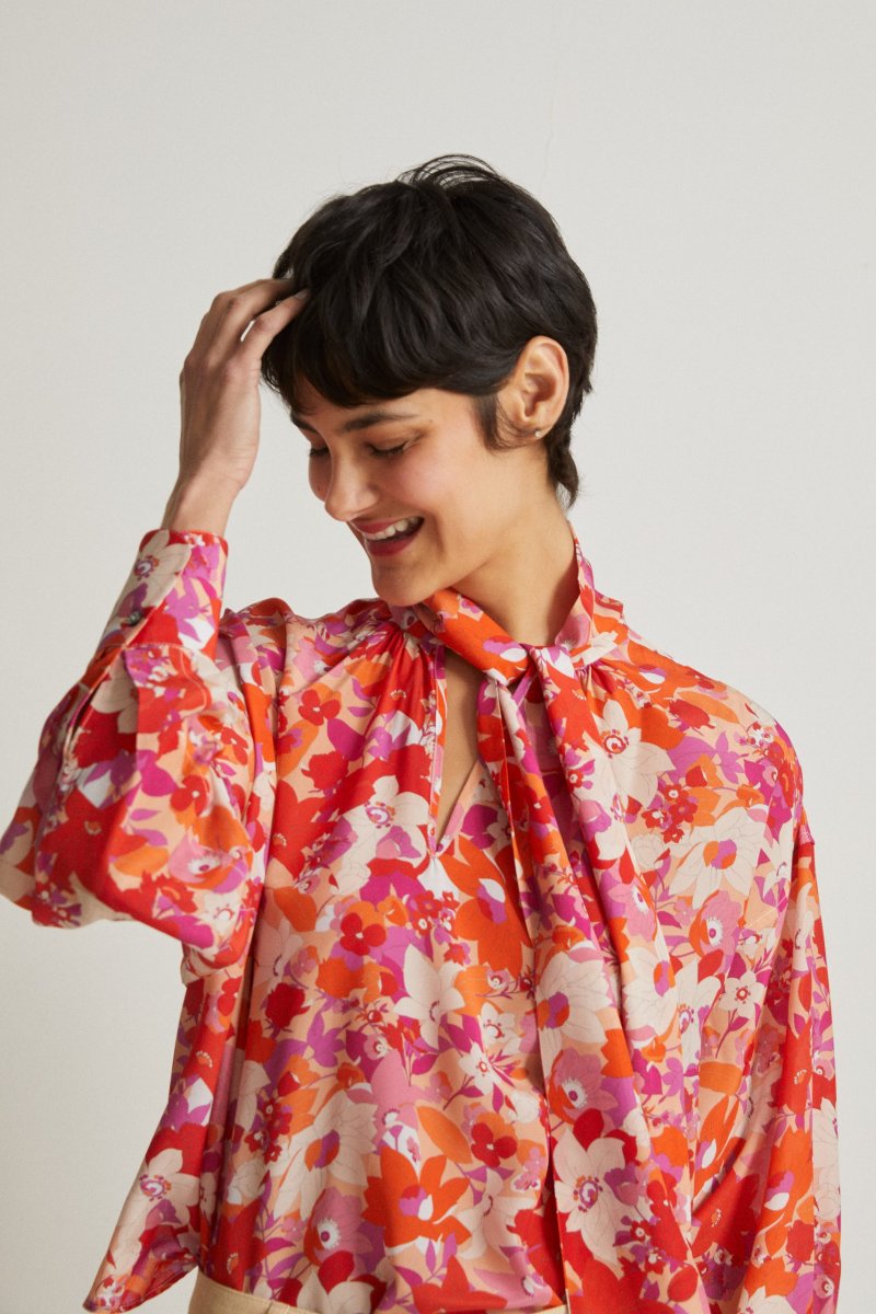Camicia Uma diย Carla Saibene,ย over, in seta stampata a fiori rosa e arancio, maniche lunghe, collo a cravatta da annodare, scollo a v con leggera arricciatura ai lati. Vedi altre varianti 100% seta Made in Italy Vestibilitร ampia Taglia unica