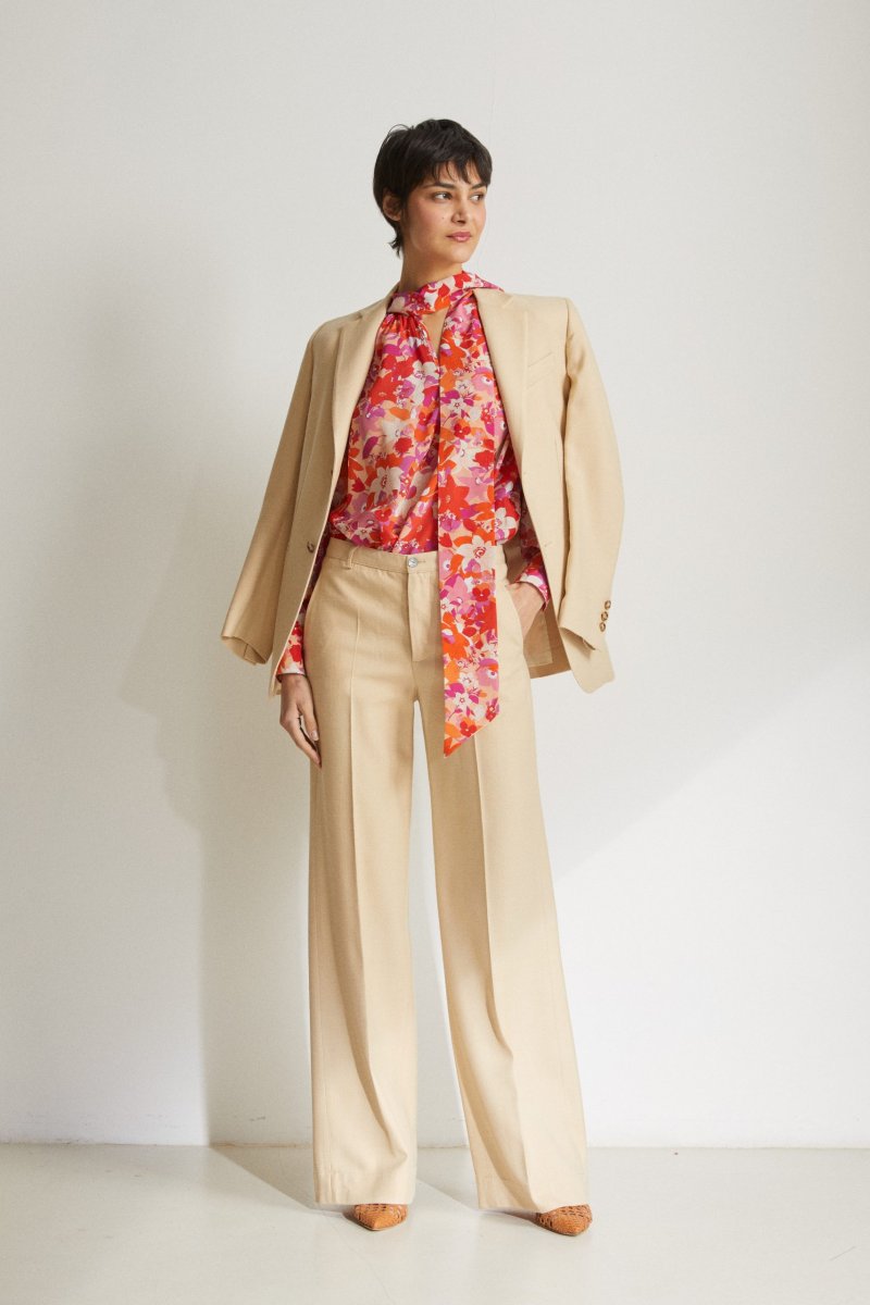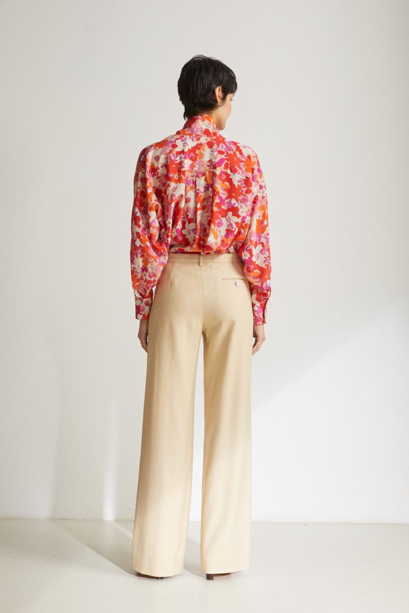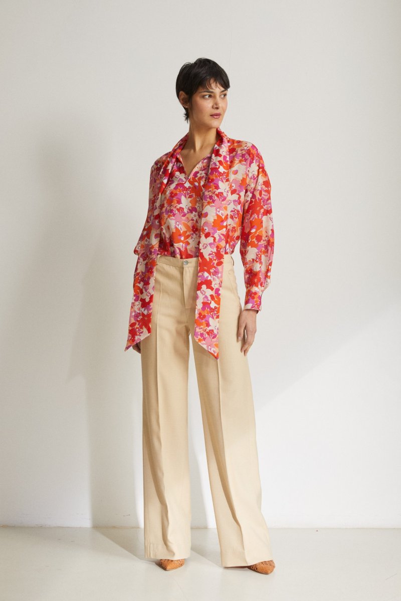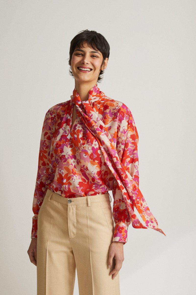Camicia Uma diย Carla Saibene,ย over, in seta stampata a fiori rosa e arancio, maniche lunghe, collo a cravatta da annodare, scollo a v con leggera arricciatura ai lati. Vedi altre varianti 100% seta Made in Italy Vestibilitร ampia Taglia unica