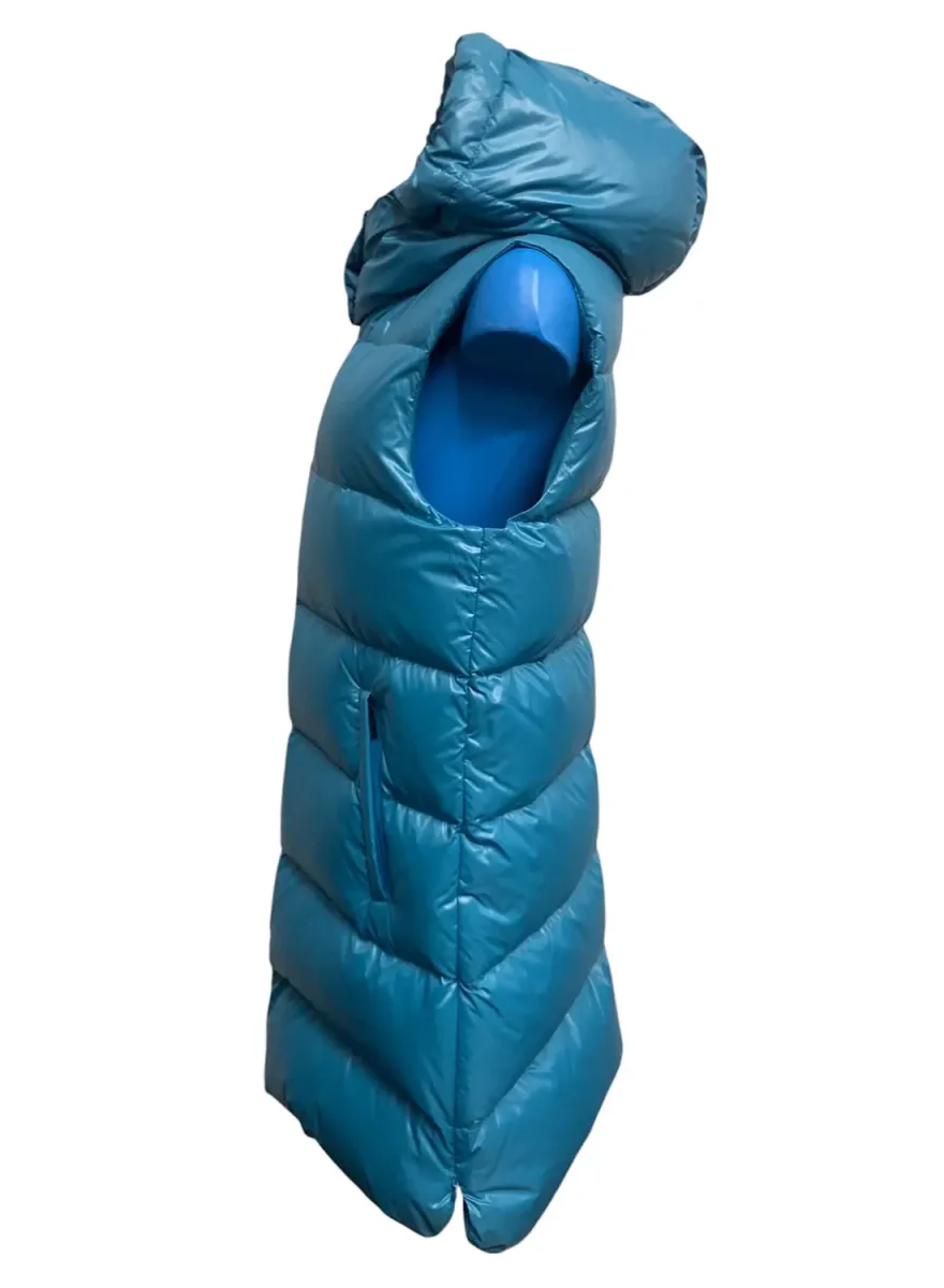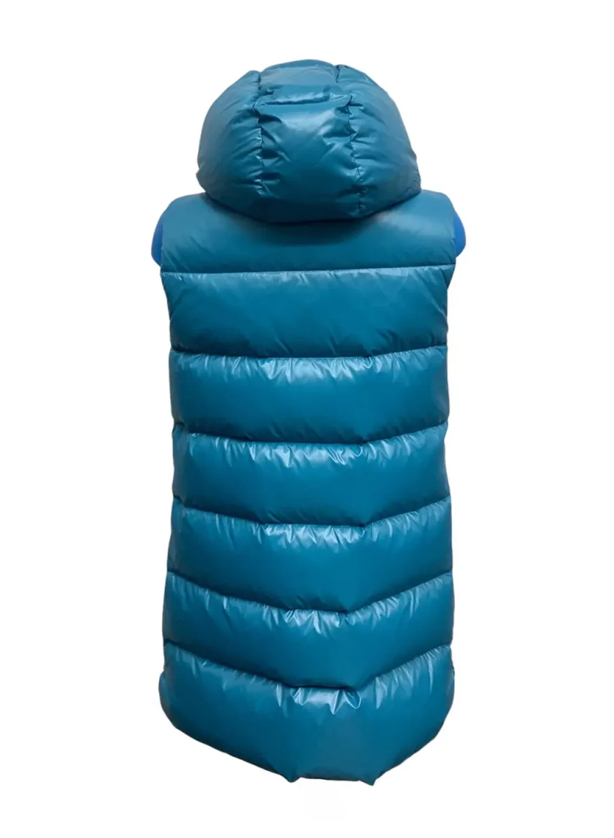 Smanicato dall’effetto super lucido, trapuntato e moderno. Imbottito internamente in vero piumino per offrire la massima protezione e tenuta del calore, il capo si presenta con un apertura centrale con zip a doppio cursore, ampie tasche laterali con chiusura a zip, spacchi laterali apribili con zip per modulare la svasatura ed infine un ampio ed avvolgente cappuccio. Composizione: Tessuto esterno:100% poliammidica, Imbottitura 95% piumino+5%piuma