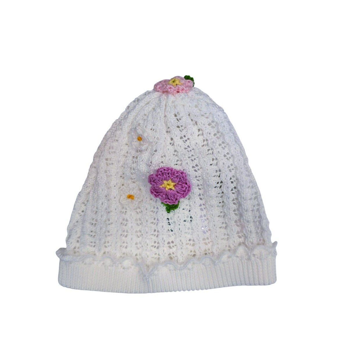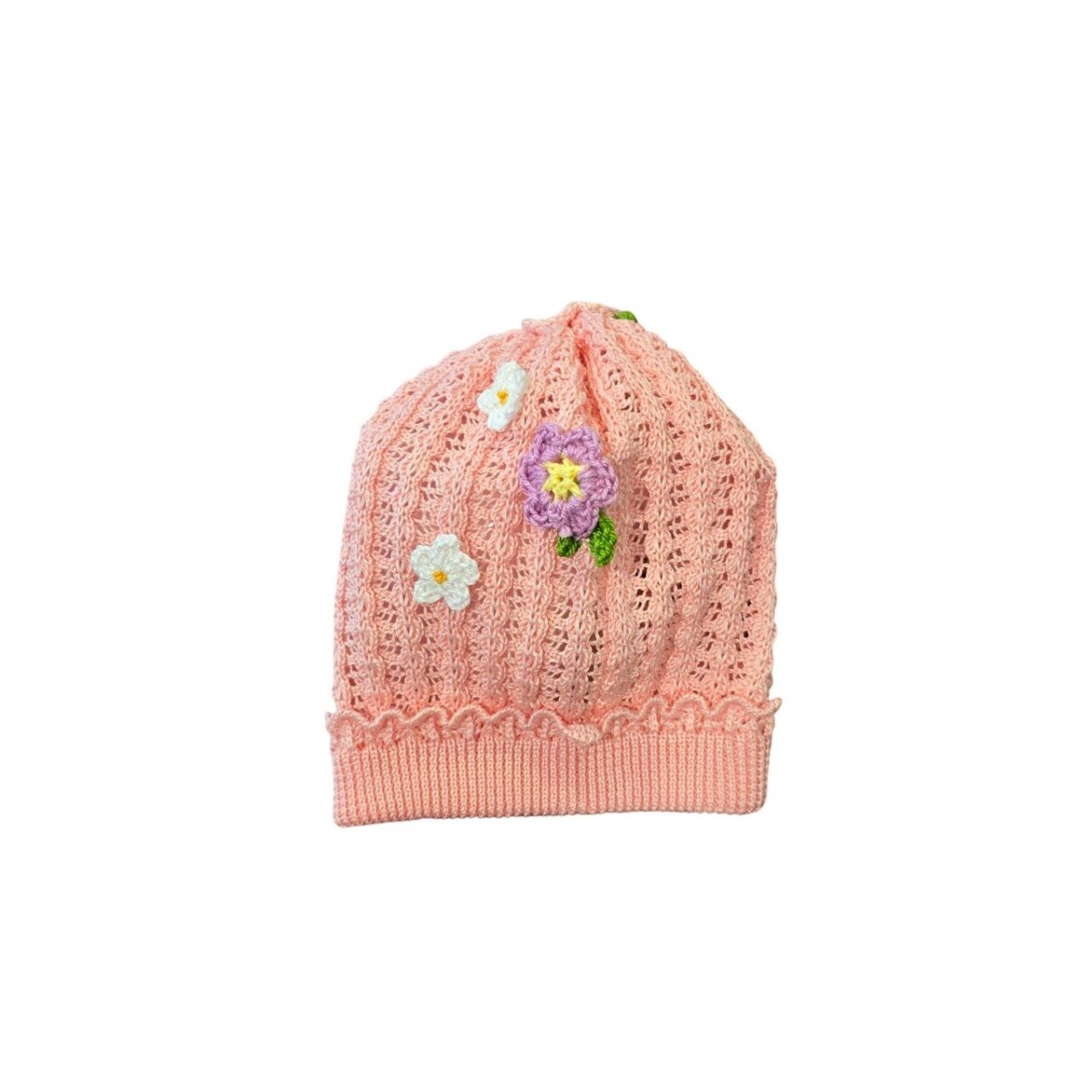 Cappellino in cotone con applicazione di fiorellini realizzati all’uncinetto. Made in Italy