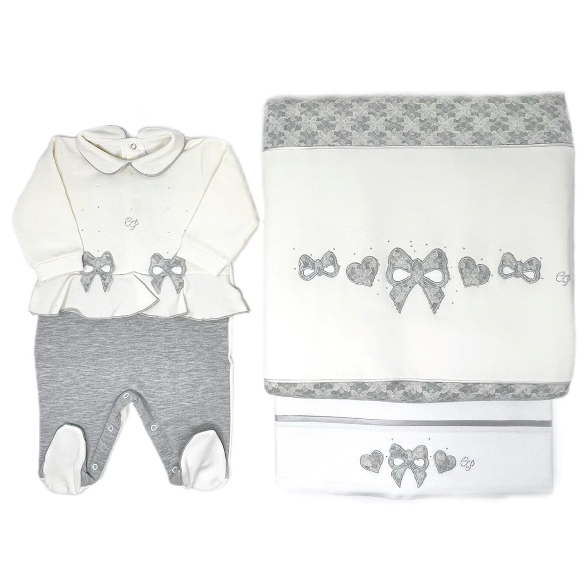 Coordinato molto particolare di Carlo Pignatelli. La coperta imbottita è realizzata in tessuto fiorato e felpa e con applicazioni di fiocchi in tessuto fiorato grigio. La tutina in felpa è bicolore Lenzuolino coordinato