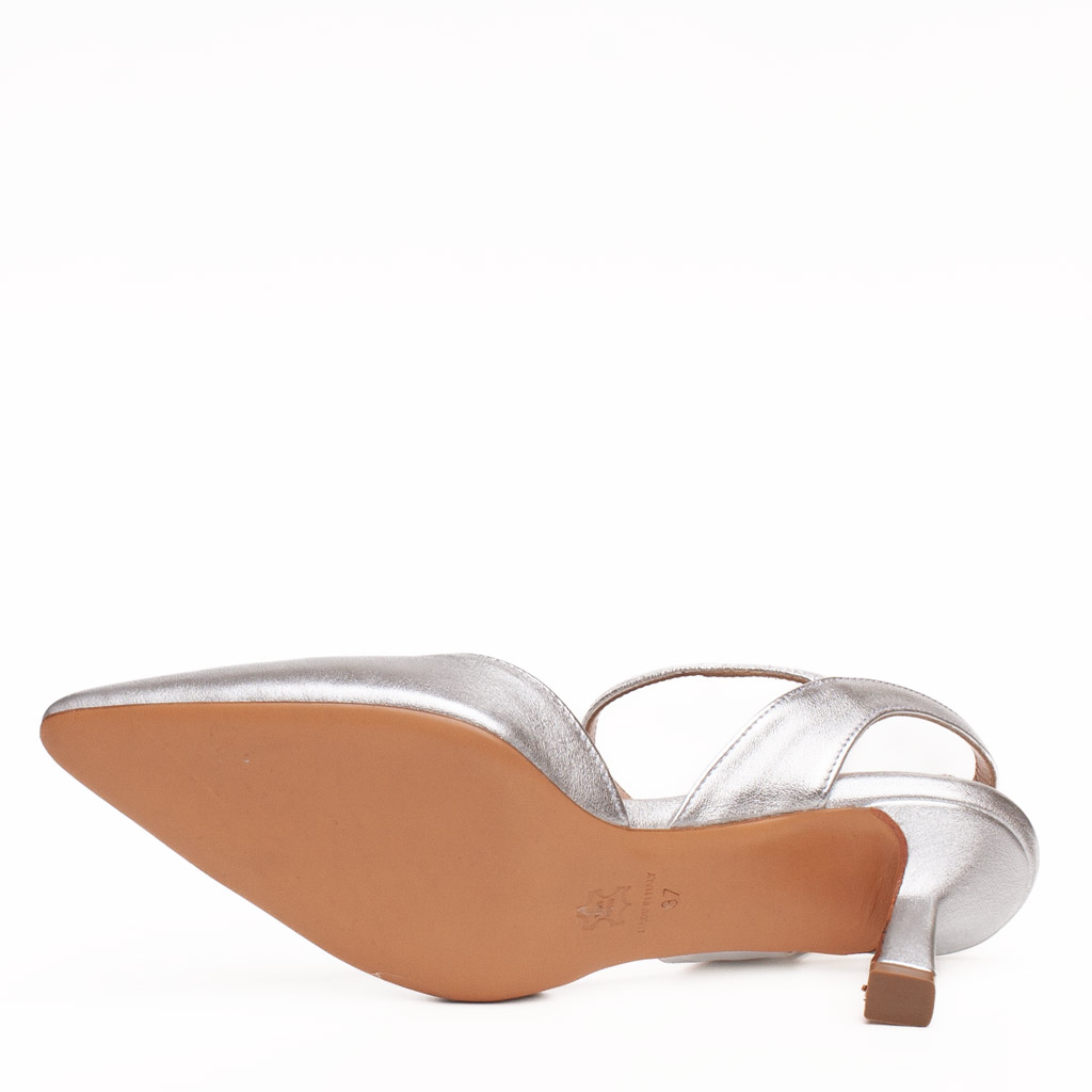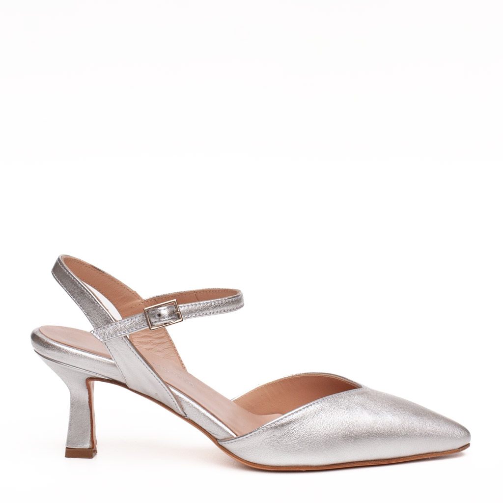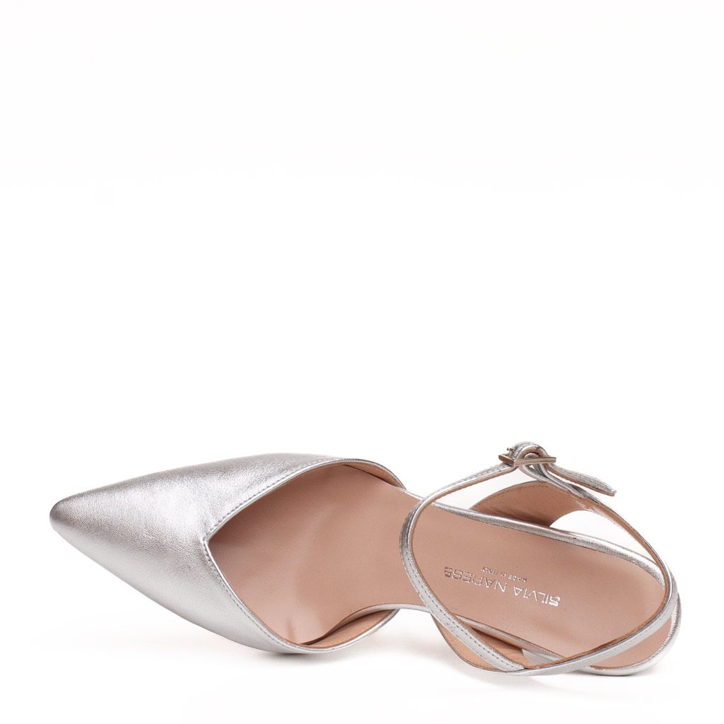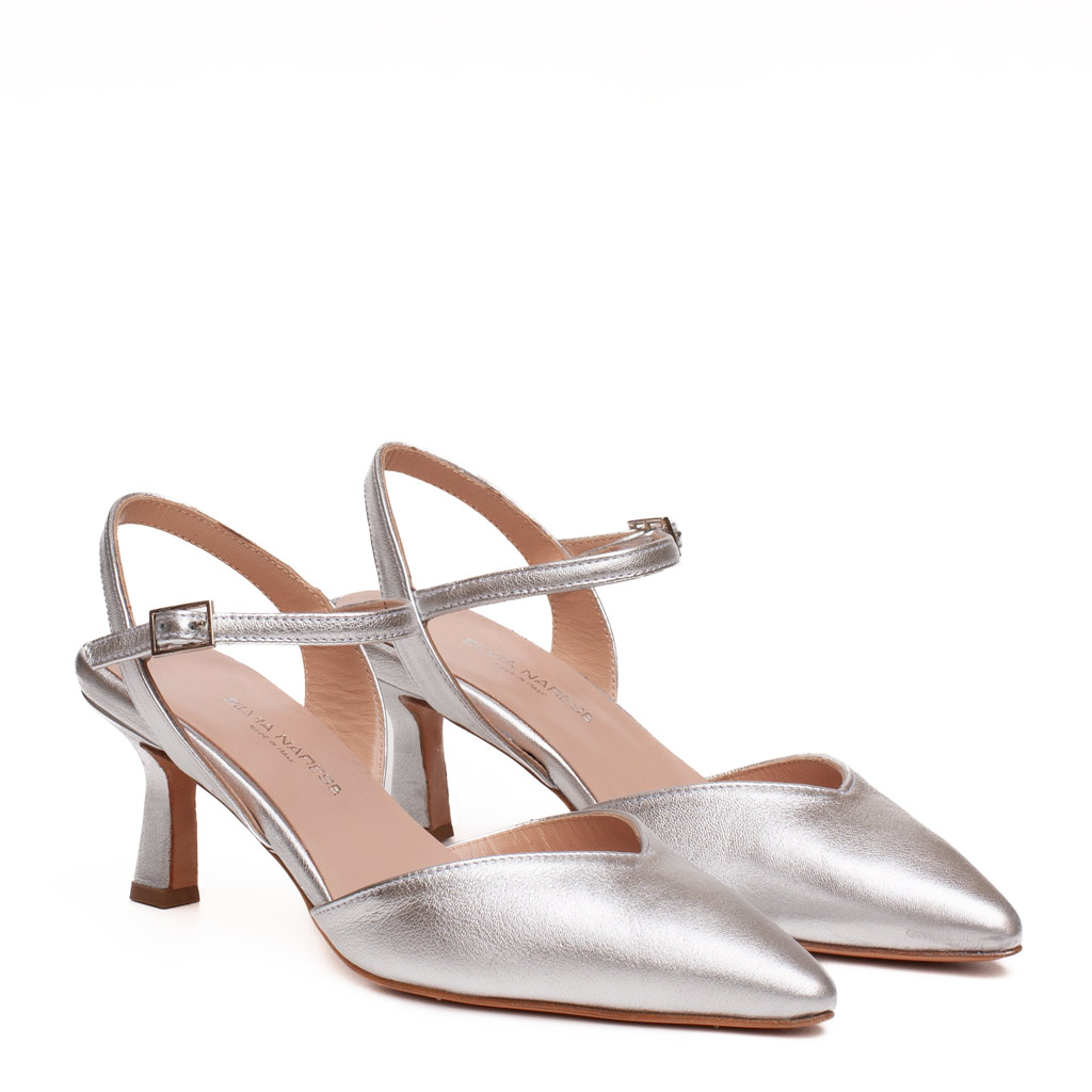 Scarpa in pelle aperta dietro con cinturino alla caviglia regolabile.ย Suola in cuoio. Altezza tacco 6.5 cm. Fodera in pelle. La scollatura a V garantisce grande comfort alla pianta. Adatta ad essere indossata sotto l’abito da sposa. Made in Italy.
