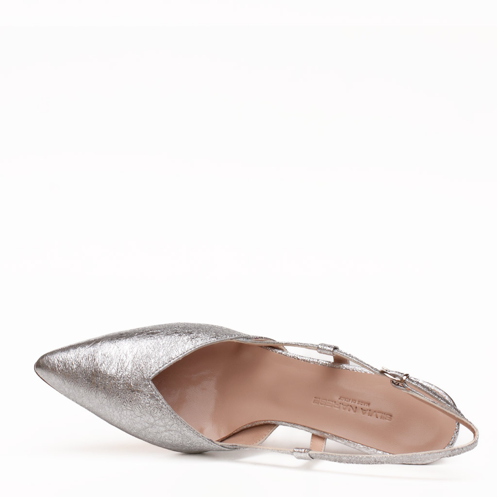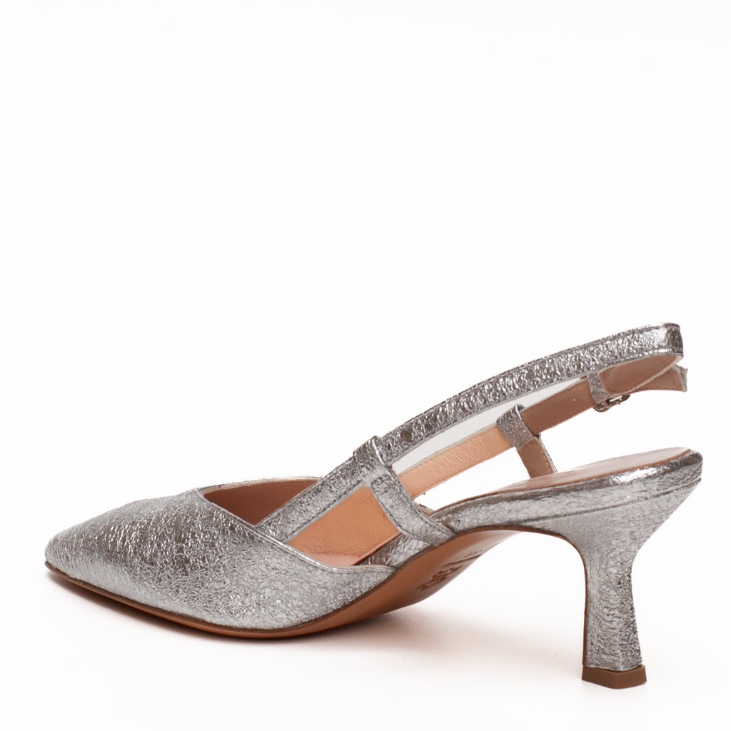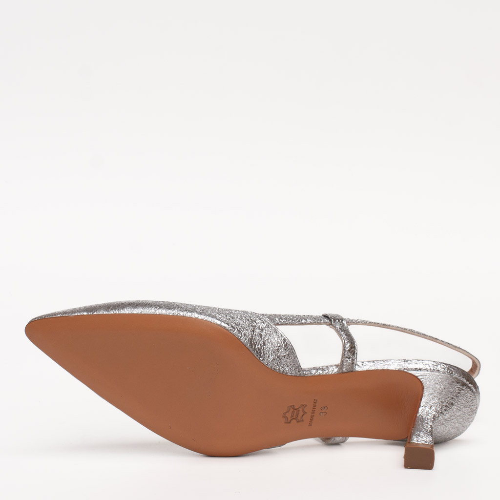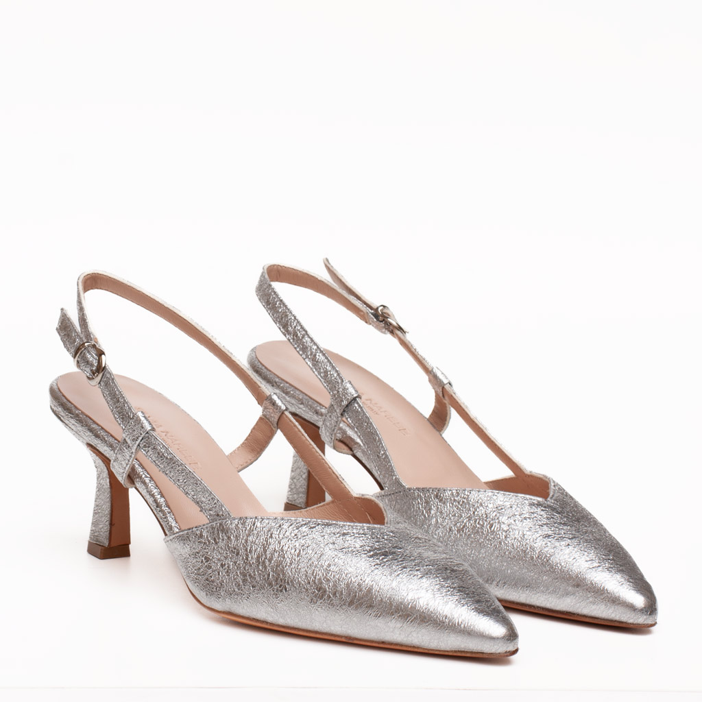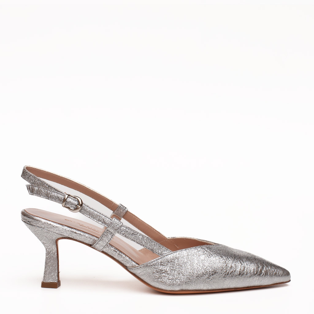 Scarpa aperta dietro in pelle. Punta affusolata.ย  Cinturino regolabile sul tallone. Altezza tacco 6.5 cm. Suola in cuoio. Fodera in pelle. Made in Italy.