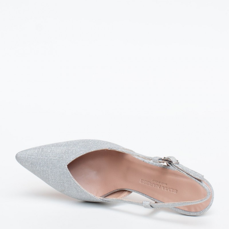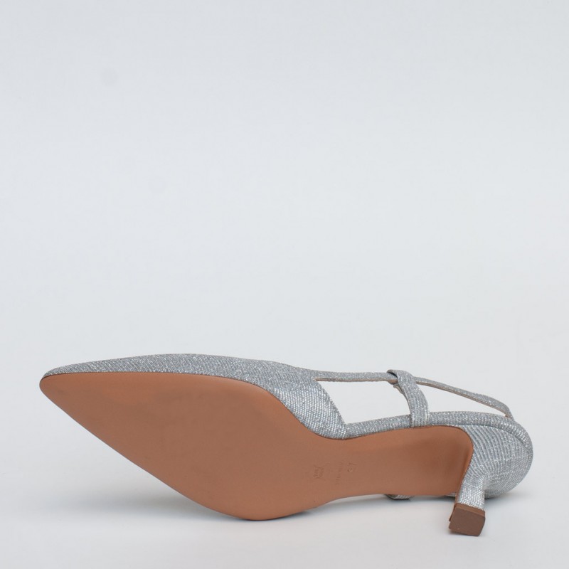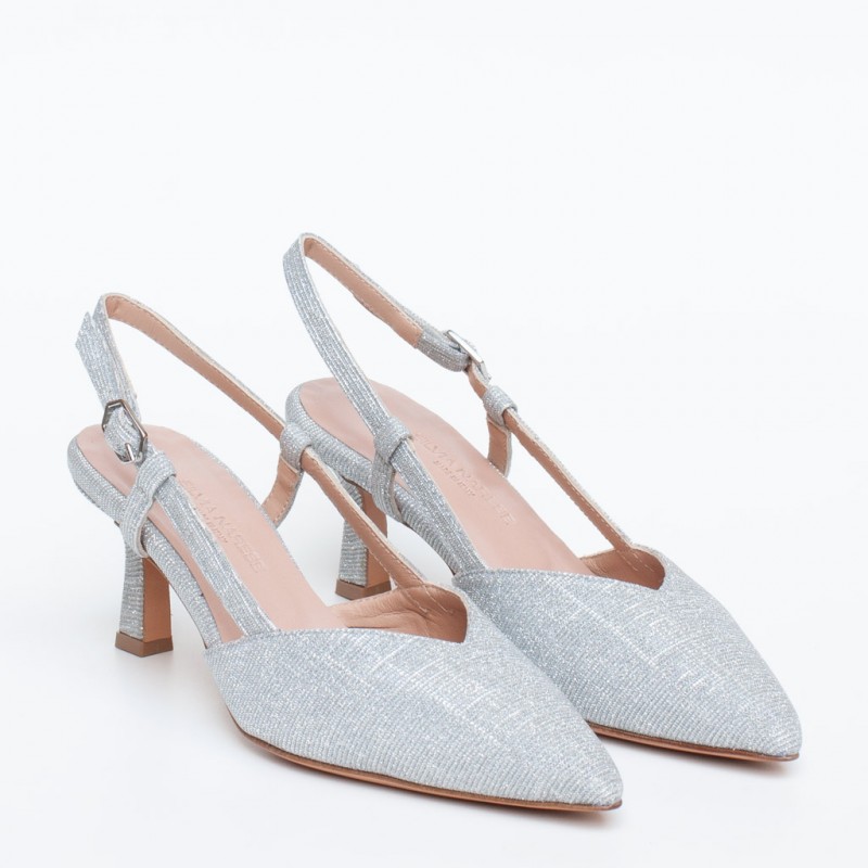 Scarpa inย tessuto con cinturino regolabile. Suola in cuoio. Altezza taccoย 6 cm.ย Tacco foderato. Fodera in pelle.