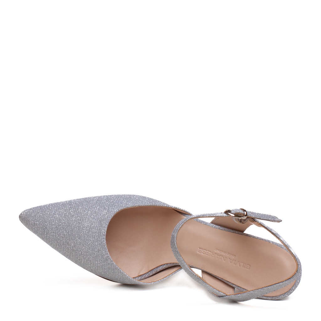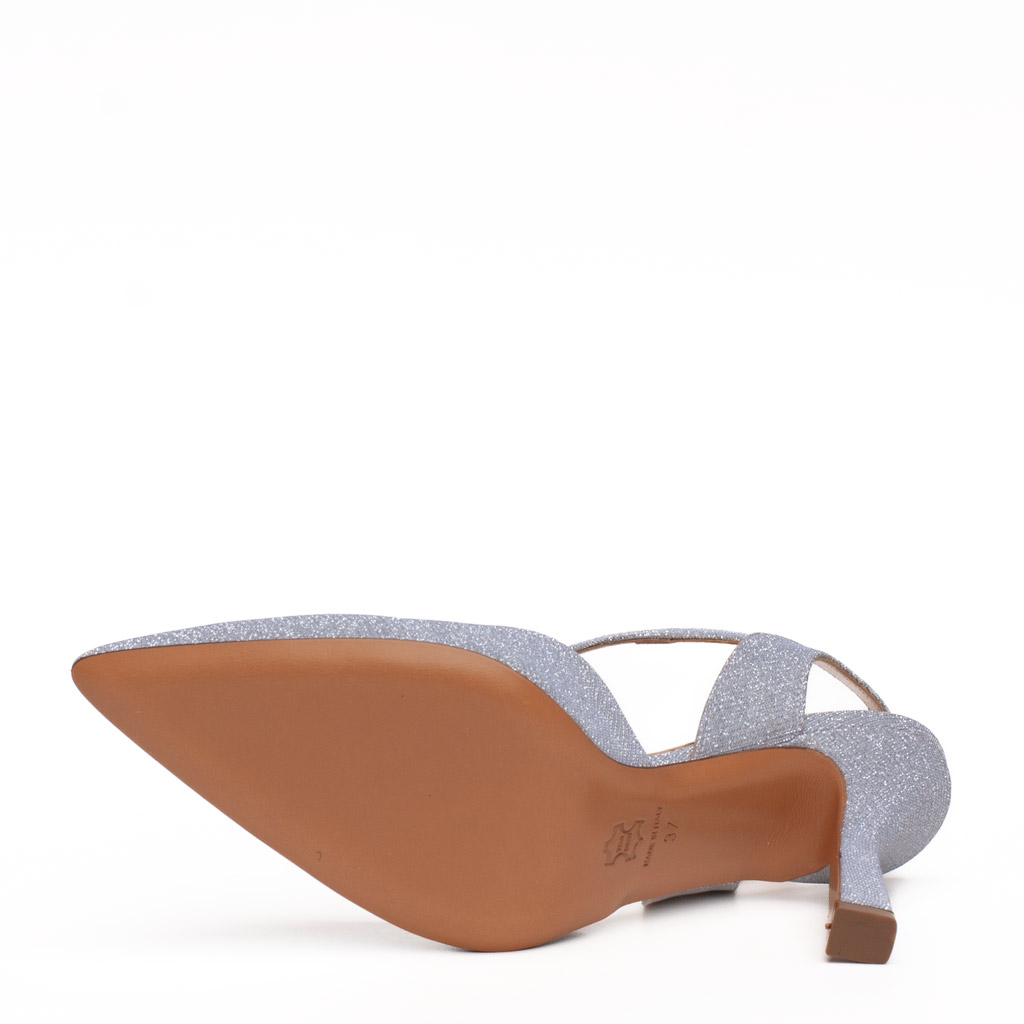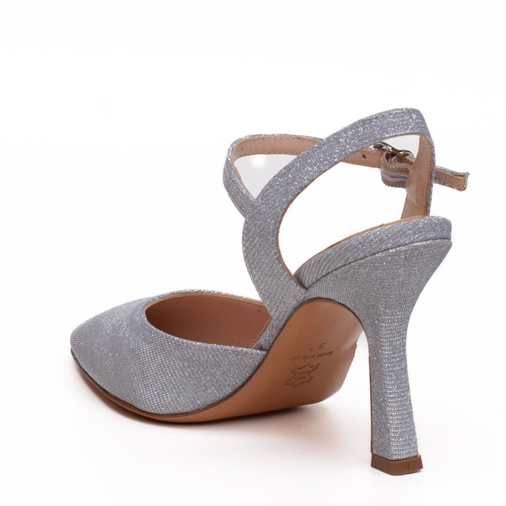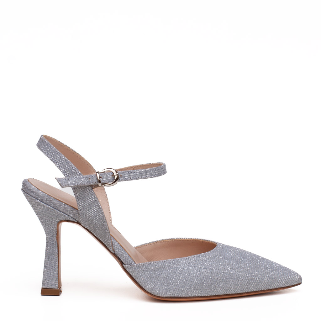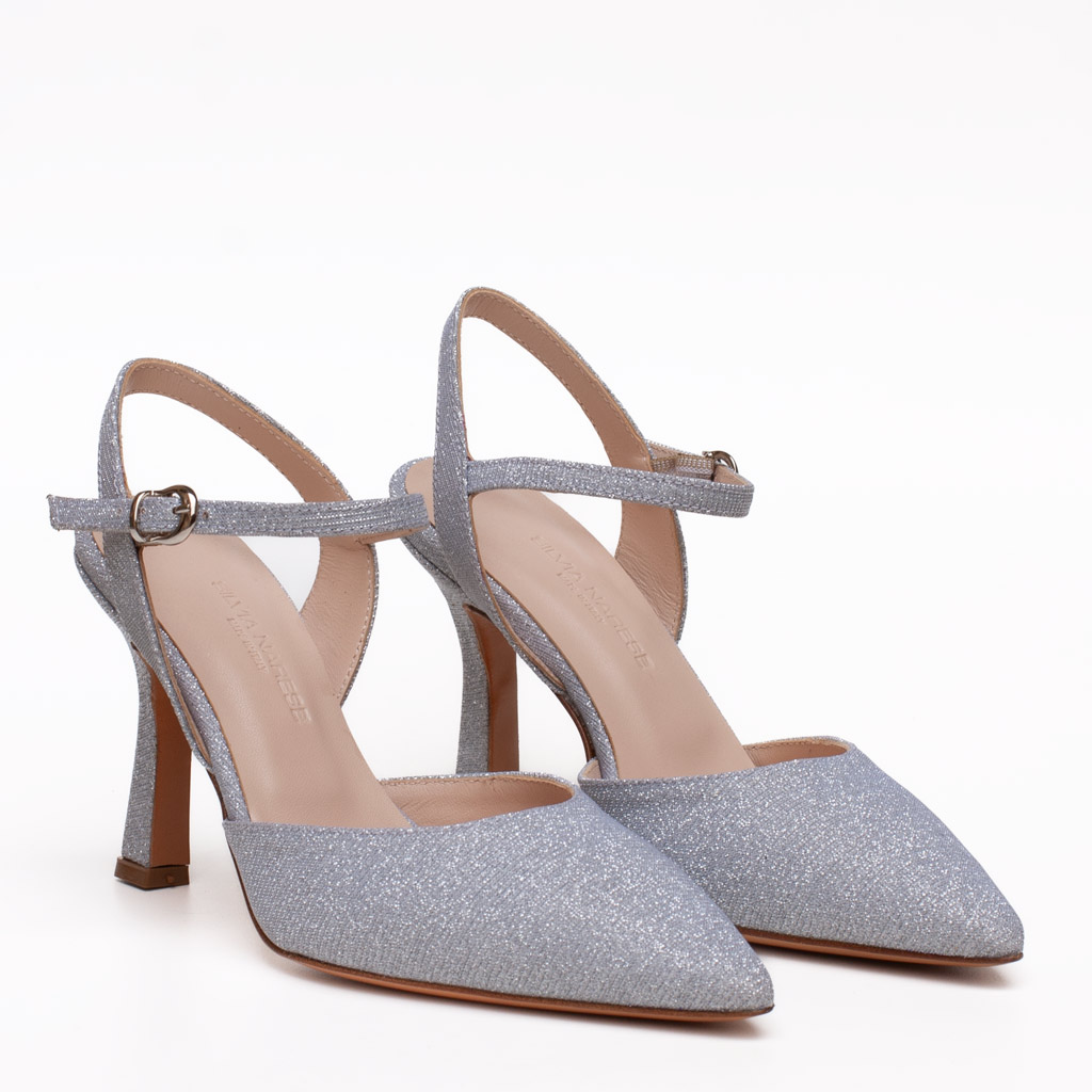 Scarpa in tessuto elegante aperta dietro con cinturino alla caviglia regolabile.ย Suola in cuoio. Altezza tacco 9 cm. Fodera in pelle. Made in Italy.