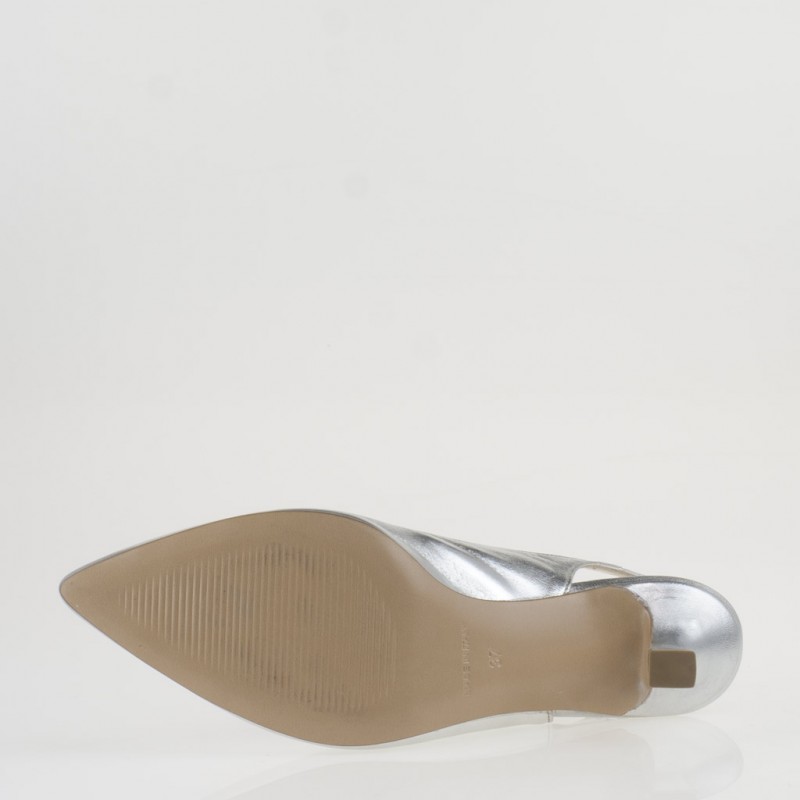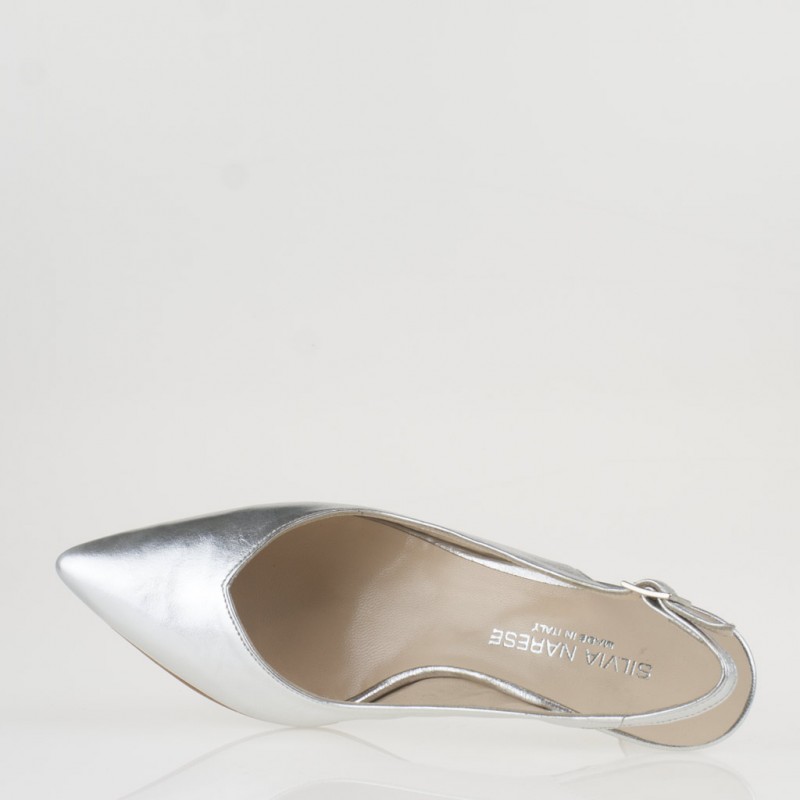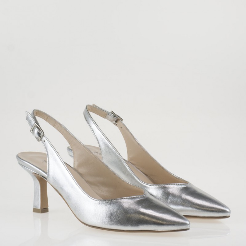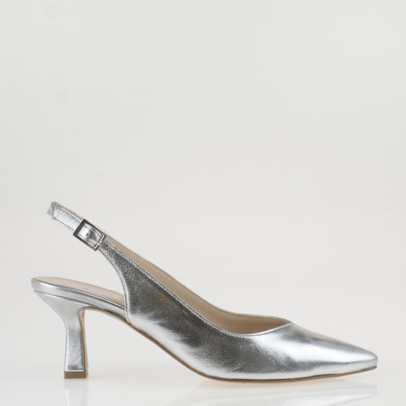 Scarpa inย pelle aperta dietro con scollatura a V profonda.ย Suola inย cuoio. Altezza taccoย 6ย cm. Fodera in pelle. Cinturino regolabile. Made in Italy.