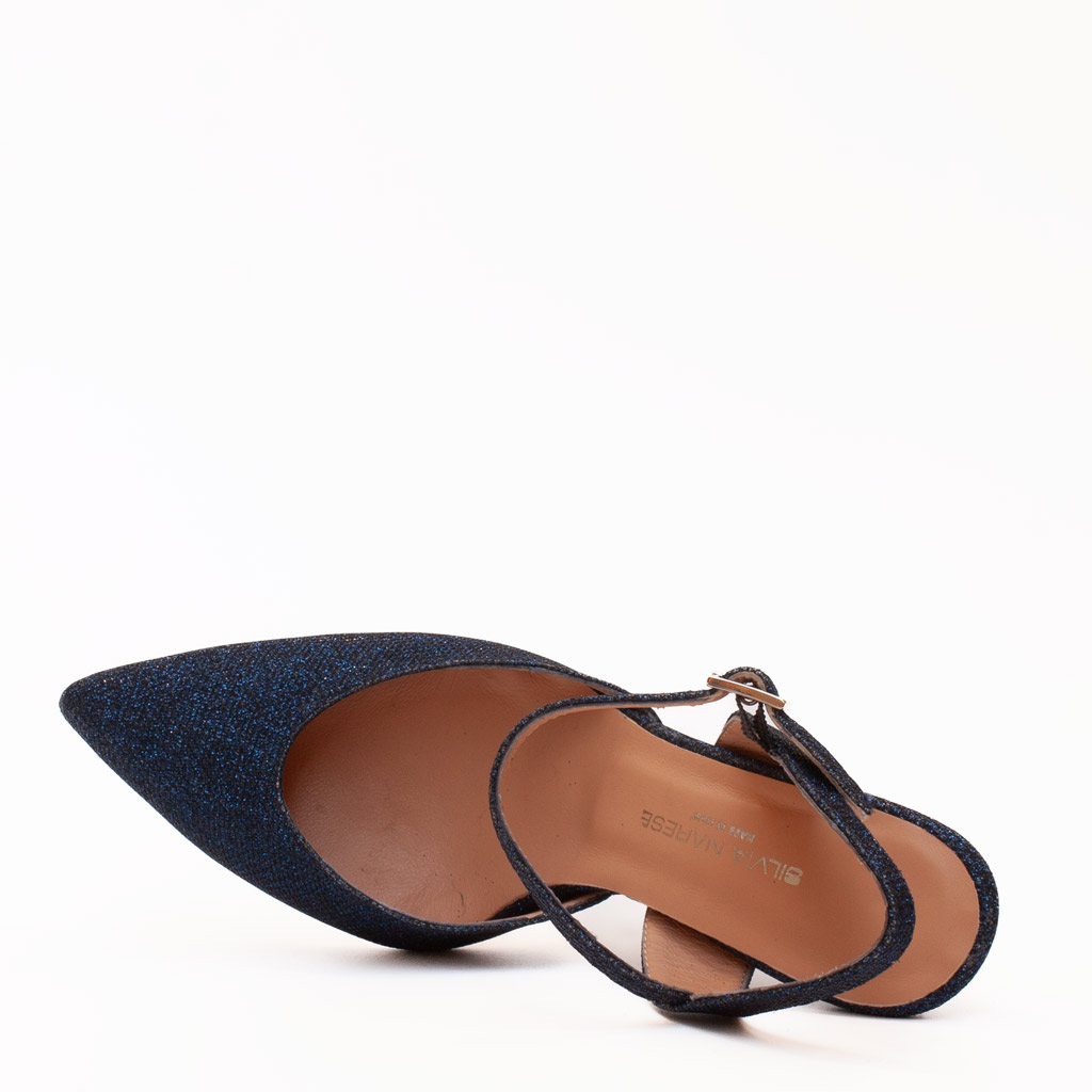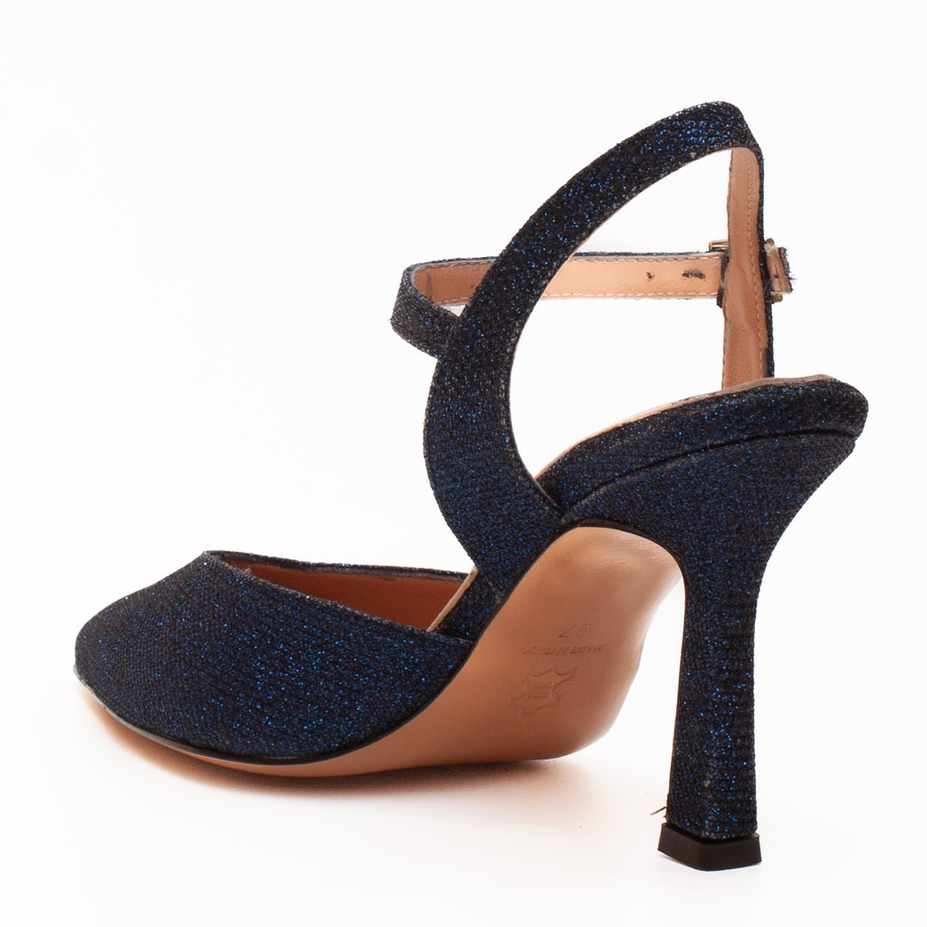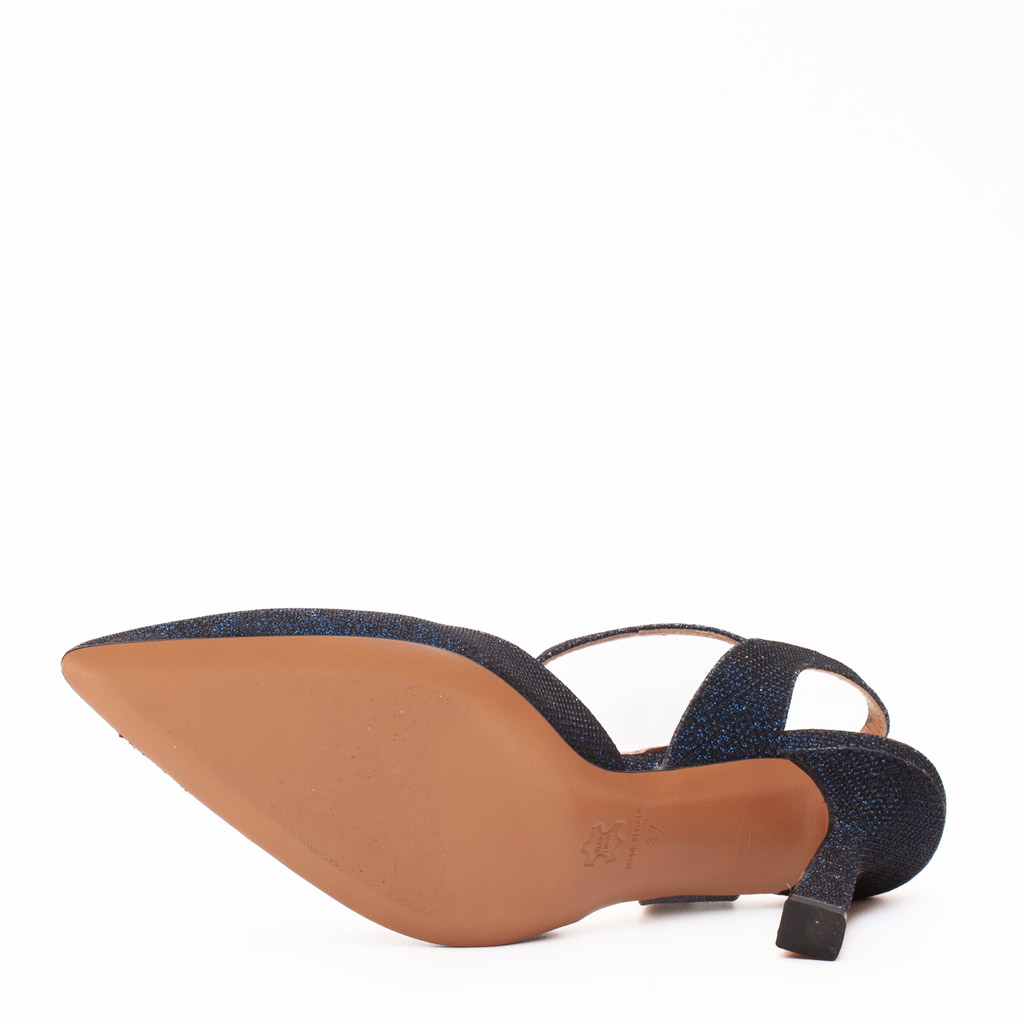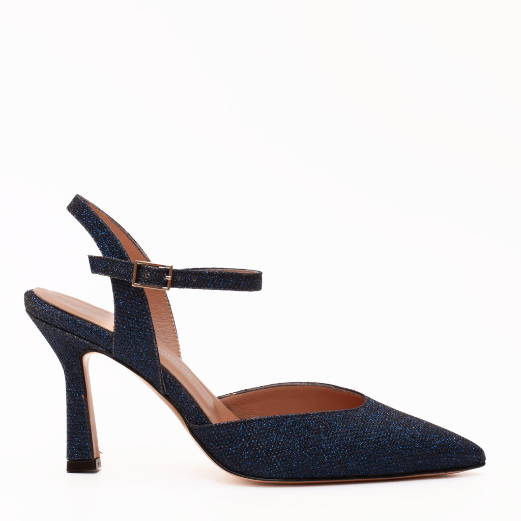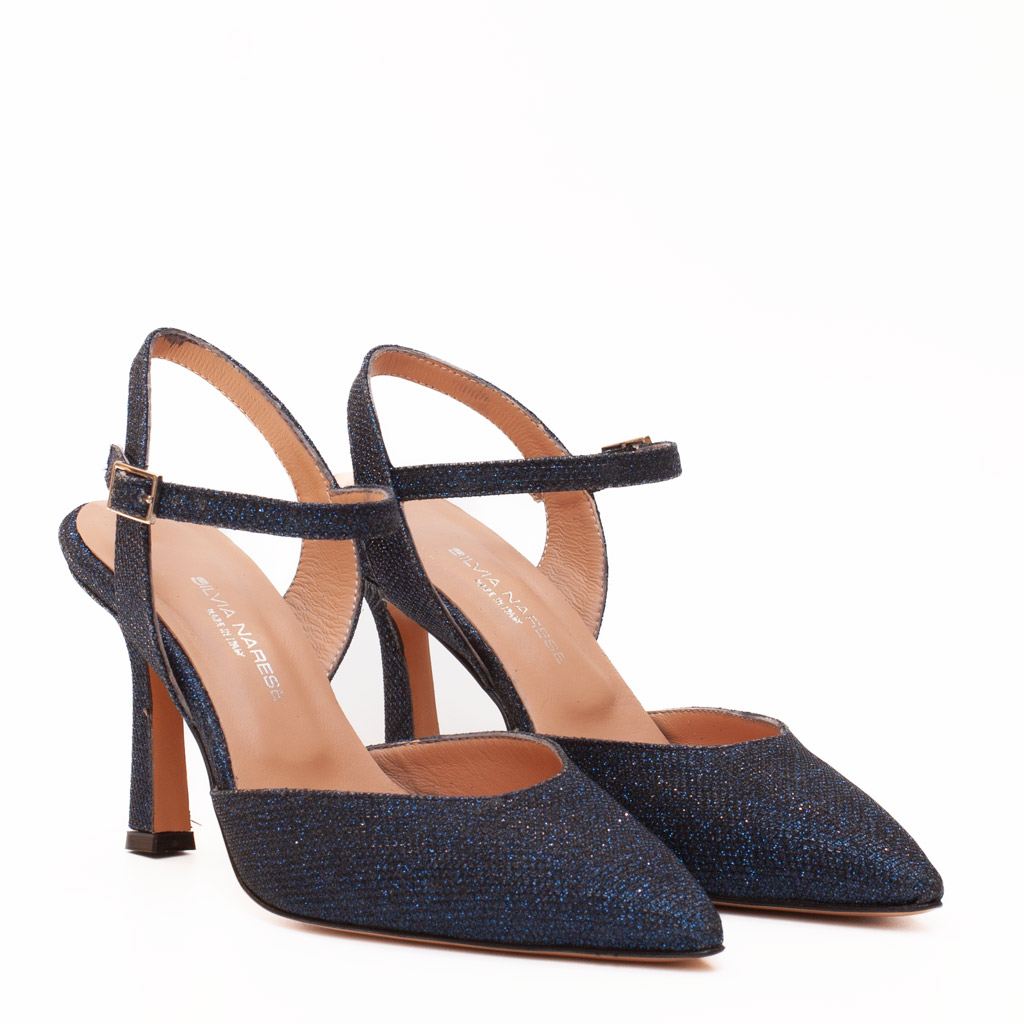 Scarpa in tessuto elegante aperta dietro con cinturino alla caviglia regolabile.ย Suola in cuoio. Altezza tacco 9 cm. Fodera in pelle. Made in Italy.