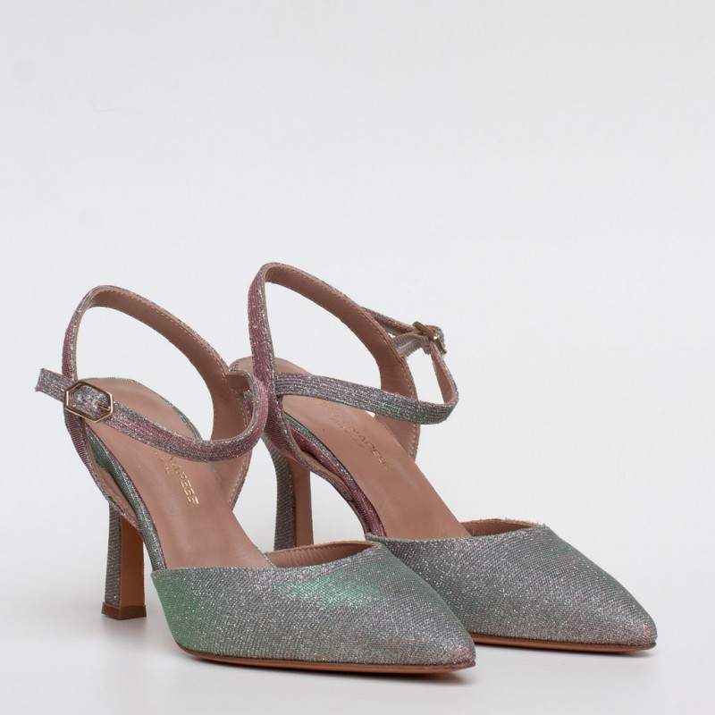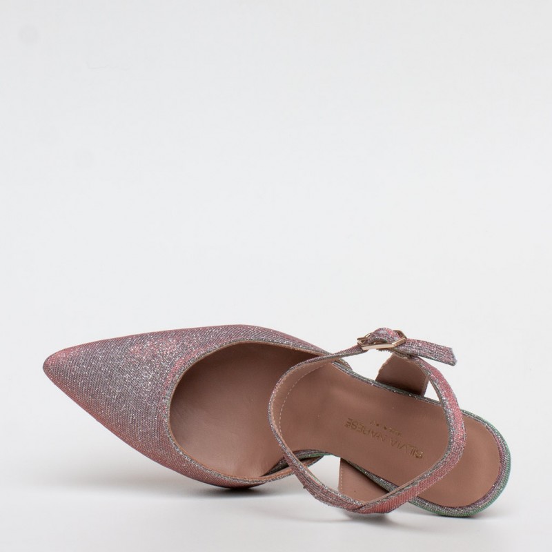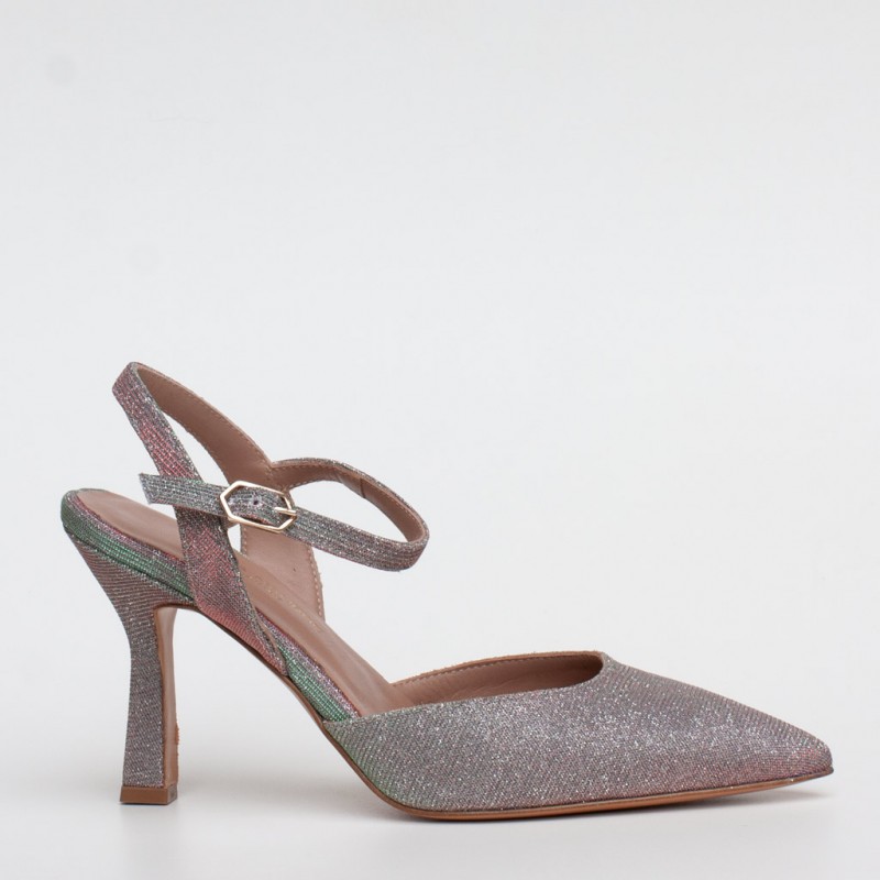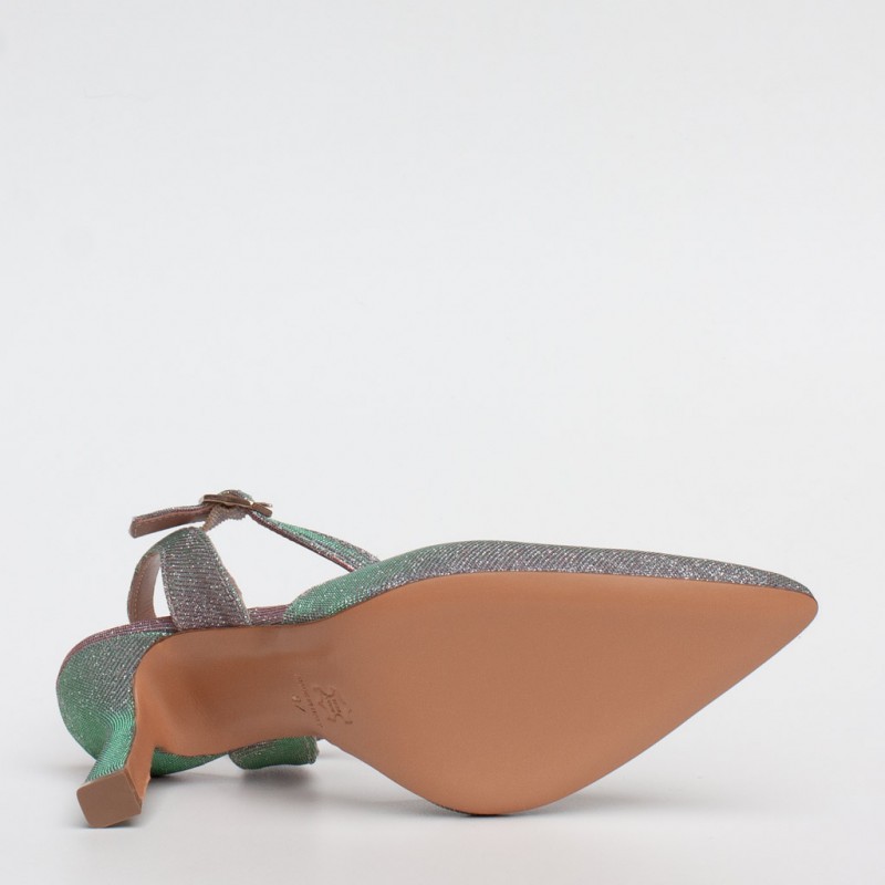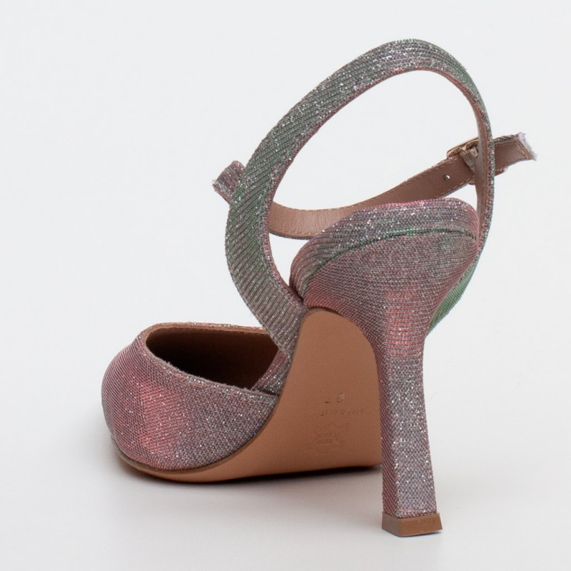 Scarpa inย tessutoย ย aperta dietro con cinturinoย alla caviglia regolabile.ย Suola in cuoio. Altezza taccoย 10 cm. Fodera in pelle. Made in Italy.
