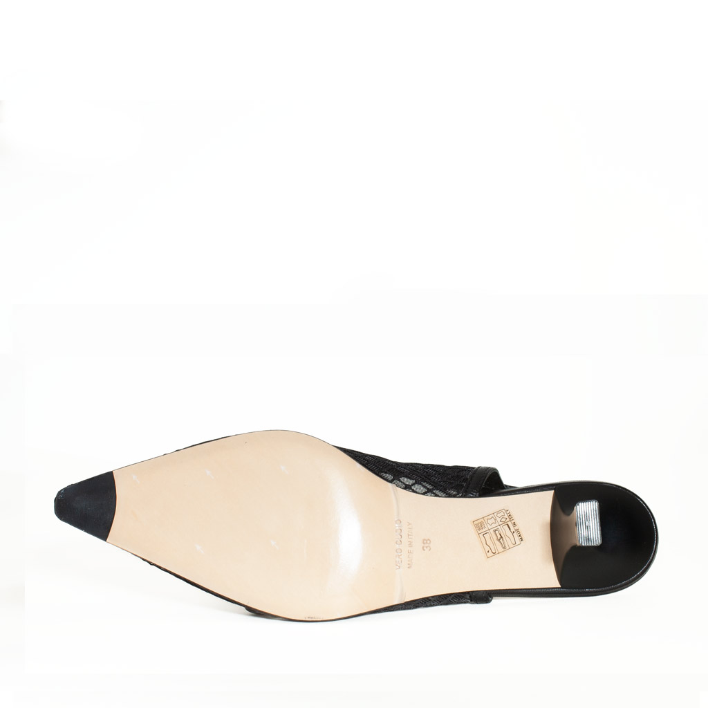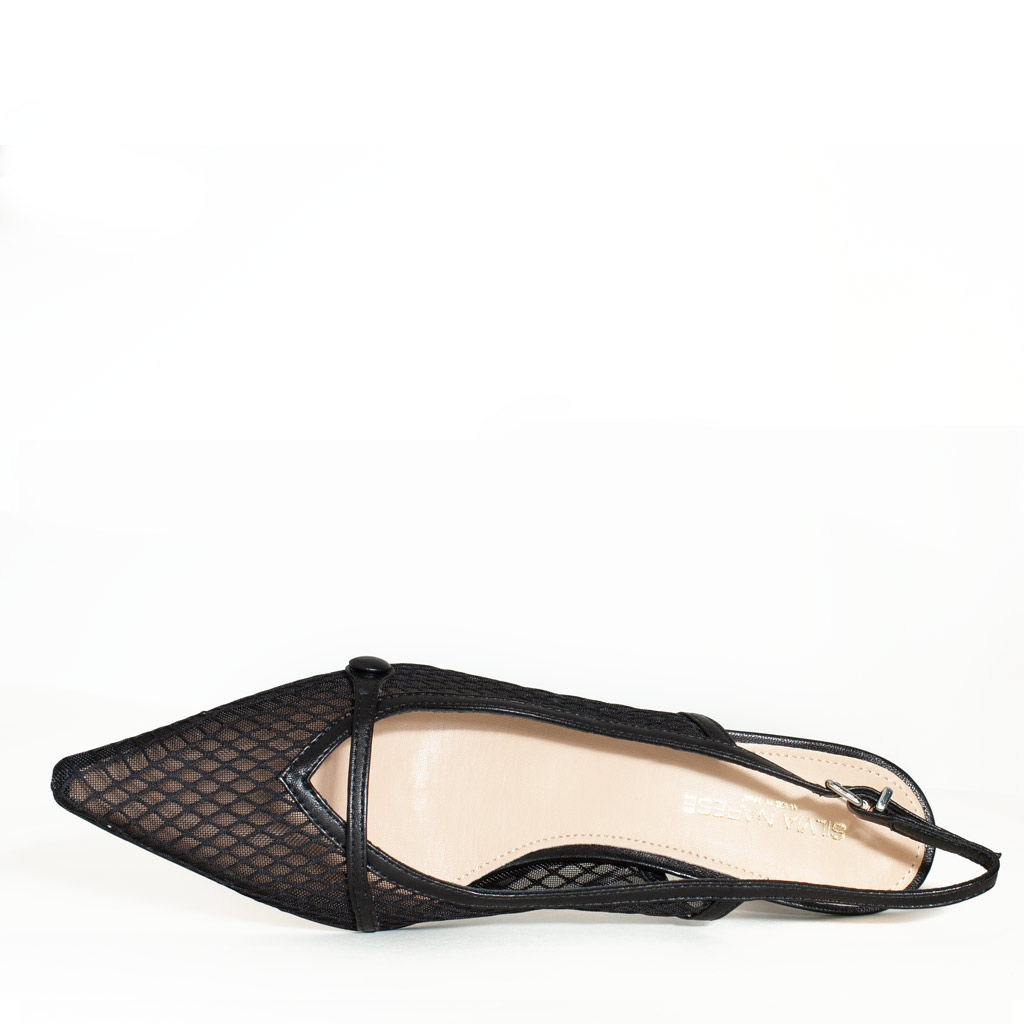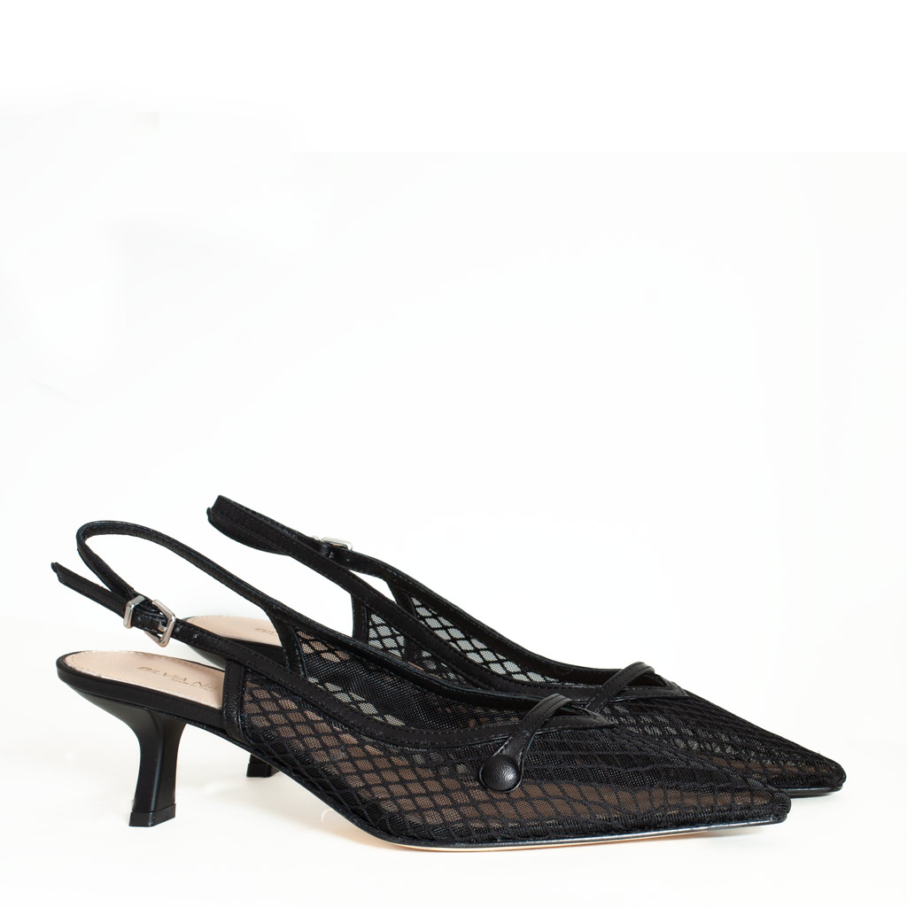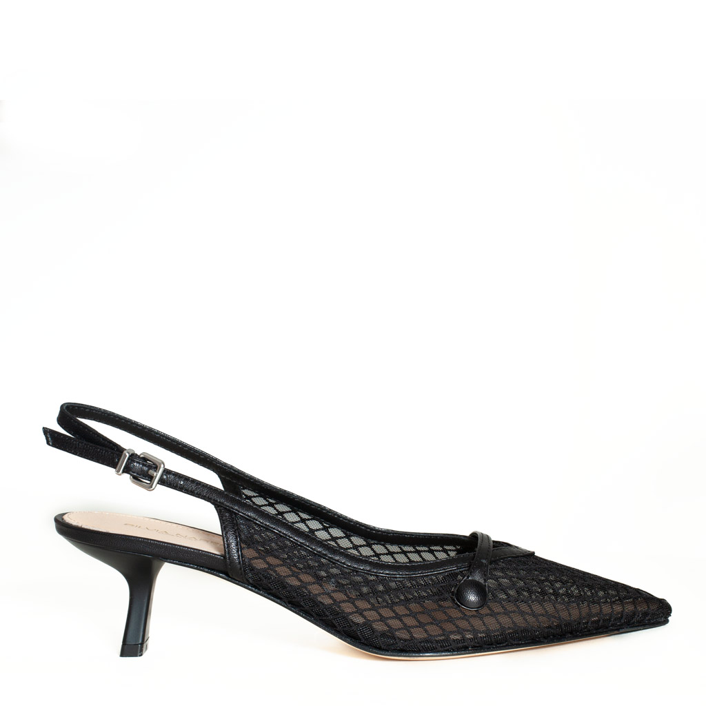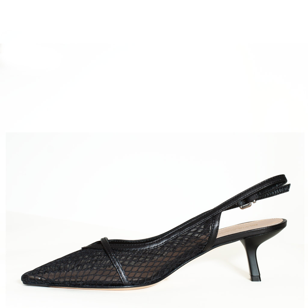 La struttura di questa slingback color neroย รจ studiata per offrire una calzata impeccabile. La tomaia presenta una lavorazione in rete che garantisce unโottima traspirabilitร durante le giornate piรน calde. I profili in pelle definiscono la silhouette a punta, mentre il cinturino posteriore regolabile con fibbia metallica assicura stabilitร ad ogni passo.