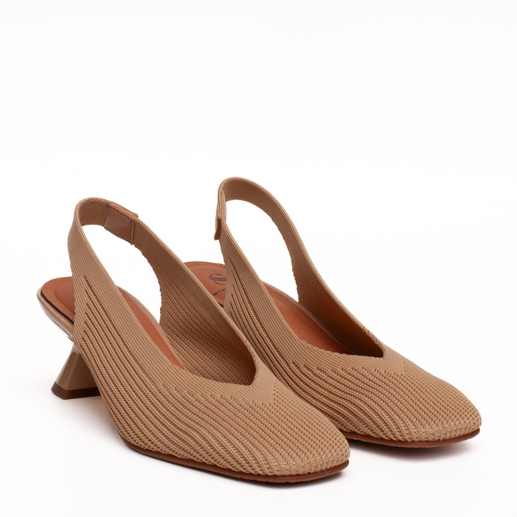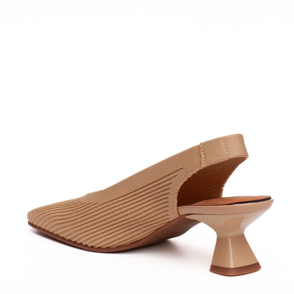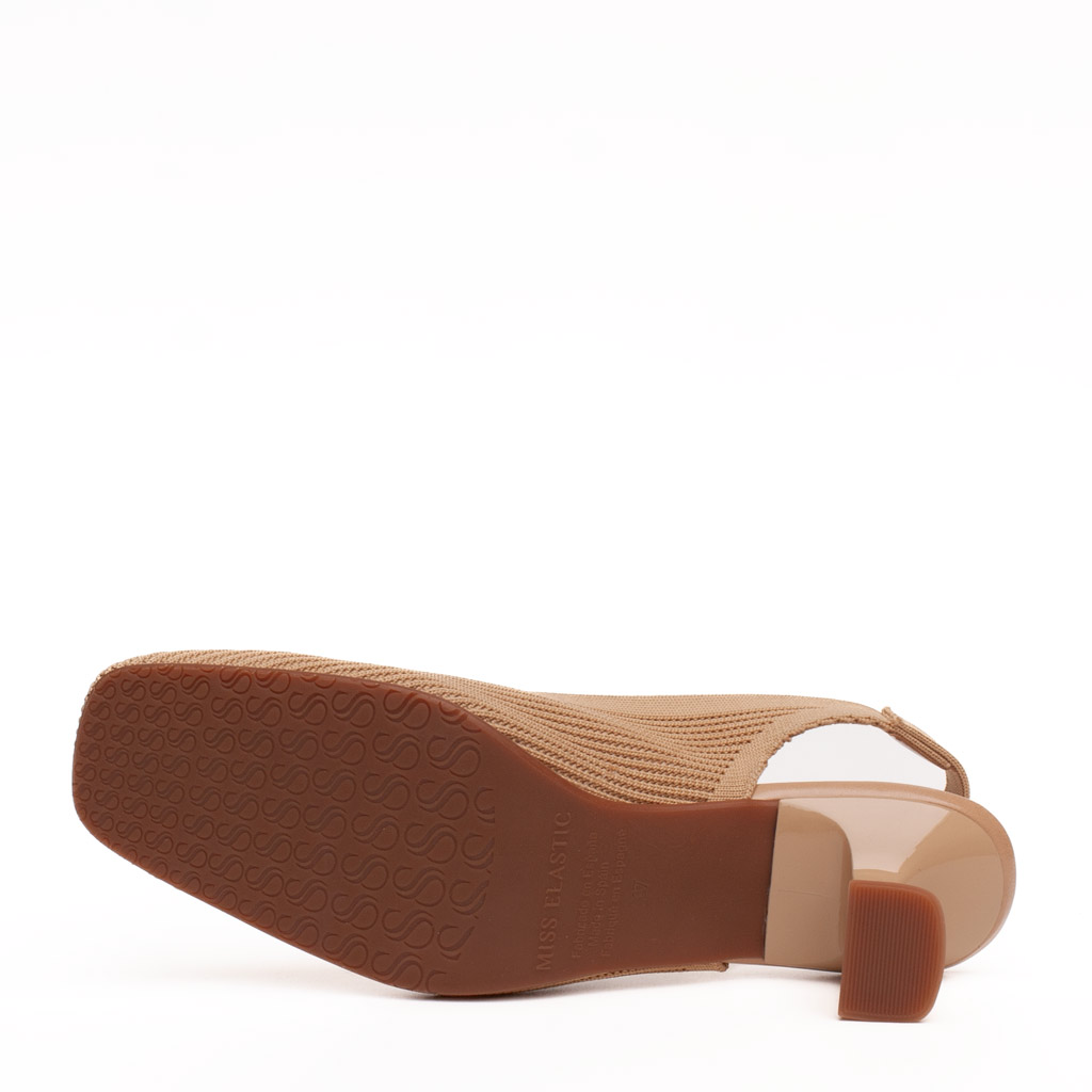 Scarpa aperta dietro con tacco, realizzata in tessutoย eco-elastico camel, ha la punta quadrata e la scollatura a V. Soletta in tessuto antibatterico con cuscinetto morbido. Suola in gomma. Realizzato in Spagna.
