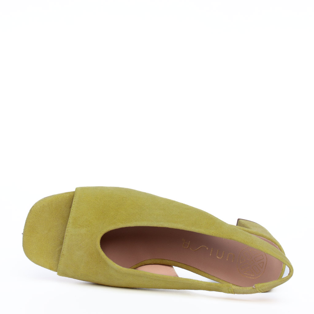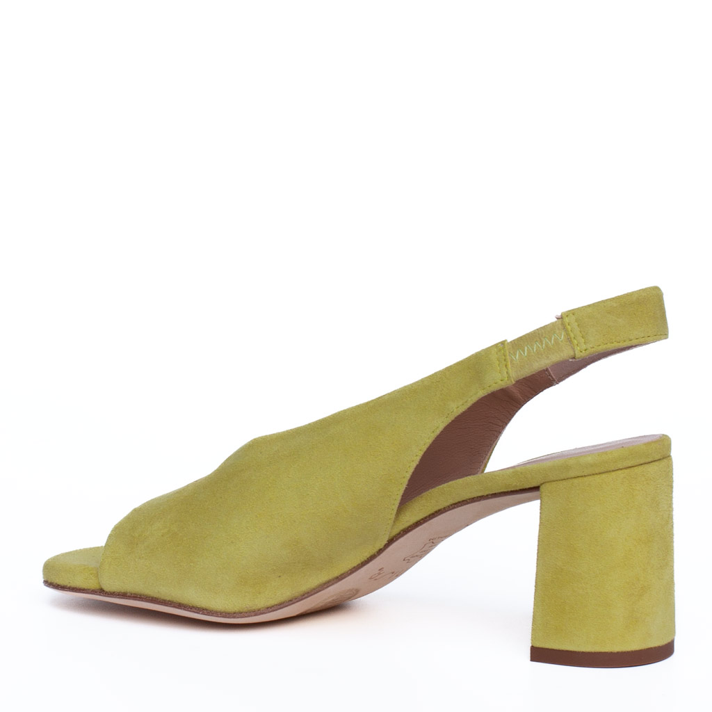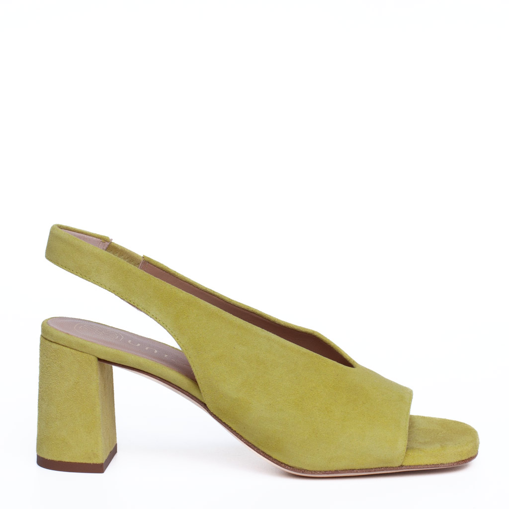 Scarpa aperta dietro in camoscio. Punta aperta.ย Cinturino sul tallone con elastico. Altezza tacco 7 cm. Suola in cuoio. Fodera in pelle.