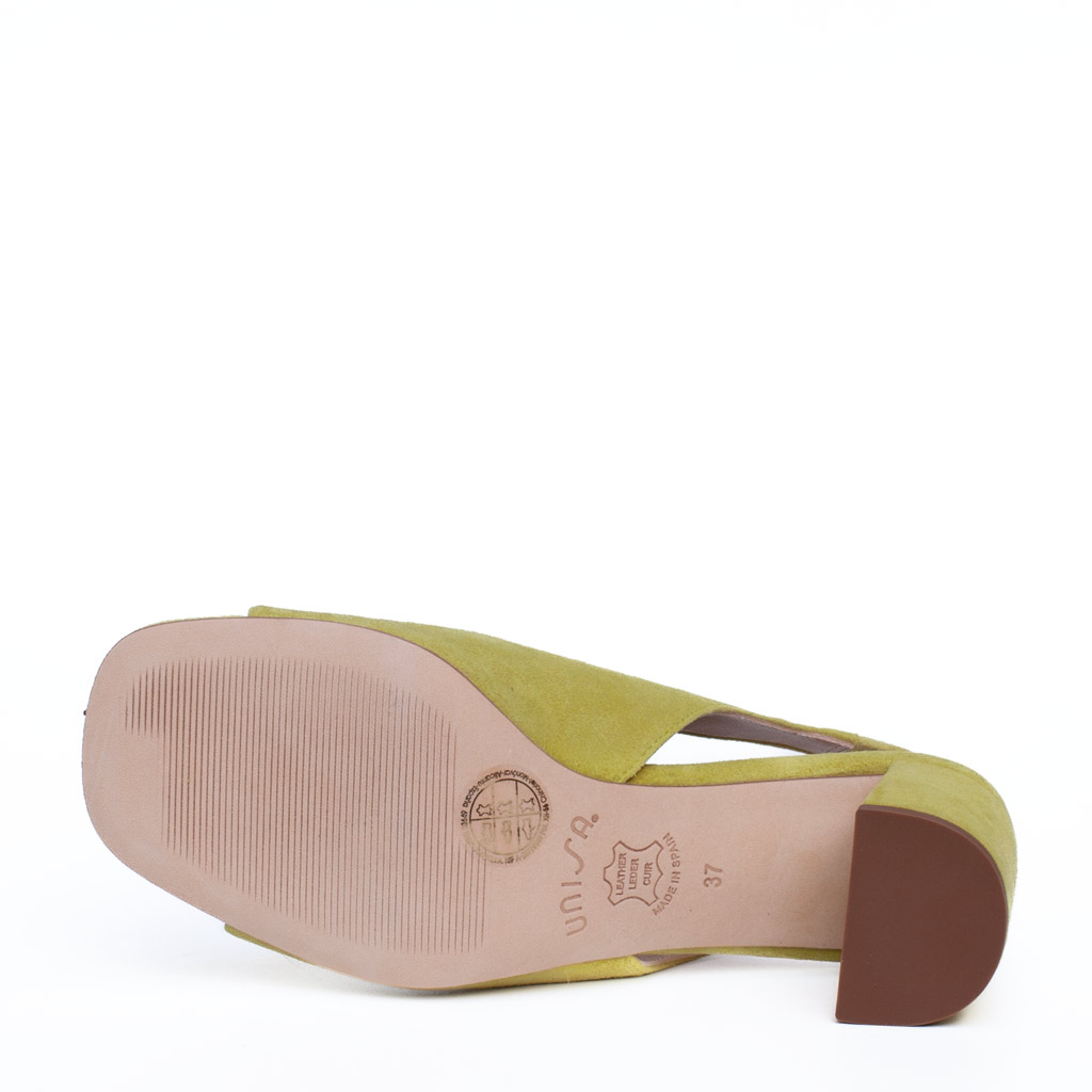 Scarpa aperta dietro in camoscio. Punta squadrata aperta.ย Cinturino sul tallonecon elastico. Altezza tacco 7 cm. Suola in cuoio. Fodera in pelle.