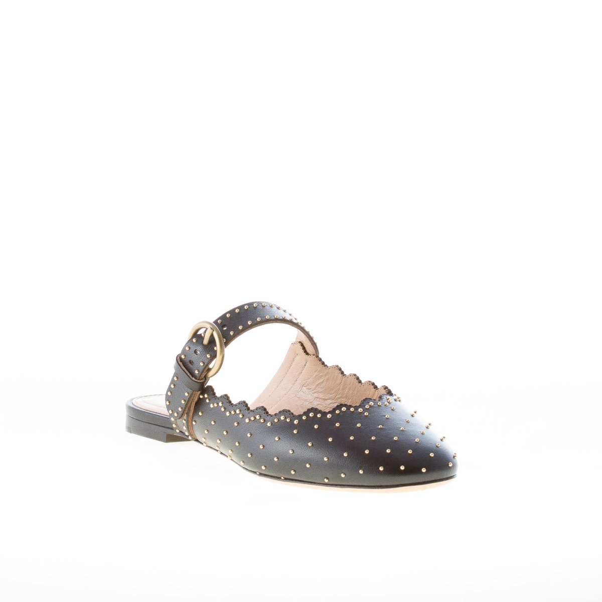 Black napa leather Lauren mule with the iconic scalloped trim and a gold-tone studs embellishment. Ankle strap with a round brass-finished buckle. Leather sole