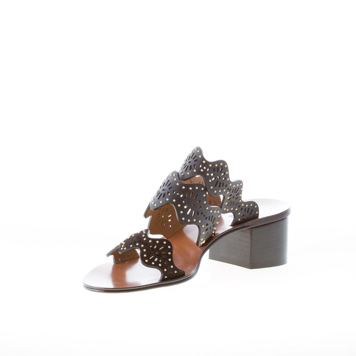 Sandalo slide in pelle nera con tre fasce dall’iconico contorno smerlato con forature geometriche. Abbellimento con un’applicazione di piccole borchiette in metallo dorato. Tacco di 4 cm. Suola in cuoio