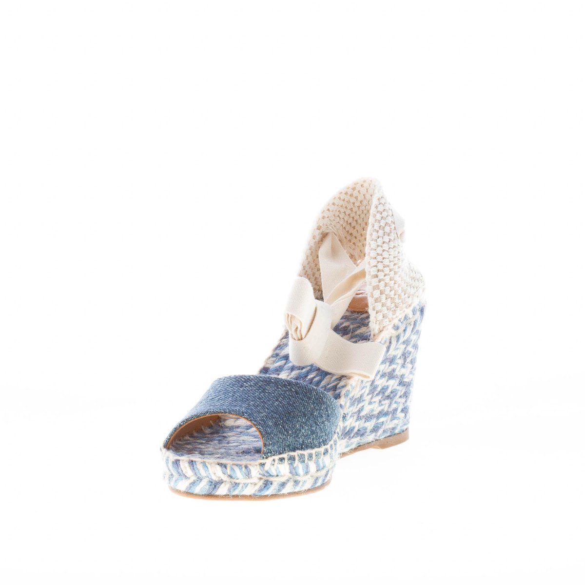 Blue denim and ecru fabric Piia wedge sandal with an ankle tie in branded beige fabric and a raffia covered wedge. Rubber sole. Wedge height 8 cm