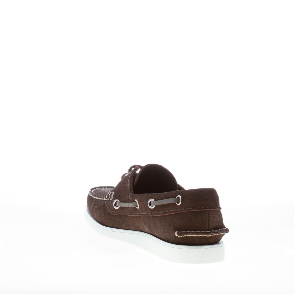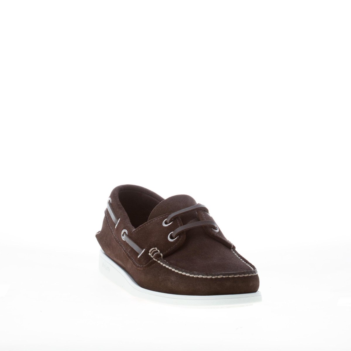 Scarpa da barca Marske realizzata in pelle scamosciata testa di moro con cuciture a contrasto lungo la vaschetta e occhielli in metallo. Classici dettagli riportati a mano sulla mascherina interna. Suola in gomma chiara a contrasto