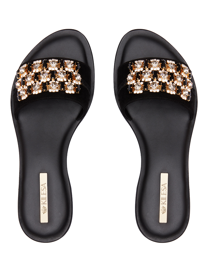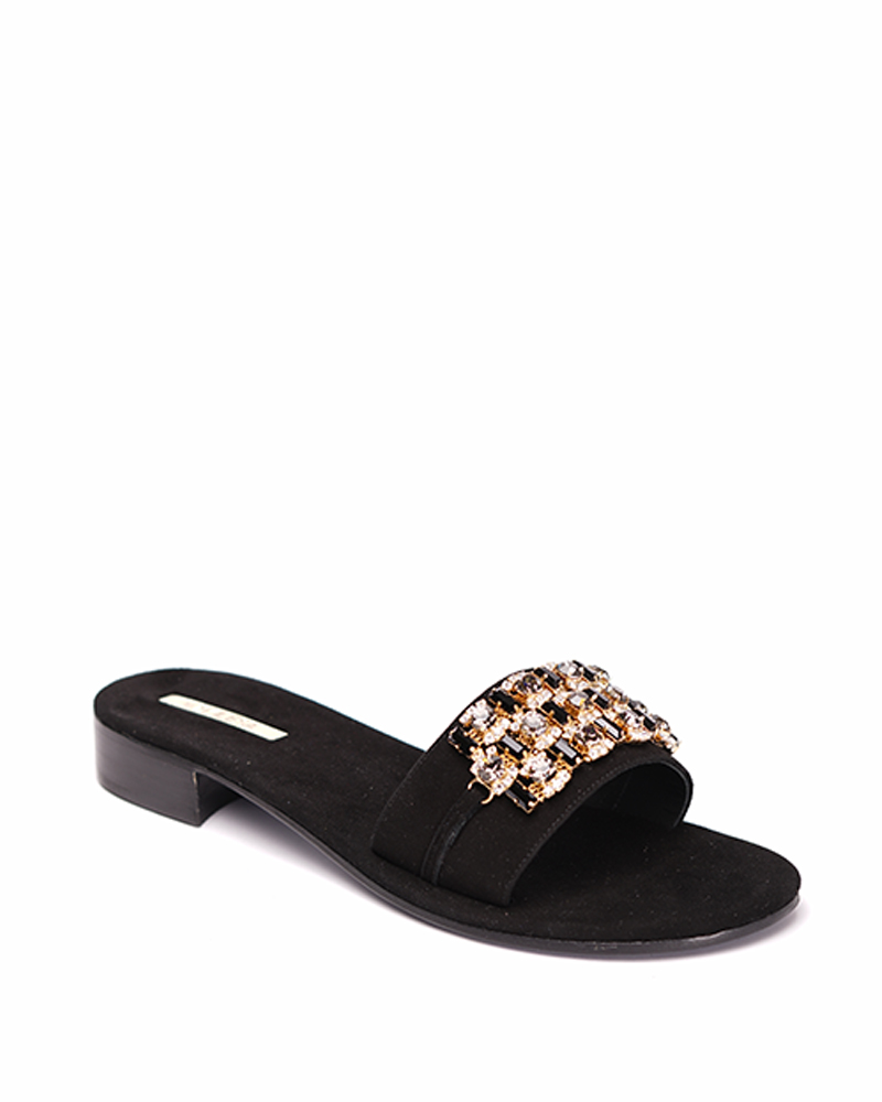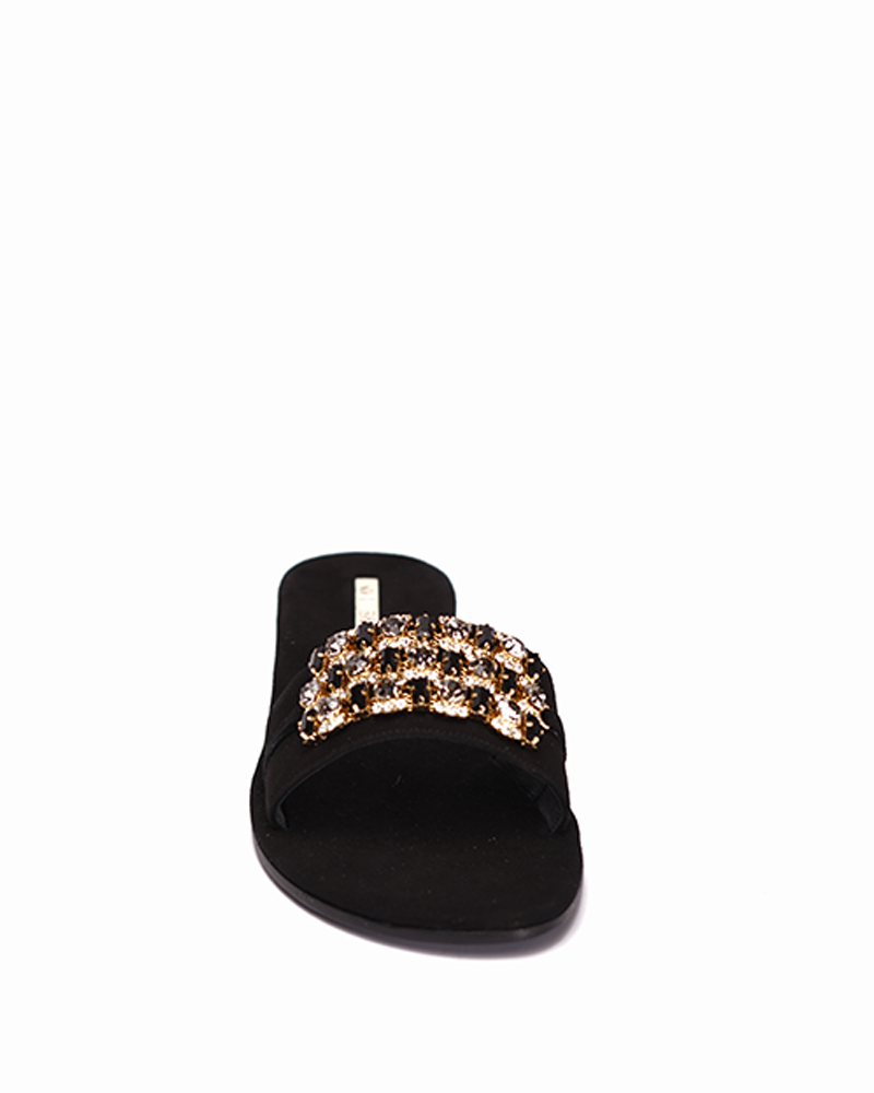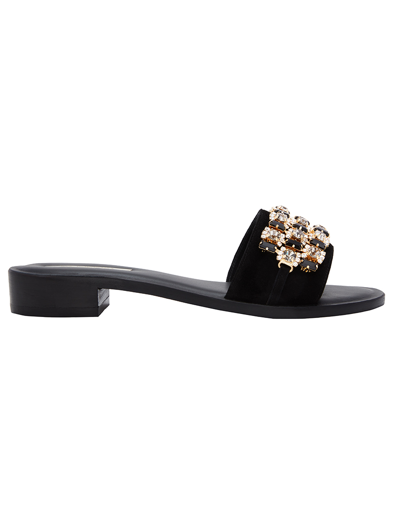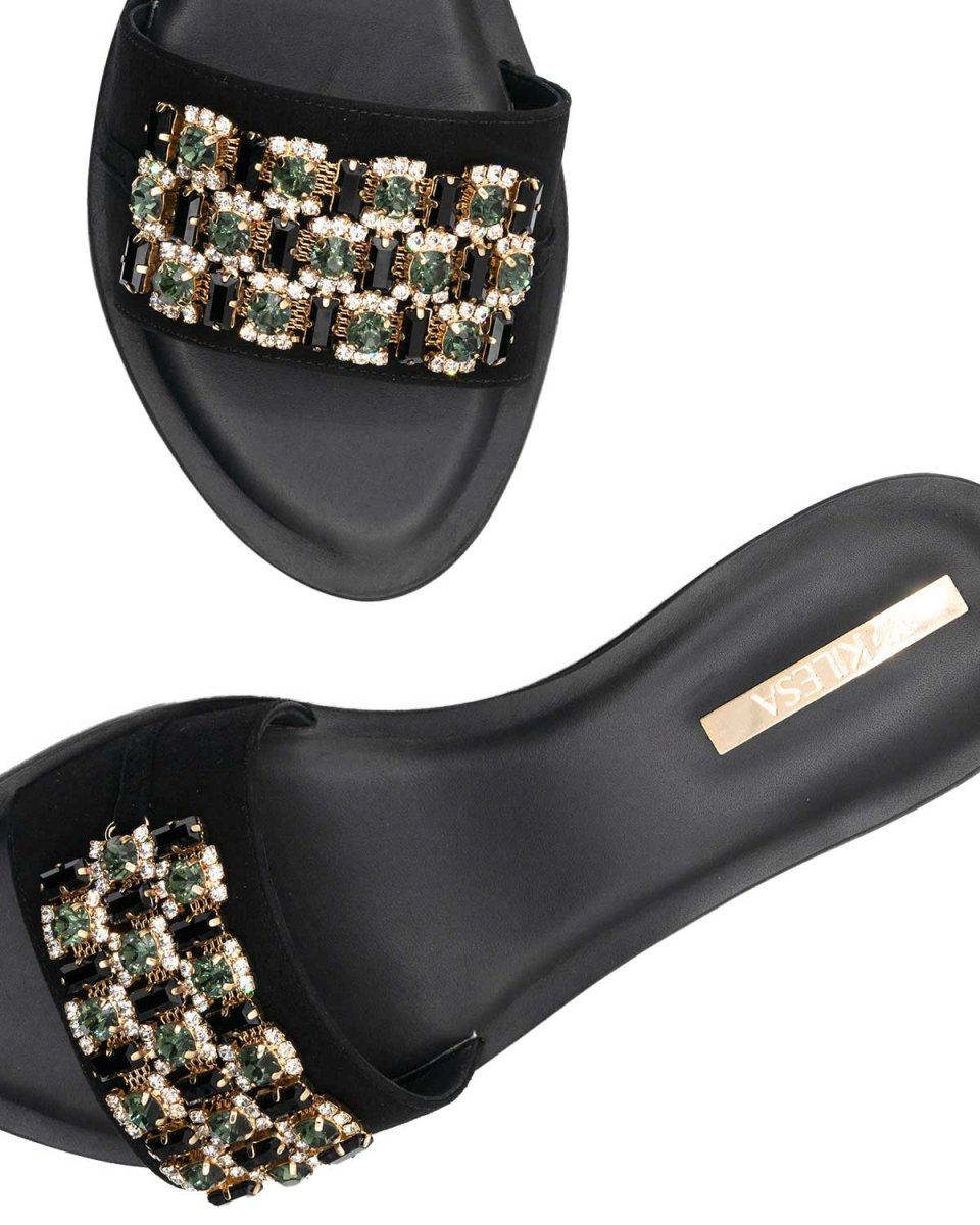 Questi sandali ciabatta presentano una fascia nera in morbido camoscio e sono impreziositi da file di cristalli Swarovski.
