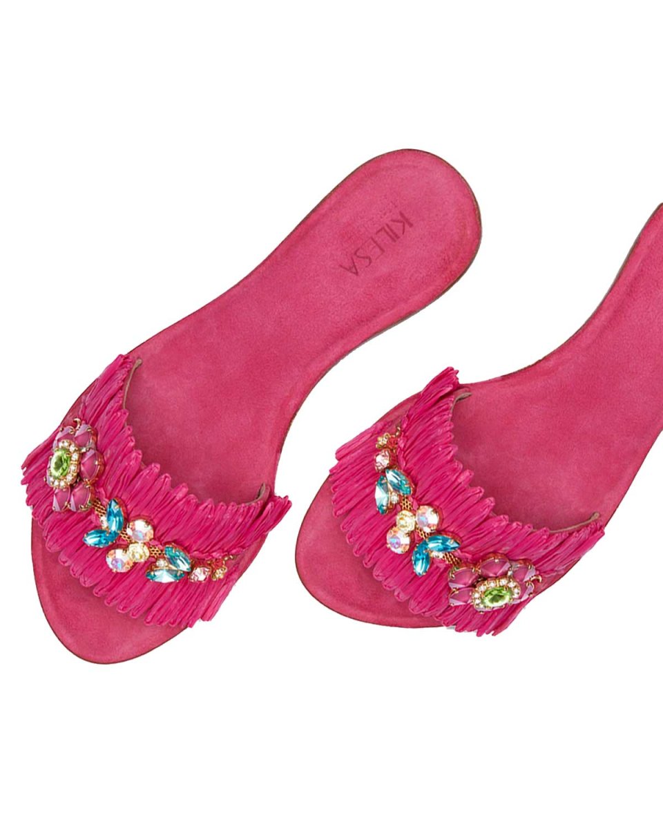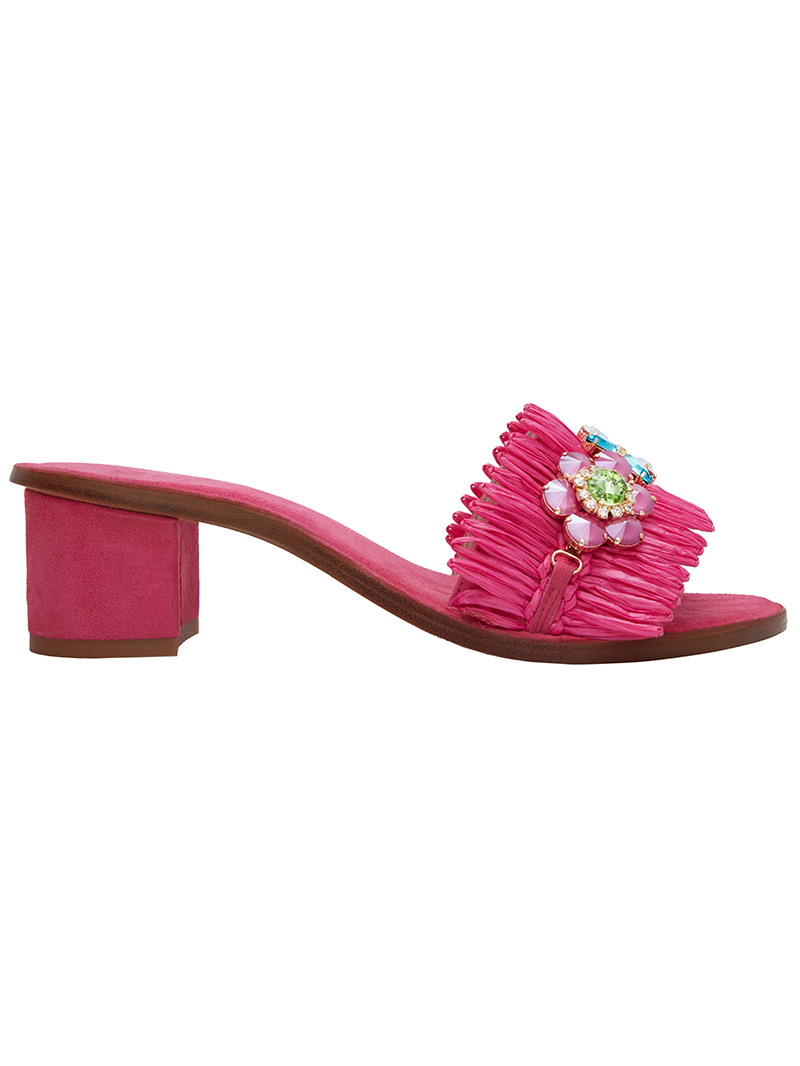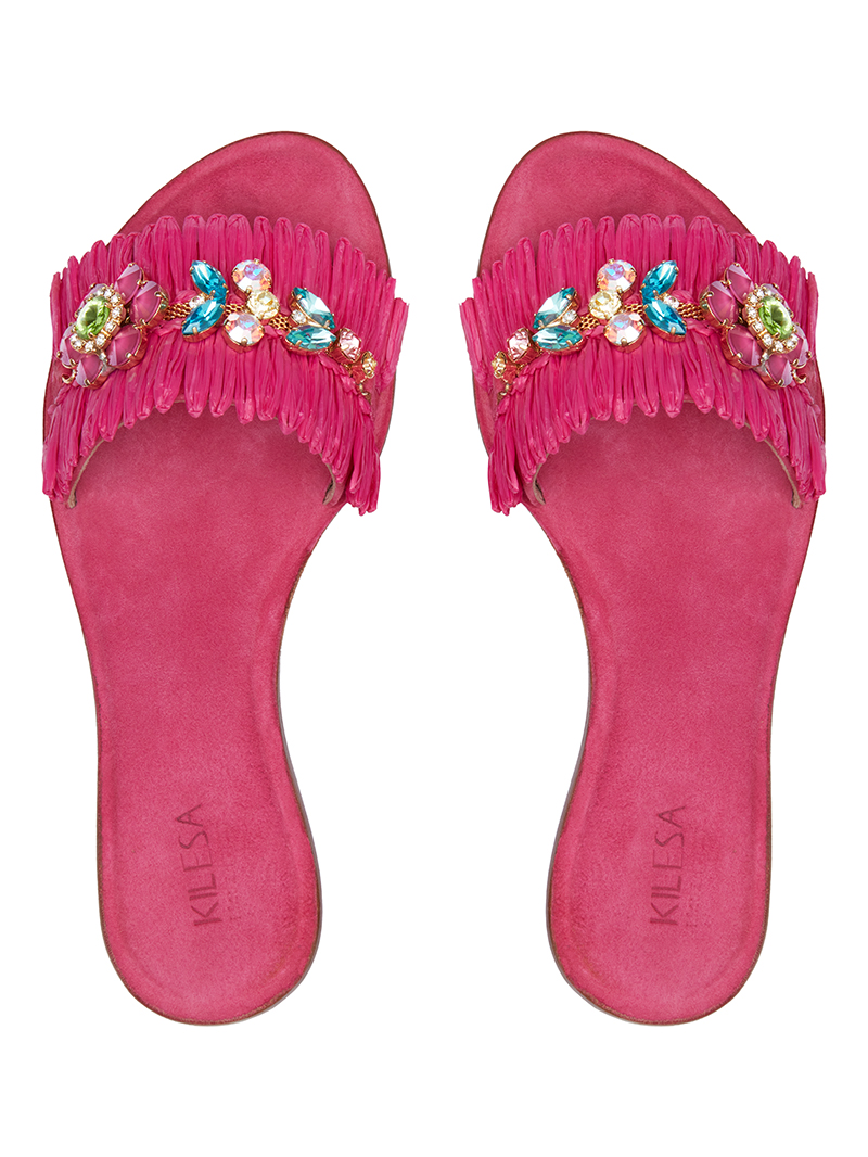 Ciabatta in suede rivestita in rafia e con applicazioni Swarovski