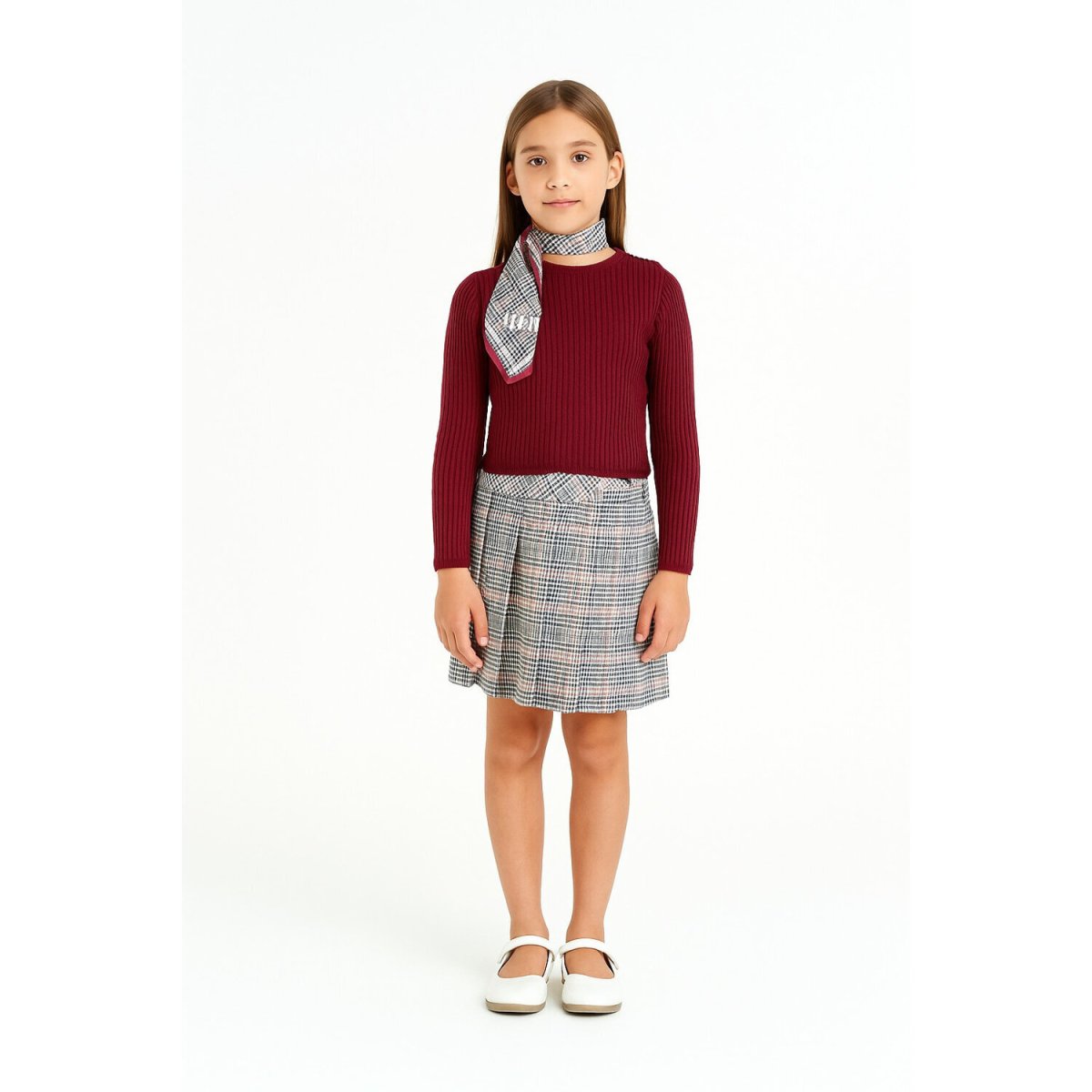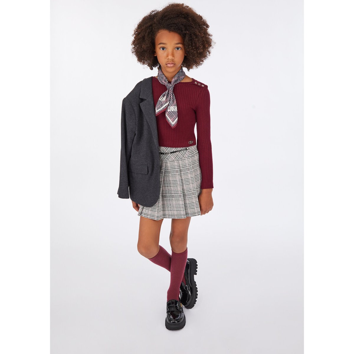 Completo composto da -) Gonna a pieghe in jersey di misto viscosa stretch Motivo check all over Cinturino con charm logo -) Maglia in misto viscosa a coste Taglio girocollo Bottoni sulla spalla Maniche lunghe Logo in metallo al fondo -) Foulard stampato con logo Made in Italy N.B. il blazer non è compreso