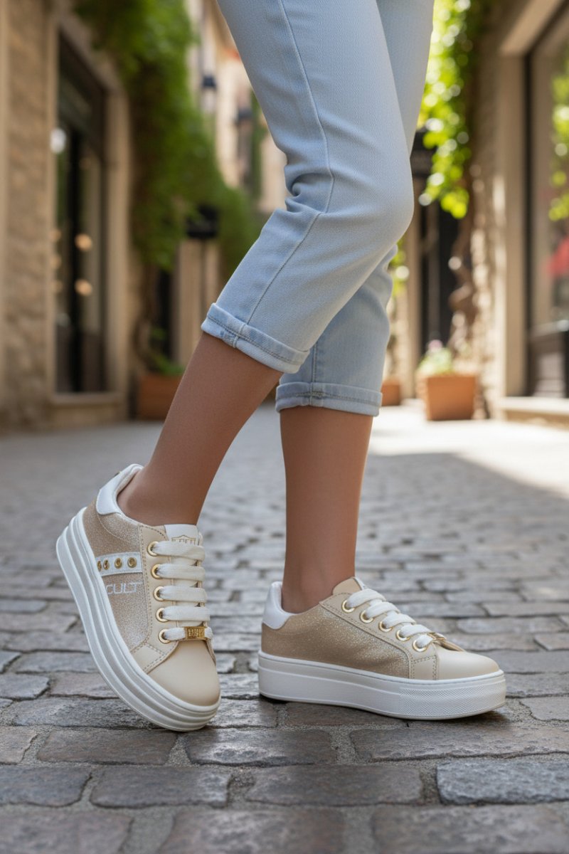 Questa sneakers CULT รจ un modello dallo stile casual-glam, perfetto per un look urbano ma ricercato. โScritta CULT laterale a contrasto. โLogo sulla linguetta. โPlacchetta dorata logata applicata sui lacci.