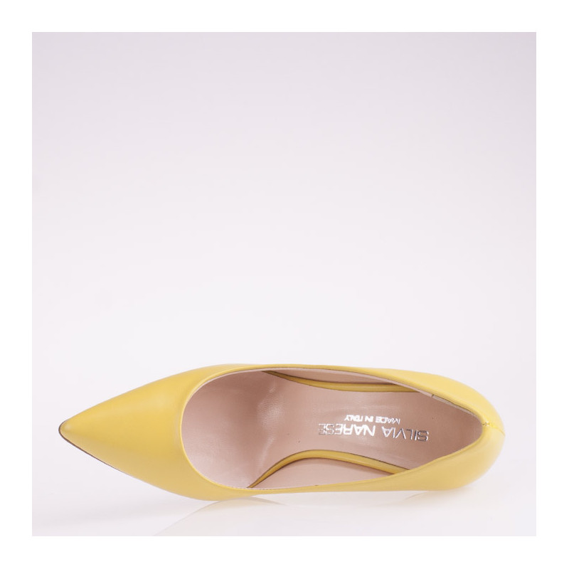 Scarpa in pelle gialla con tacco alto. Suola in cuoio . Altezza tacco 9 cm. Tacco foderato. Fodera in pelle. made in Italy.