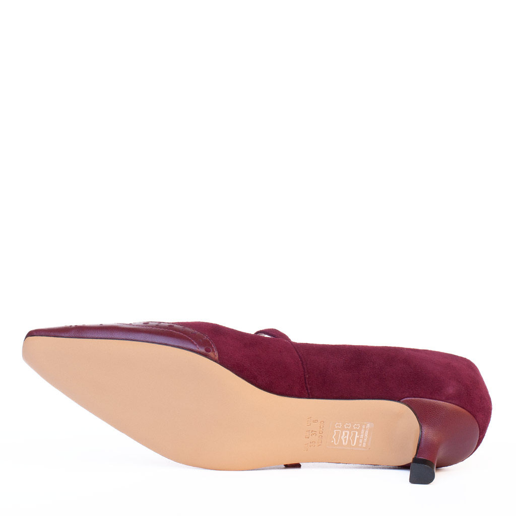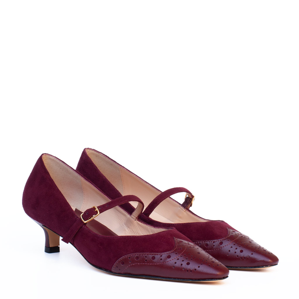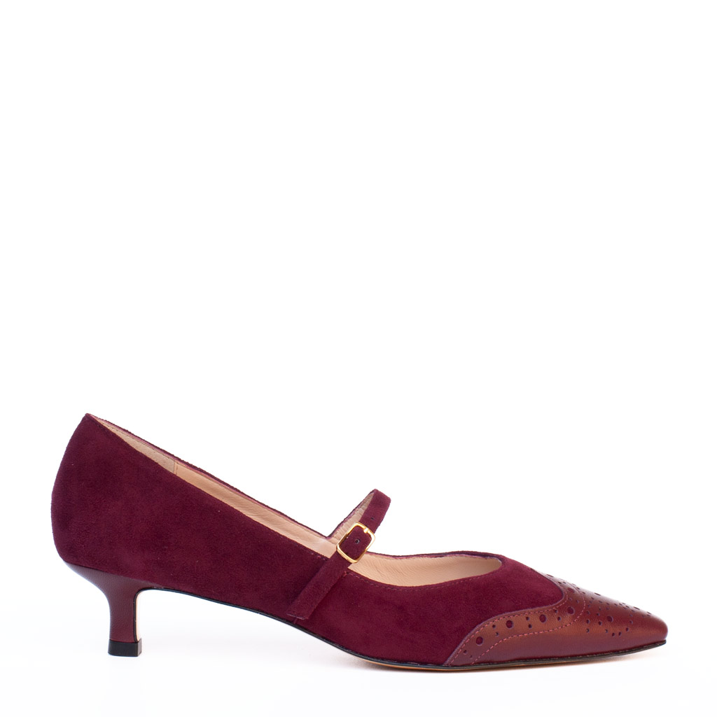 Eleganti décolleté Mary Jane in bordeaux con raffinati dettagli brogue, cinturino regolabile e tacco medio. Perfette per look sofisticati e occasioni speciali.