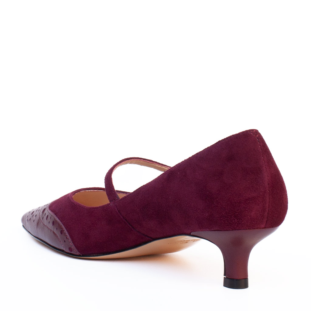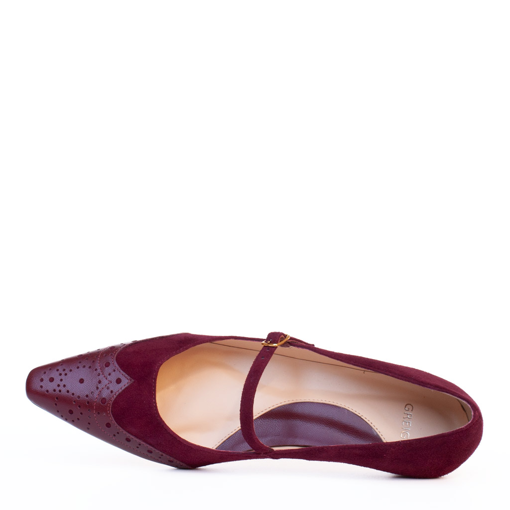 Queste splendide décolleté Mary Jane rappresentano il perfetto connubio tra tradizione e modernità. Realizzate in un ricco colore bordeaux, sono caratterizzate da un design sofisticato che unisce la classica silhouette a punta con dettagli decorativi che le rendono uniche. Mary Jane con cinturino regolabile sul collo del piede con fibbia dorata. Tacco medio di 4 cm, ideale per il comfort quotidiano. Punta affusolata per un look elegante e femminile. Suola in cuoio. Combinazione di camoscio e pelle liscia per un effetto texture.