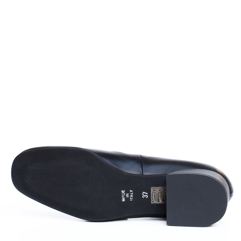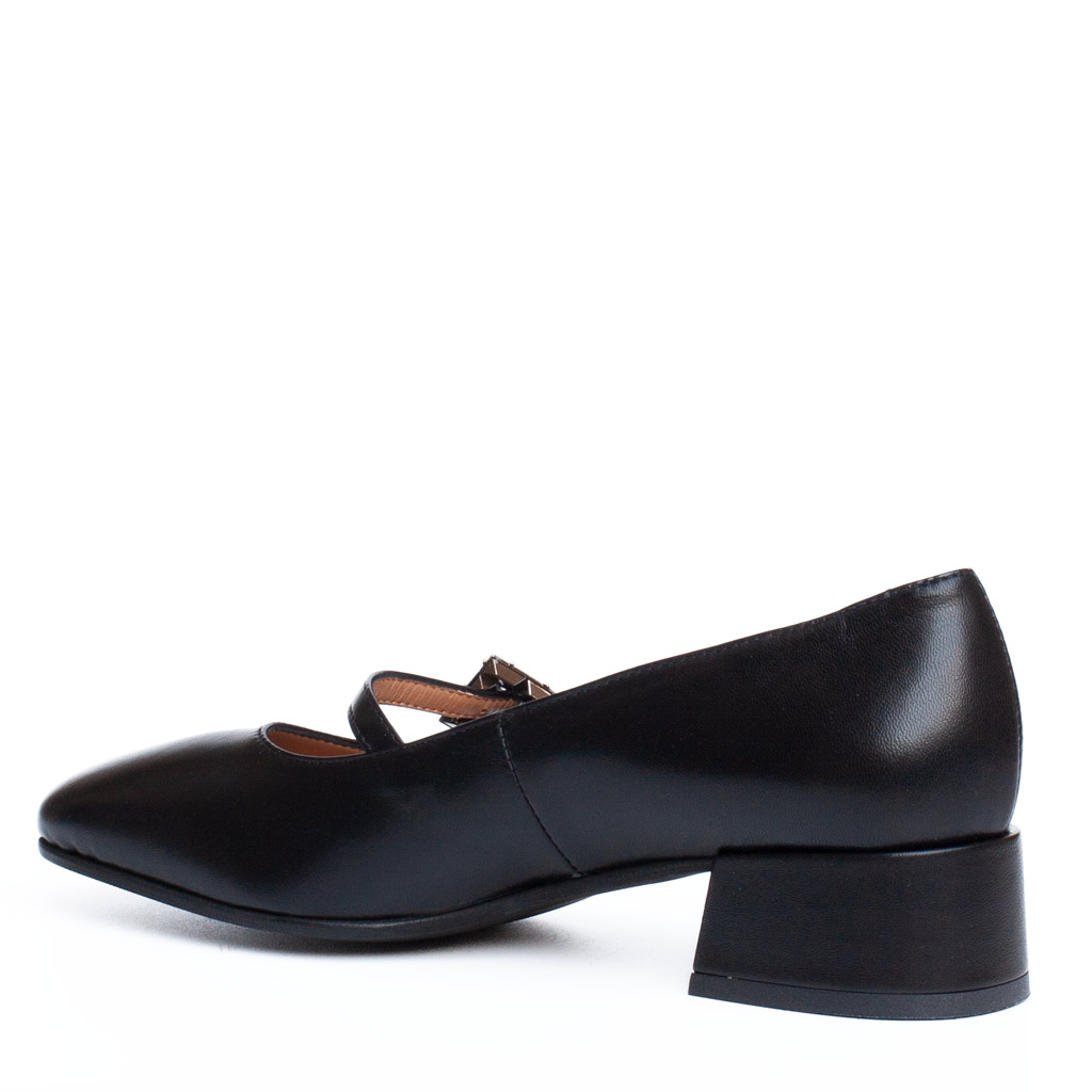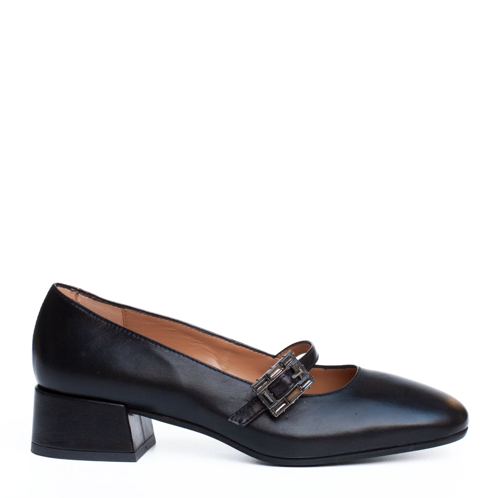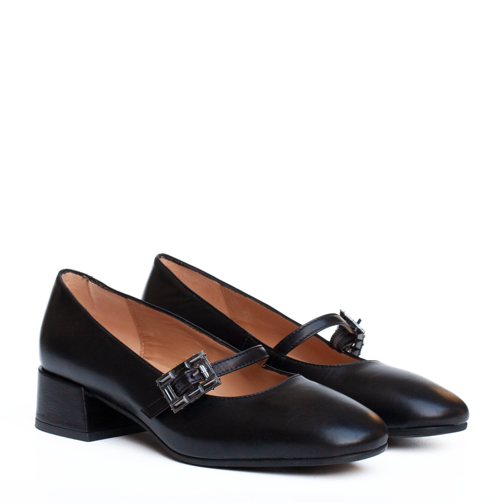 Décolleté nere in pelle con tacco quadrato . Il tacco quadrato è comodo e stabile, ideale per l’uso prolungato. Il cinturino sul collo del piede è decorato con una luminosa fibbia gioiello. Uniscono comfort, praticità ed eleganza senza tempo. Perfette per completare outfit formali e casual chic.