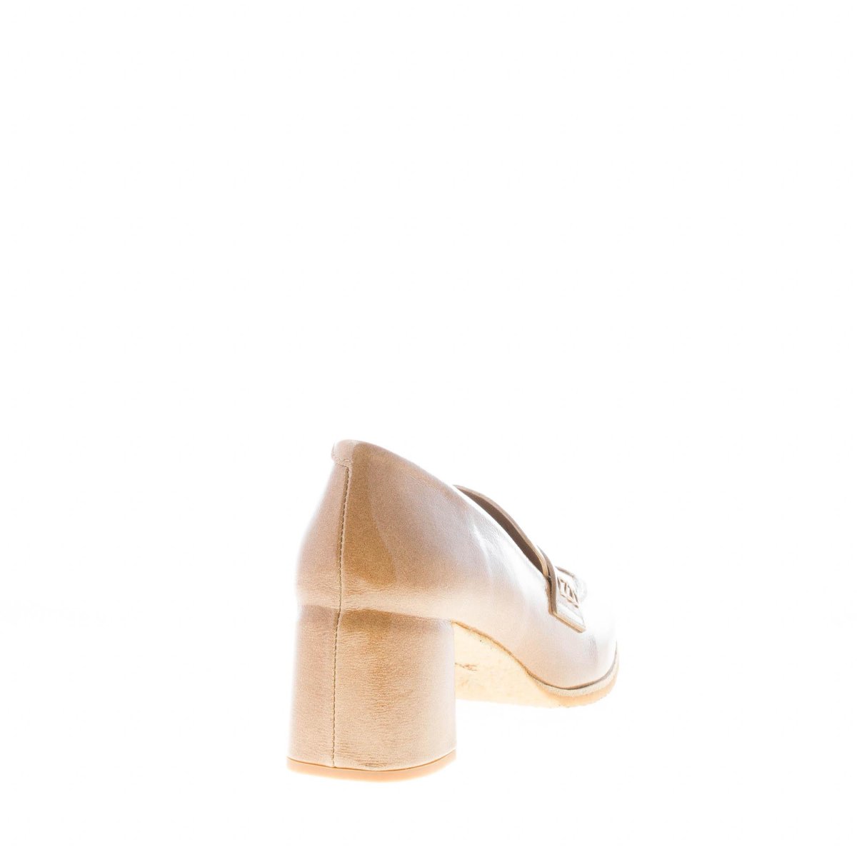 Olmo beige shiny leather Holly loafer with a front classic penny bar and apron stitching at the round toe.ย Comfortable and flexible para outsole. Heel 5,5 cm