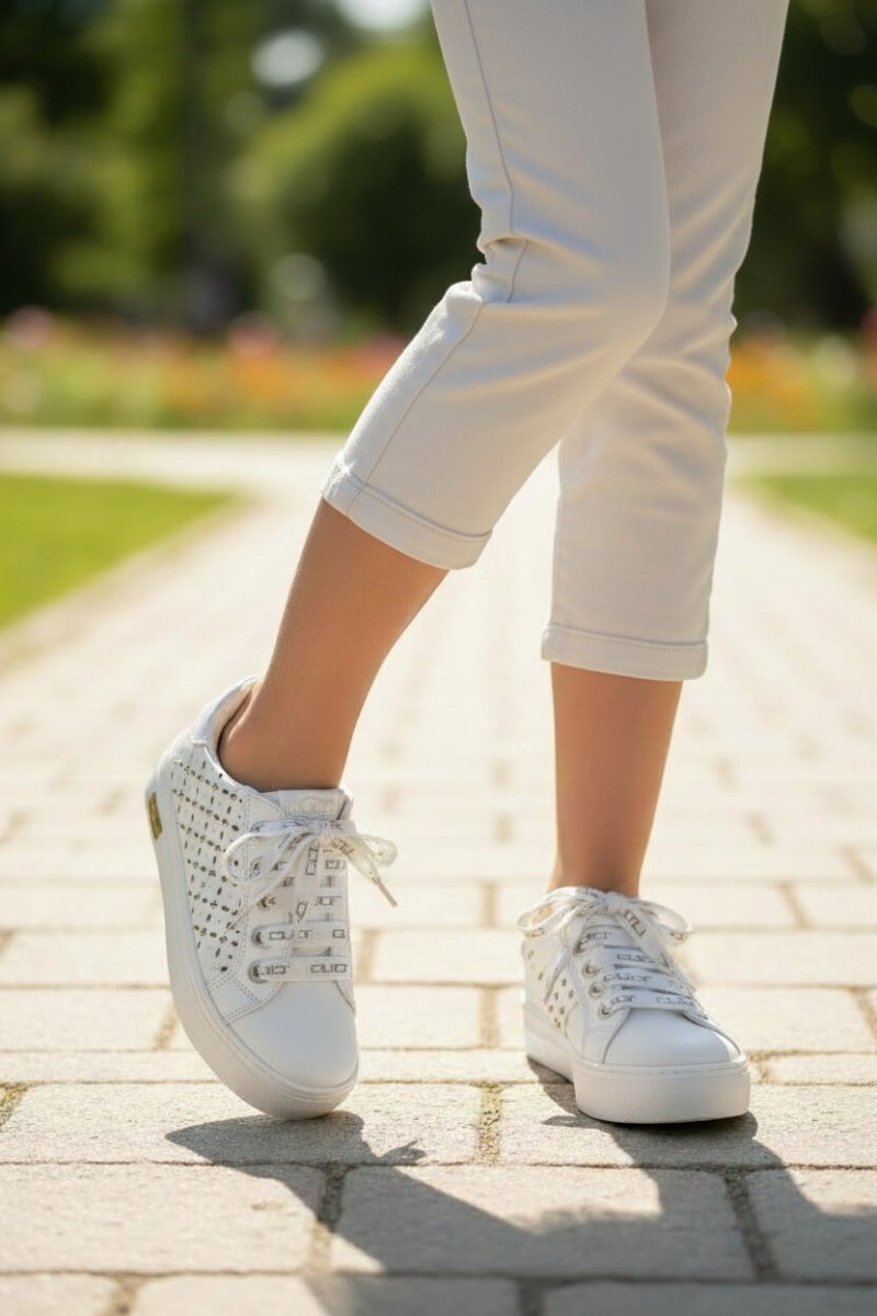 Un modello che esprime personalitร e stile contemporaneo. La tomaia bianca รจ valorizzata da borchie metalliche luminose che donano un tocco glam, mentre i traforati laterali creano un elegante effetto decorativo e assicurano maggiore traspirabilitร .