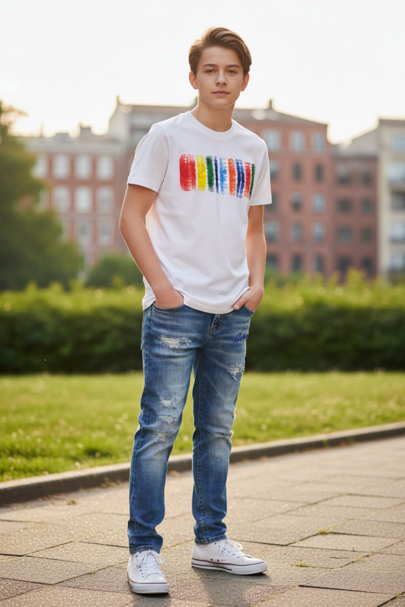 La t-shirt G2FIRENZE รจ un capo casual dal design pulito ma vivace, caratterizzato da una grafica colorata che dona energia e originalitร al look. โSul petto รจ presente una grafica composta da una serie di pennellate verticali colorate. โIl contrasto tra il bianco pulito della maglia e le pennellate multicolor rende il capo fresco e dinamico. Una t-shirt G2FIRENZE bianca con grafica artistica multicolore, pensata per chi cerca un capo casual con un tocco di creativitร e personalitร . โ Composizione: 100% cotone