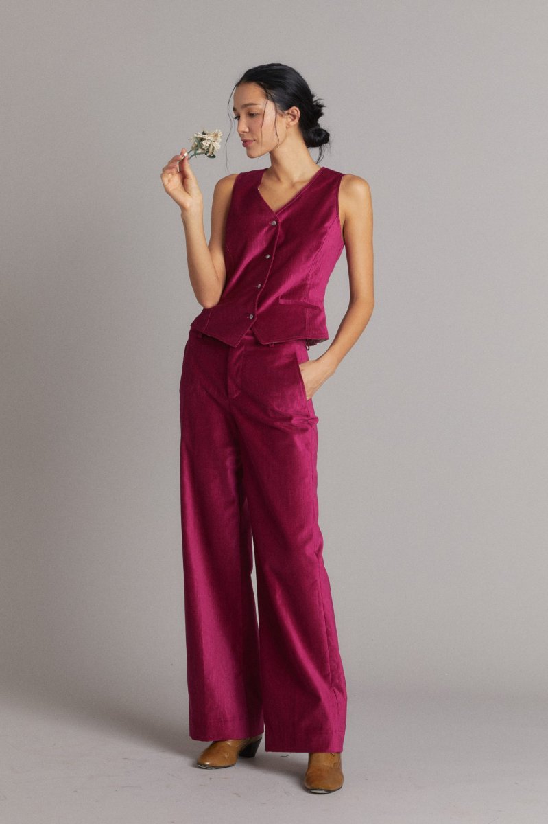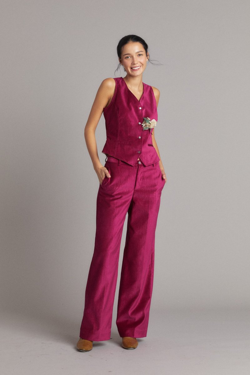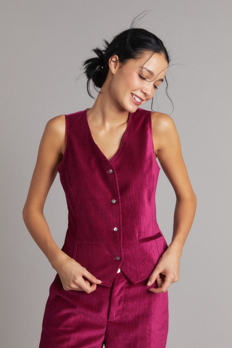 Gilet Annie di Carla Saibene, è un nuovo modello che combina l’eleganza di un pezzo tipico del guardaroba maschile con una linea molto femminile e donante. La versione in velluto di cotone color ciliegia effetto moiré è molto elegante indossato a completo come top ai pantaloni e alla giacca abbinati dello stesso tessuto oppure indossato su una camicia. Vedi altre varianti 100% cotone Made in Italy Scollo a V, abbotonatura centrale con bottoni in madreperla Foderato in viscosa Vestibilità regolare, la modella indossa una taglia 40