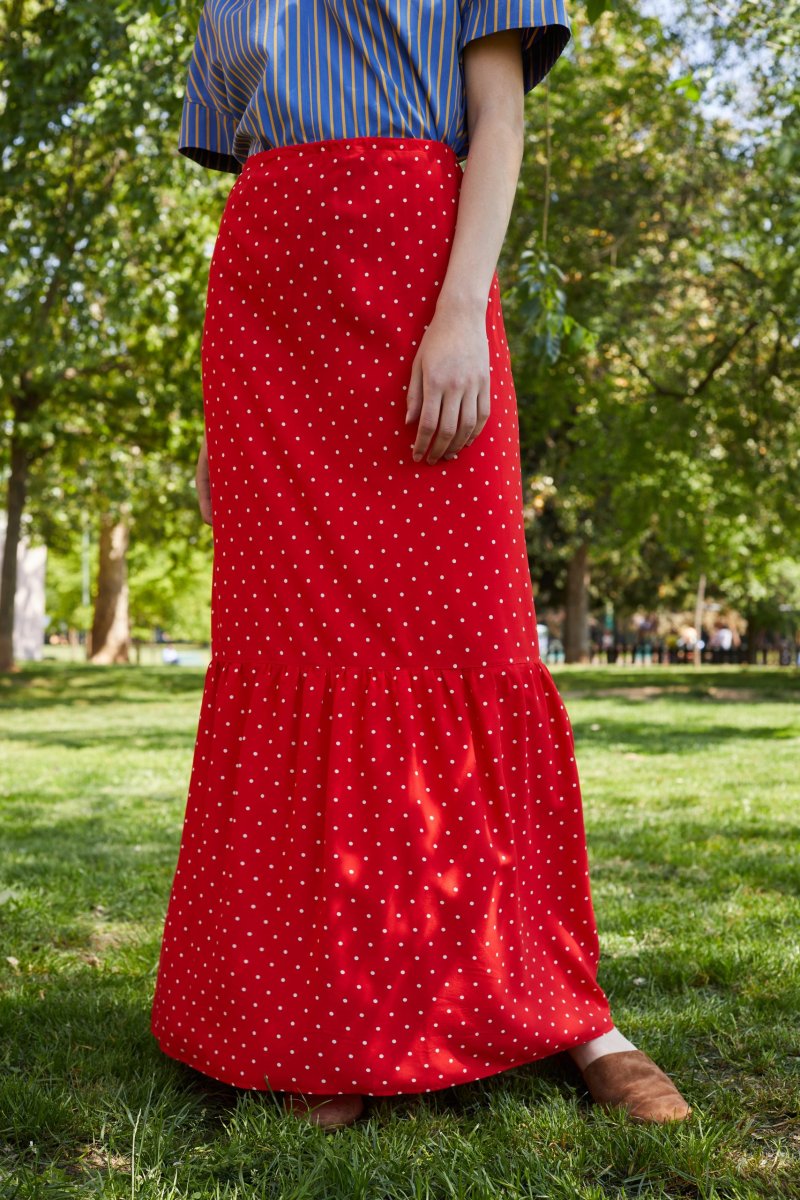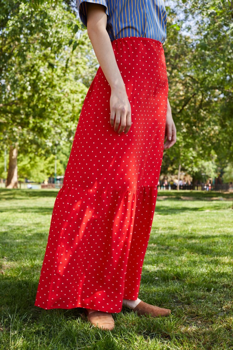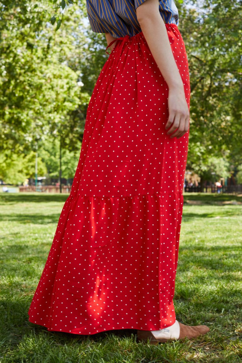 Gonna Calypso di Carla Saibene, lunga con balza e coulisse che regola il punto vita e lโarricciatura. Questa gonna in viscosa rossa a pois bianchi ha un movimento fluido e sensuale molto donante. Gioca con i pattern geometrici e indossala con un top blu a righe gialle. Vedi altre varianti 100% viscosa Made in Italy Vestibilitร morbida: Aina รจ alta 177 cm Taglia unica, vita con coulisse regolabile Esiste in altri tessuti e varianti