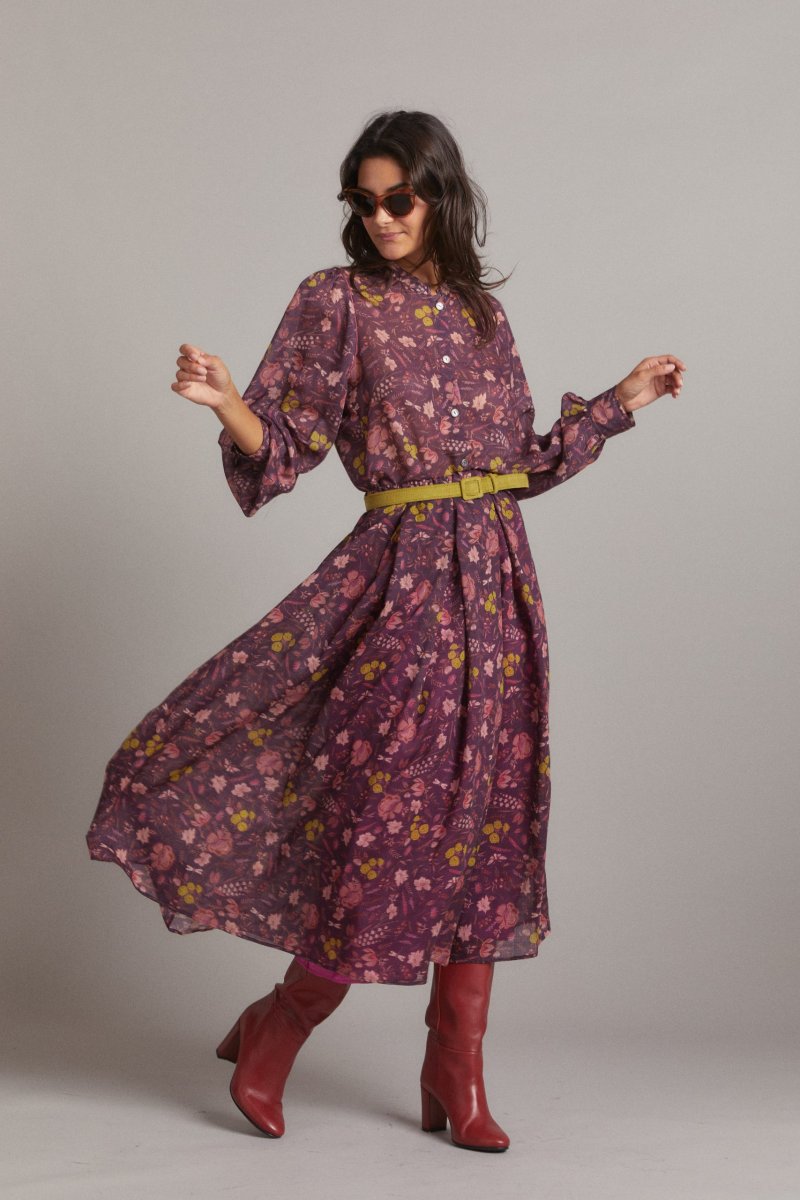 Gonna Greta di Carla Saibene in garza di lana prugna stampata a fiori giallo senape e rosa antico, con sfondi piega ed elastico in vita nascosto. Questo modello ha un movimento molto fluido e donante, perfetta sia con i tacchi che con scarpe piatte. Vedi altre varianti 100% lana Made in Italy vestibilitร morbida: la modella indossa una S Fodera in viscosa fucsia Lunghezza al polpaccio