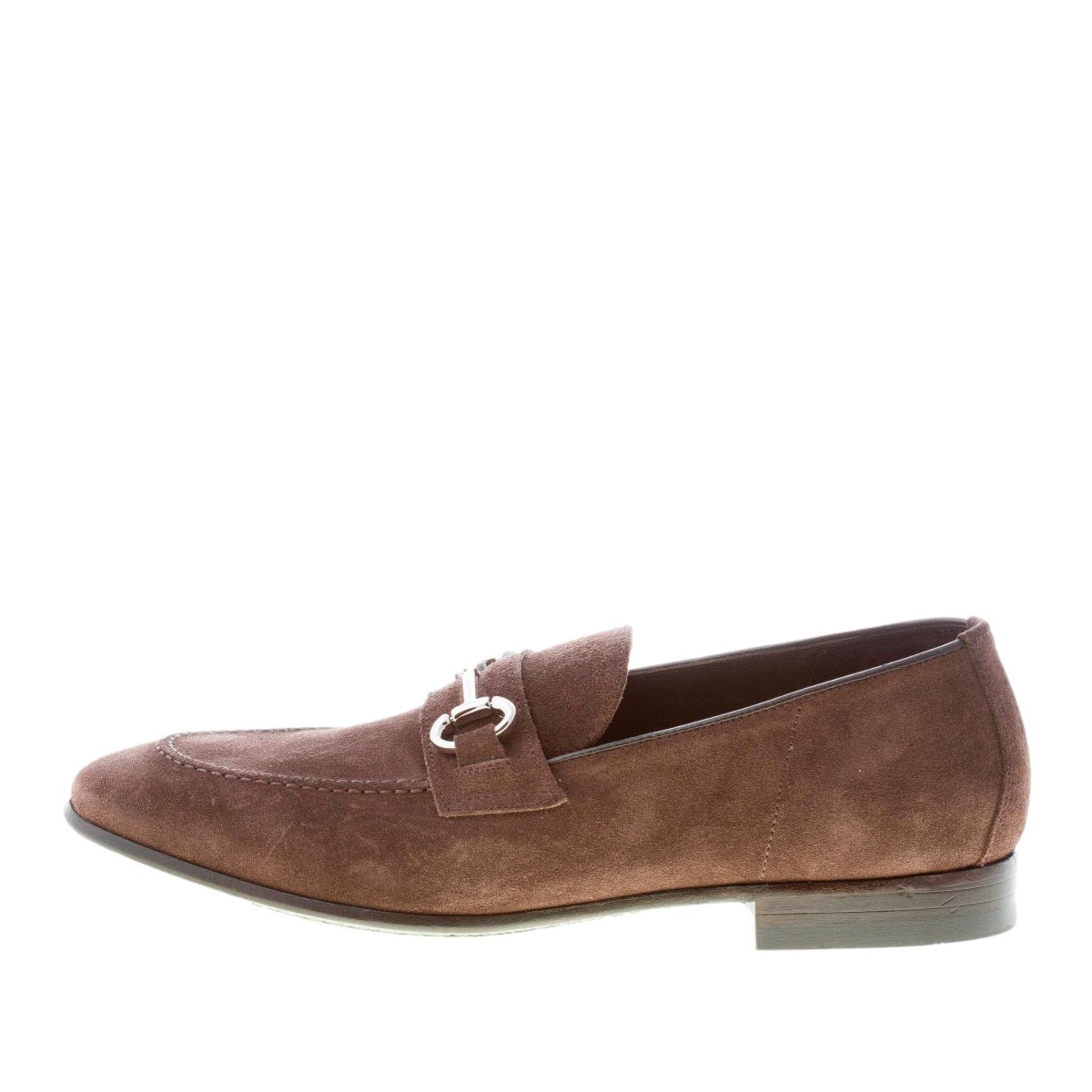 Dark brown suede loafer with a front classic bar and silver metal horsebit. Handmade in Italy. “Apron toe” style stitching at the almond toe. Leather sole