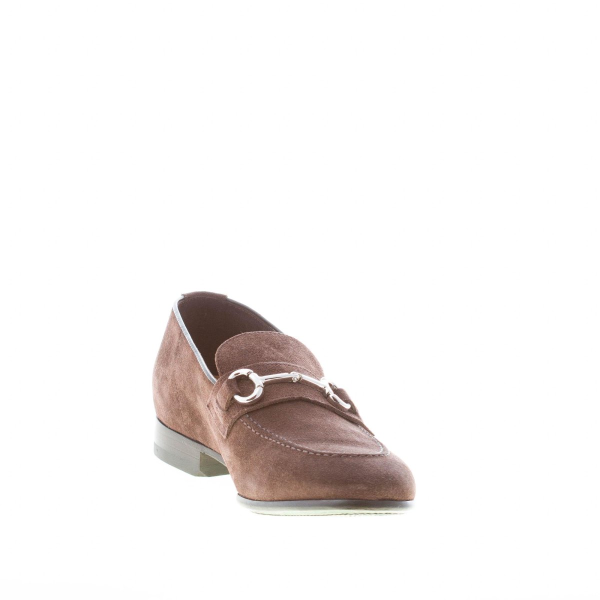 Mocassino artigianale fatto a mano in camoscio testa di moro con fascetta e il classico morsetto in metallo argento. Cucitura a vaschetta sulla punta a mandorla. Suola in cuoio